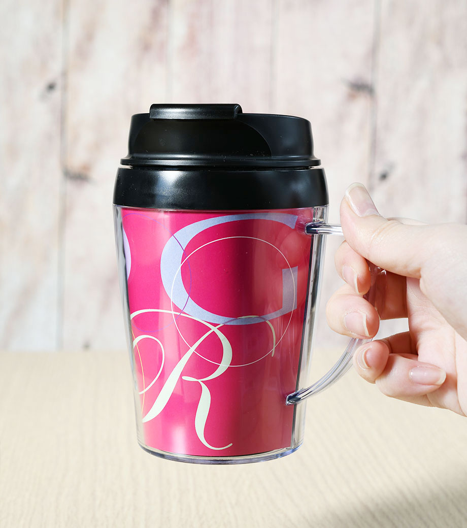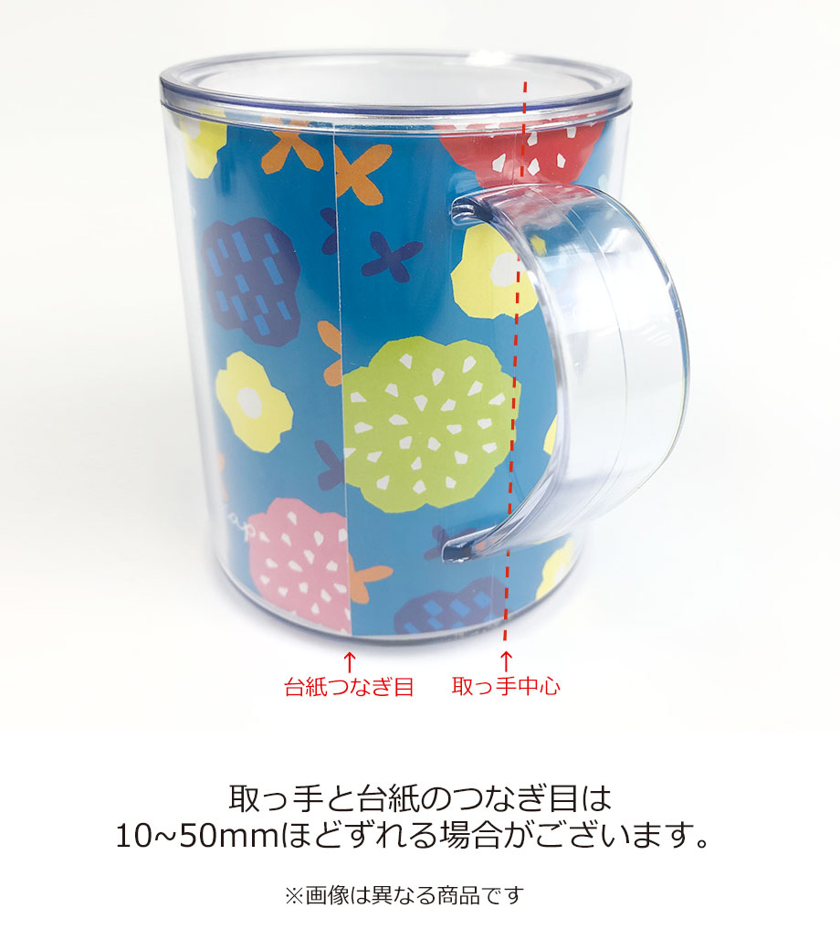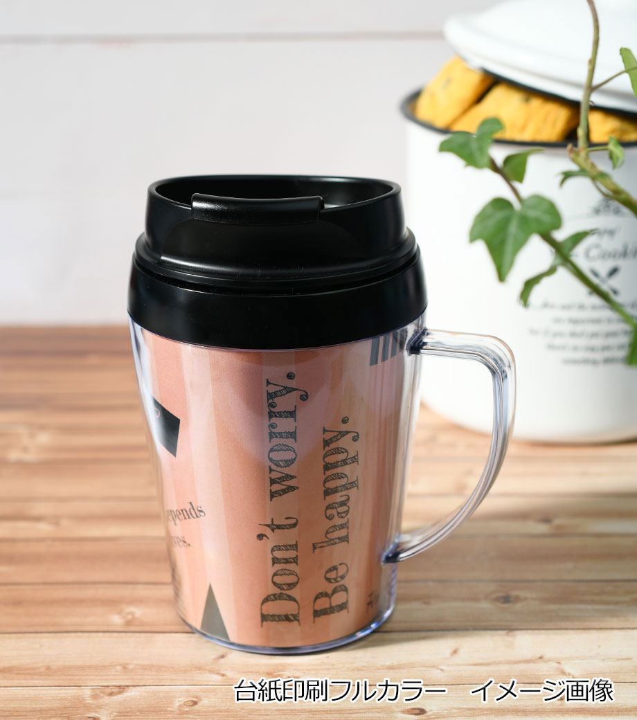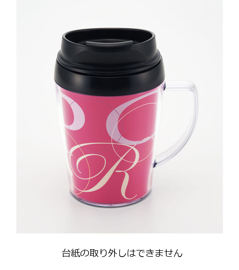 底面の滑り止めや、保冷温効果のある2重構造など、細かい所までこだわっています。そのままでもおしゃれな形状なので台紙を入れただけで簡単にクオリティの高いアイテムが仕上がります。取っ手の中心と中台紙のつなぎ目はずれる場合があるため、オリジナル台紙を作成する際は、中心が分かりにくいリピート柄がおすすめです。企業ロゴを入れてキャンペーン等のPRや、写真を入れた記念品にもおすすめです。