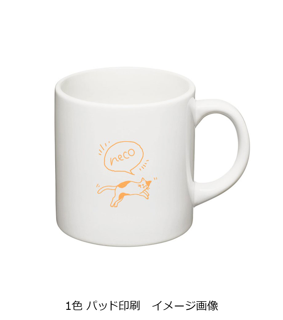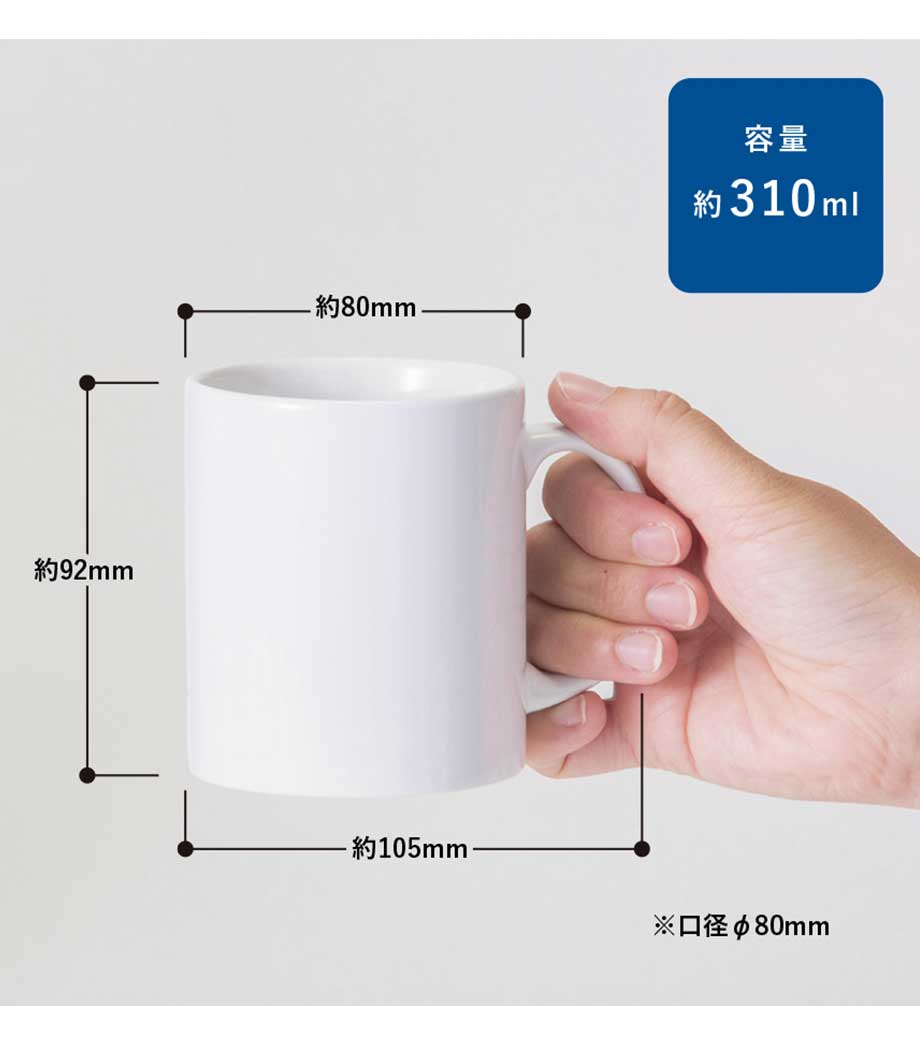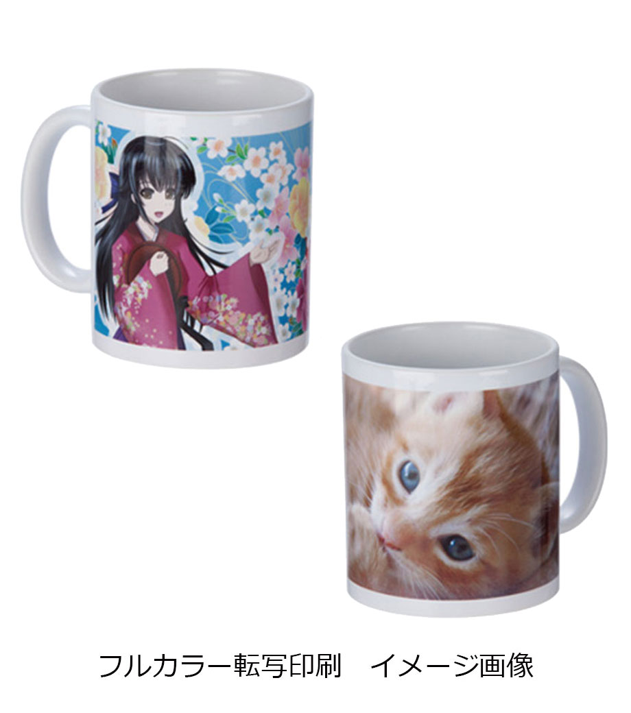 小ロット(30個~)から作れる!写真を印刷した卒業記念品や、イラストを印刷した同人グッズ制作にイチオシの陶器製マグカップ。容量は普段使いに最適な350mlです。