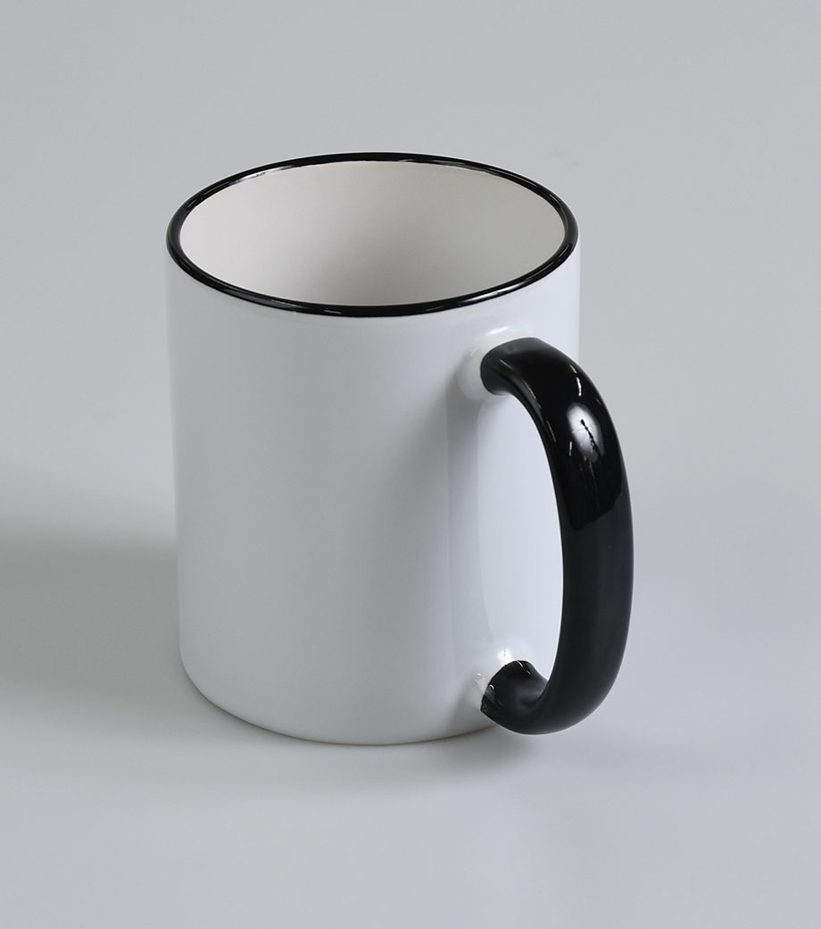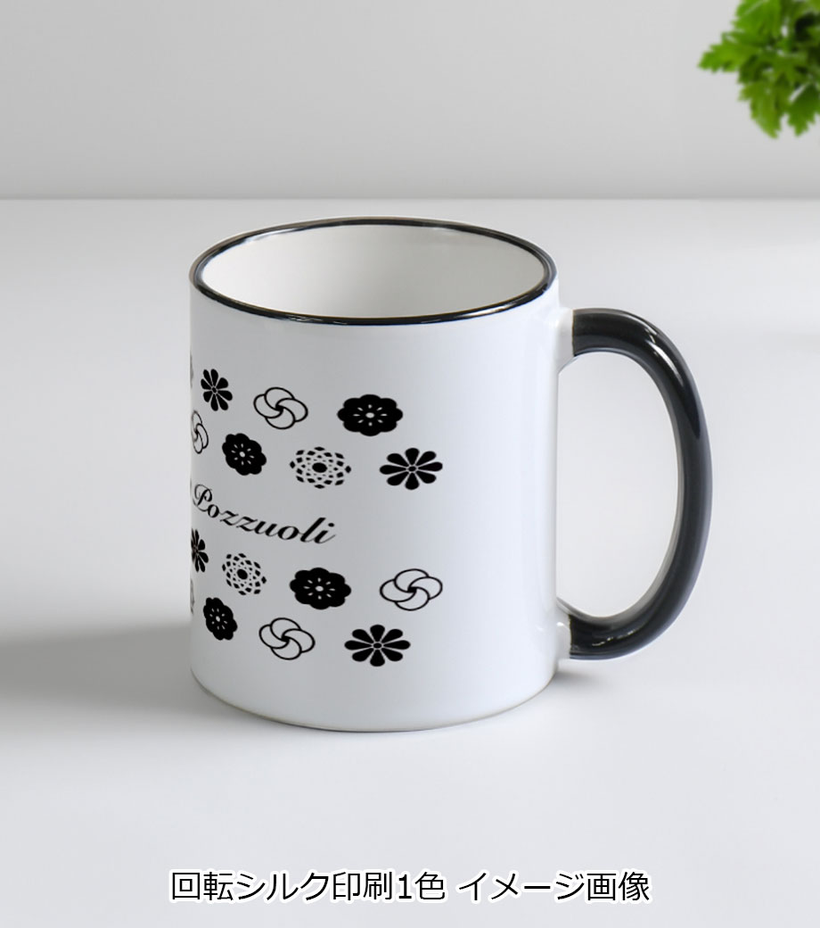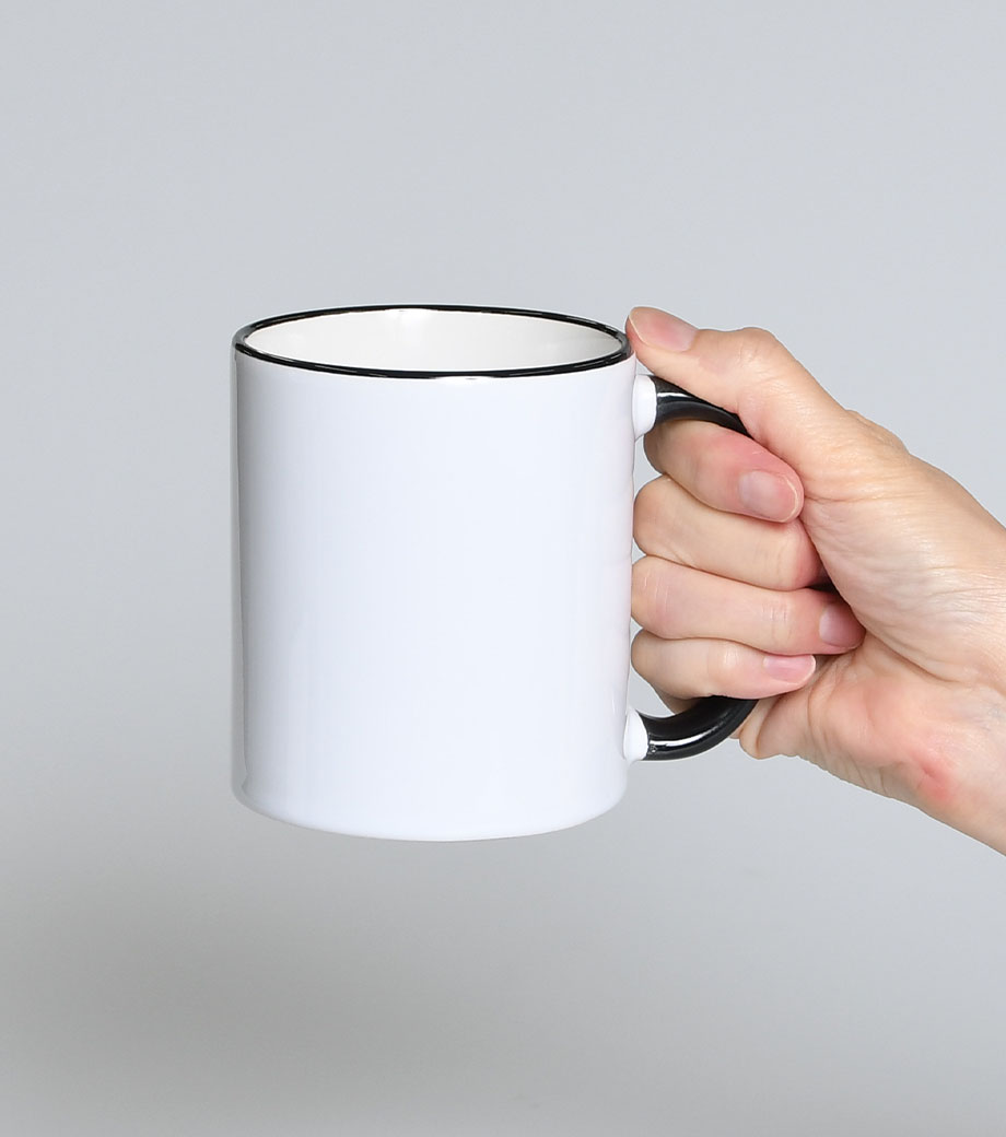 取っ手と飲み口周りが黒でカラーリングされています。モノクロのバイカラーに合わせたデザインで印刷してもおしゃれですよ。物販用にも対応できる白箱入りです。