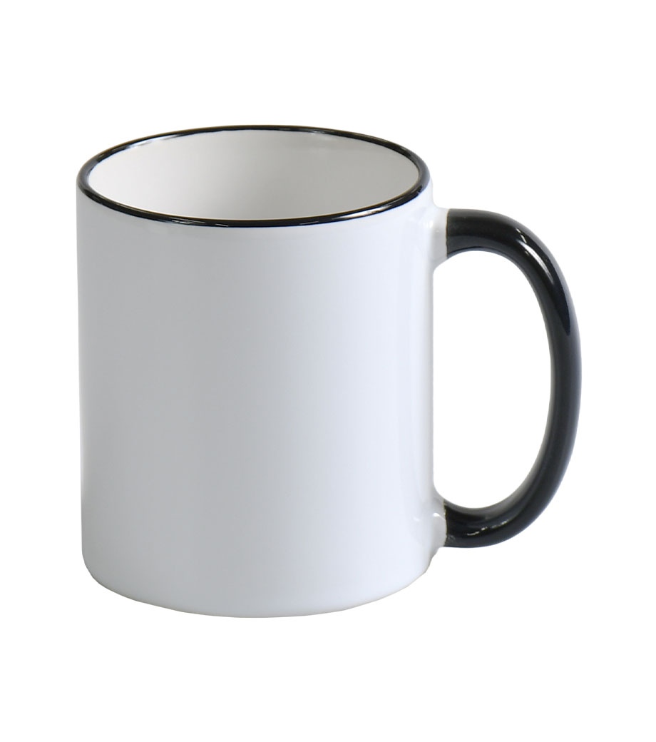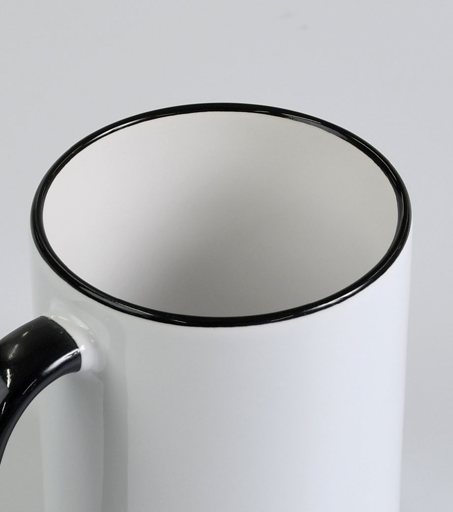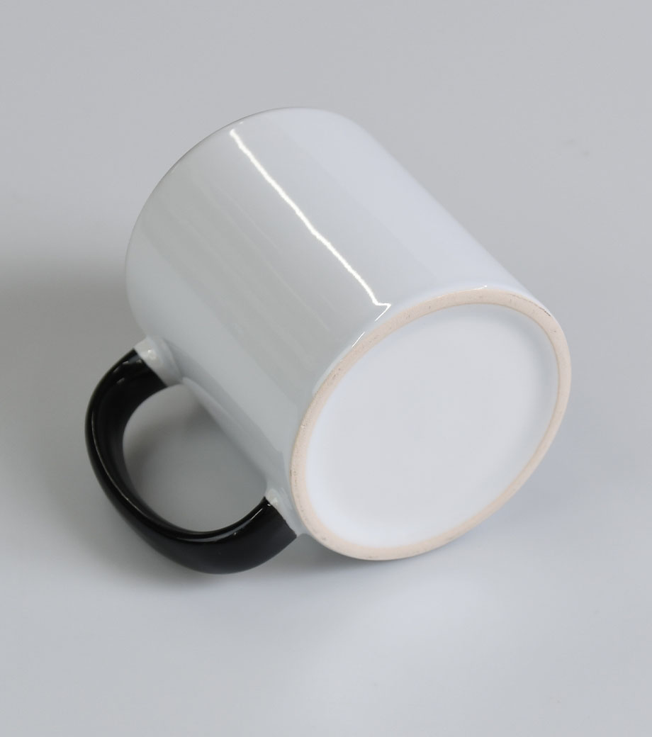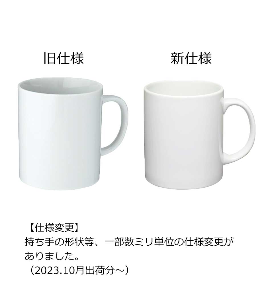 取っ手と飲み口周りが黒でカラーリングされています。モノクロのバイカラーに合わせたデザインで印刷してもおしゃれですよ。物販用にも対応できる白箱入りです。