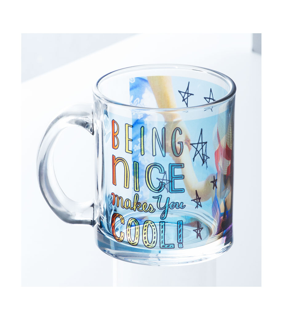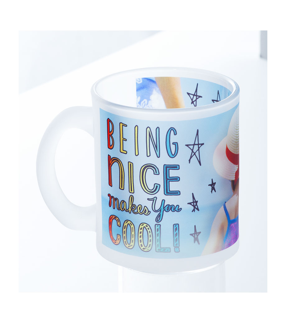 昇華転写印刷だからフルカラーの名入れはもちろん、写真やグラデーションも再現可能。半透明のガラスを活かして、真っ白な陶器製マグとは違ったデザインに仕上げられます。
