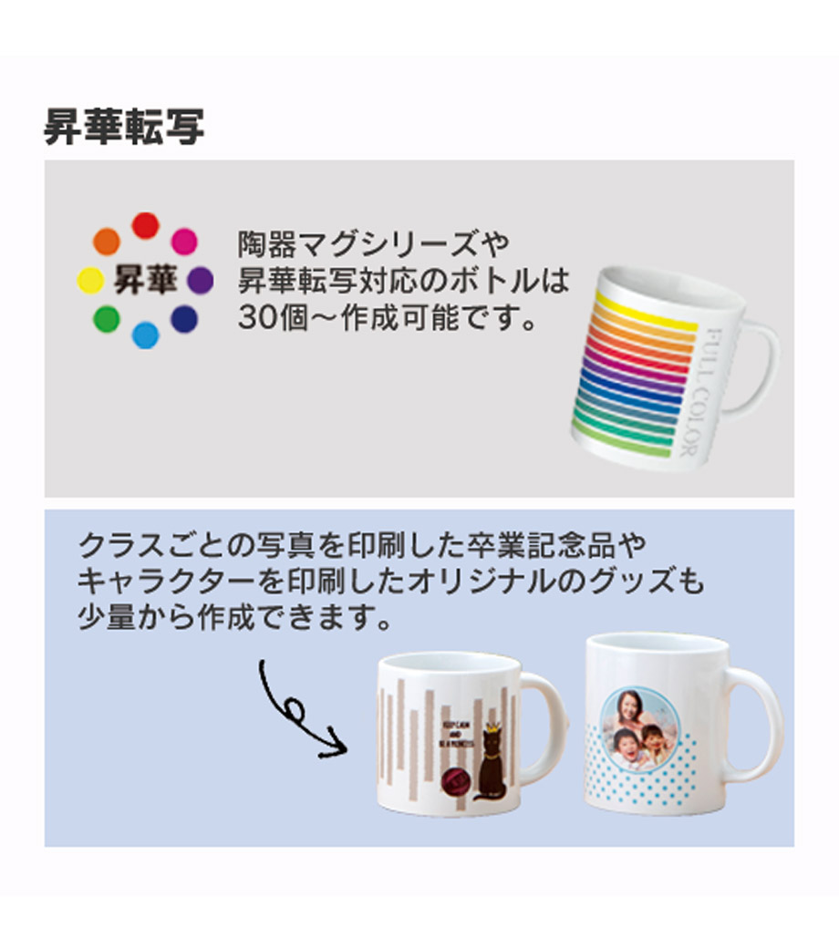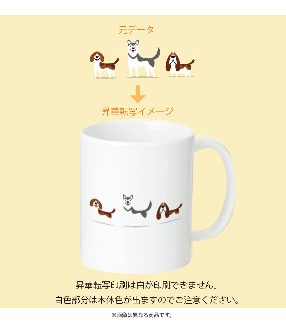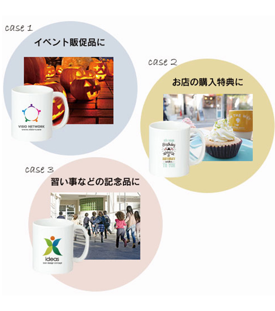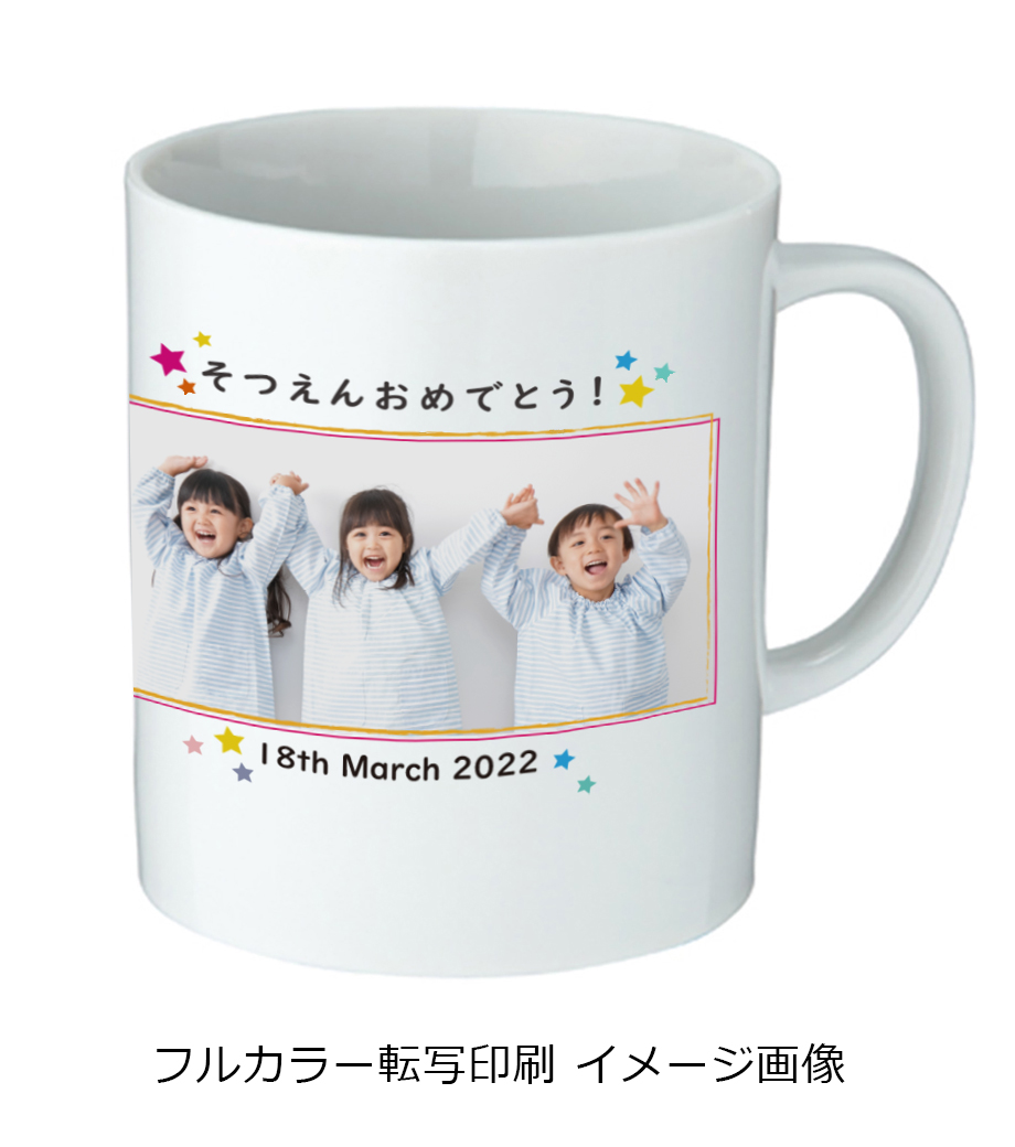 フルカラー印刷対応なのでロゴやイラストのほか、写真、グラデーションも再現可能!オリジナルマグカップを作成できます。イベントグッズやキャンペーン、卒園記念や周年記念品など幅広いシーンで選ばれます。