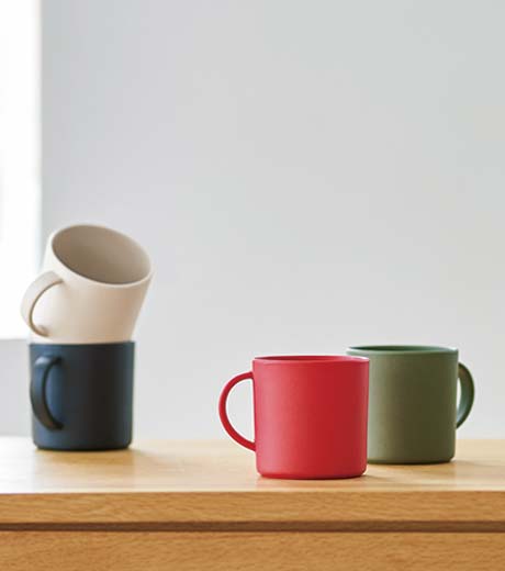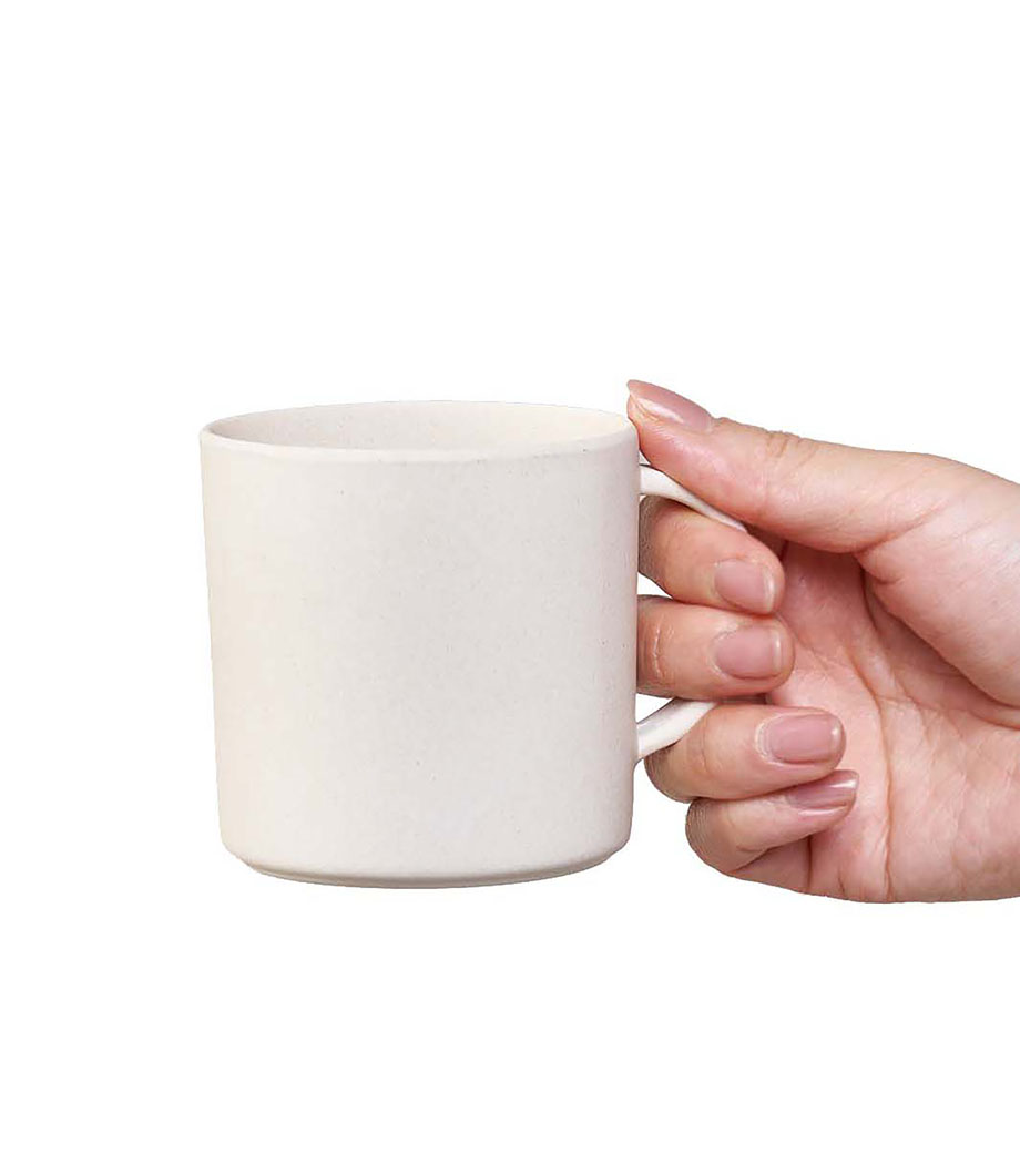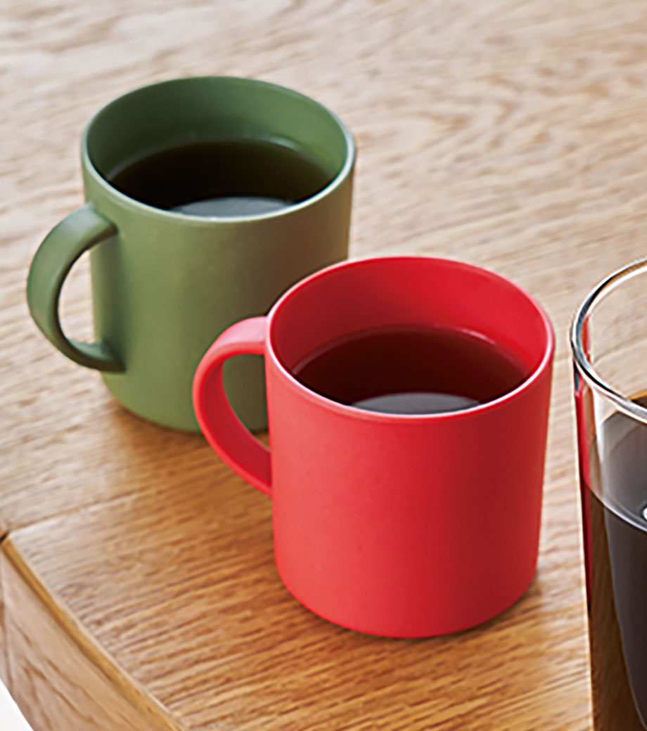 バンブーマグカップは、自然由来のバンブーファイバーを使用したタンブラー。バンブーファイバーとは、竹の繊維をパウダー状にして樹脂で固めたもの。表面がざらざらとしているのが特徴です。自然素材の竹を混ぜ込むことで合成樹脂の使用量を減らした、環境に優しい今注目の素材です!