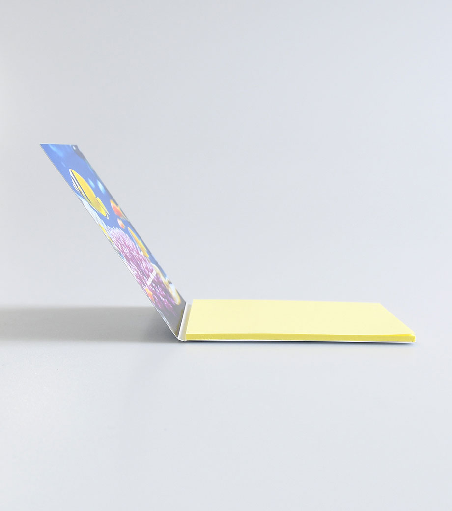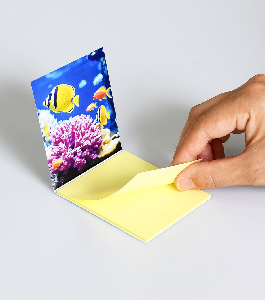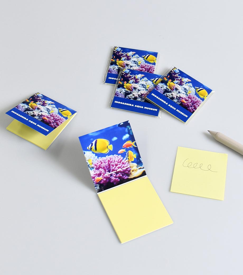 付箋にフルカラーでお好きなデザインを印刷できます。お手頃価格でオリジナルグッズを作成したい方におすすめです。オーソドックスなスクエア形状で印刷範囲が広く、イラストやロゴデザインなどがよく映えます。