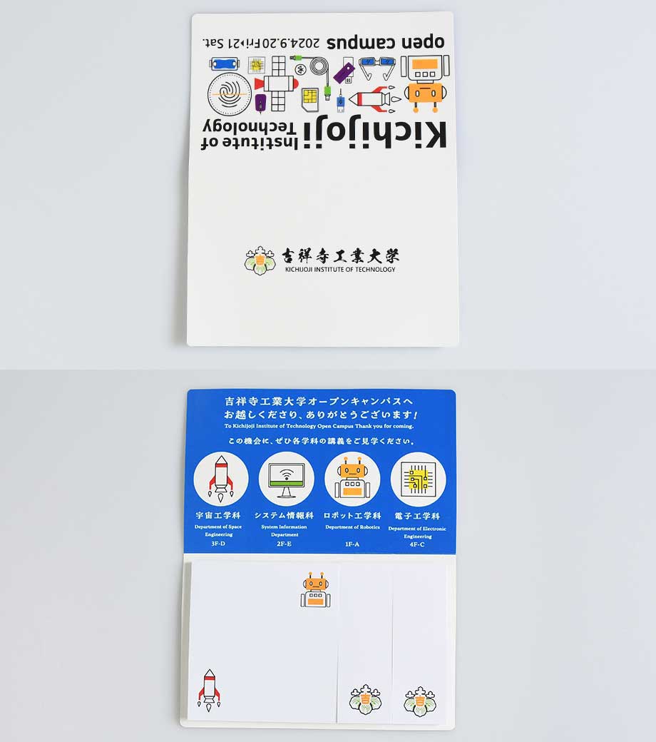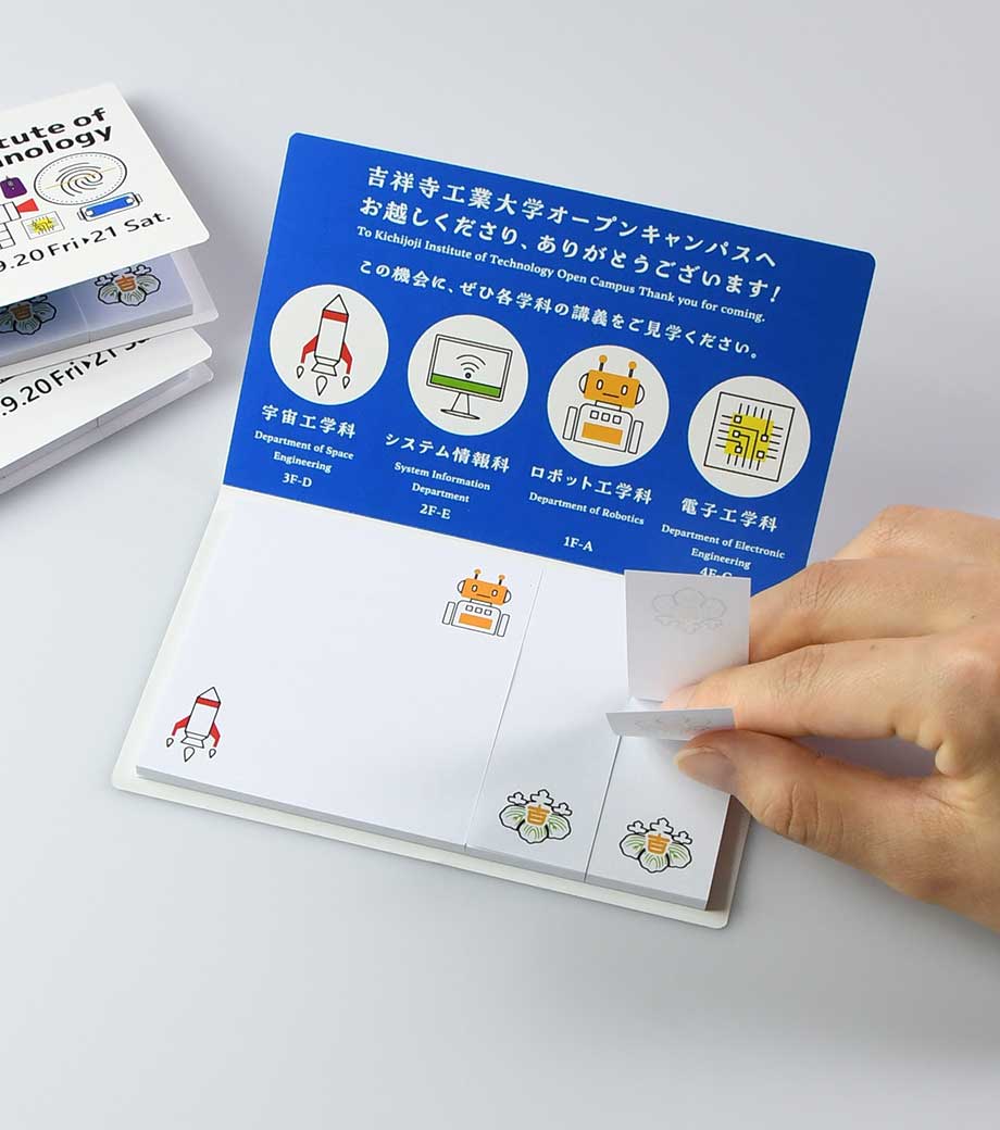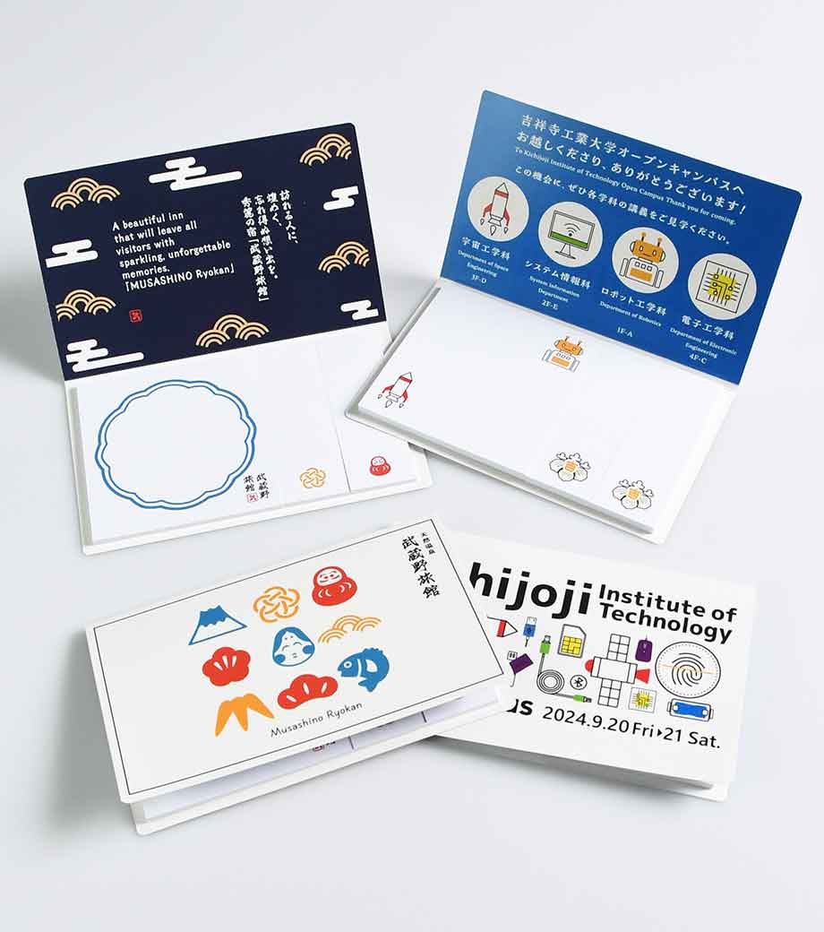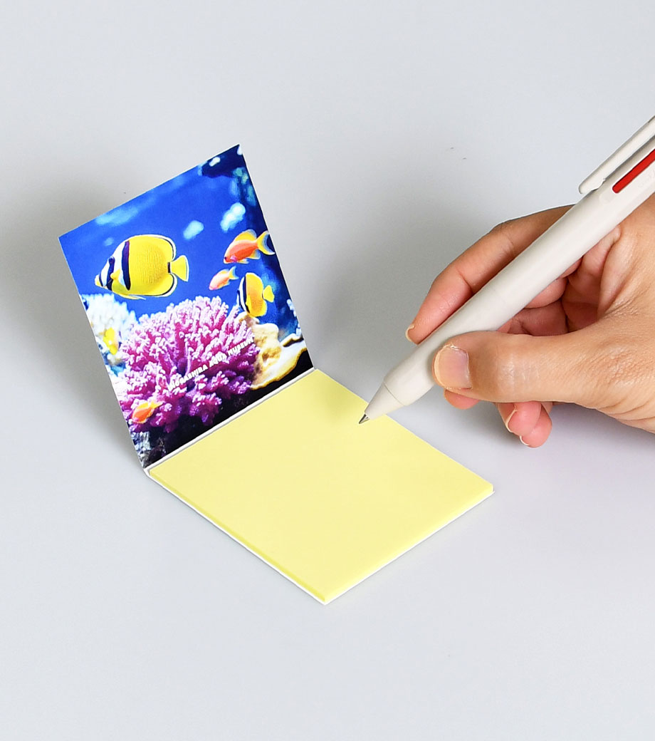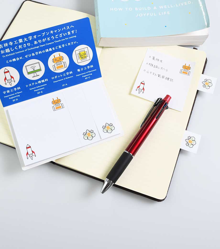 使い勝手のいいスクエア形状の付箋は、オンオフ問わず普段使いに便利。展示会やオープンキャンパスの来場ノベルティ、卒業記念品や施設のオープン記念品など幅広いシーンで配布できます。ポストインできるサイズなので資料などと一緒に気軽に郵送も可能です。