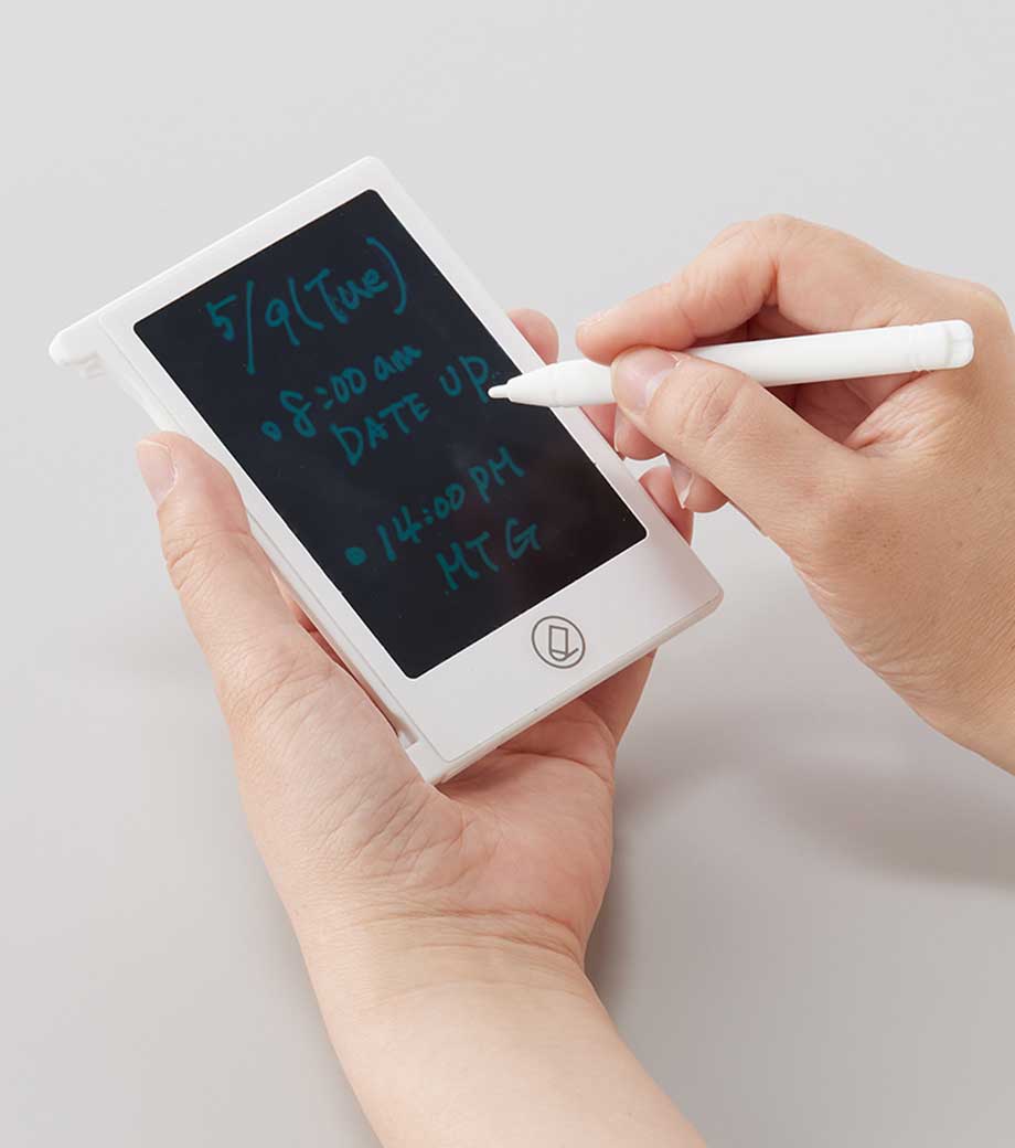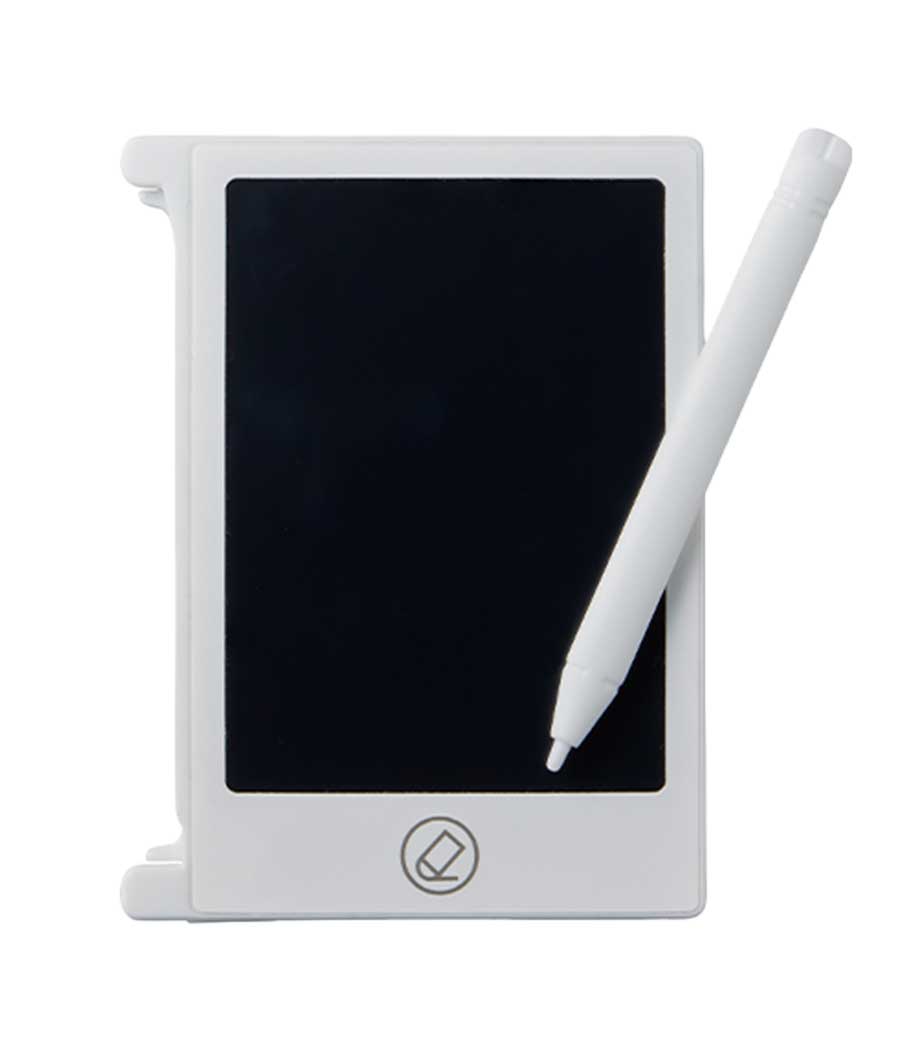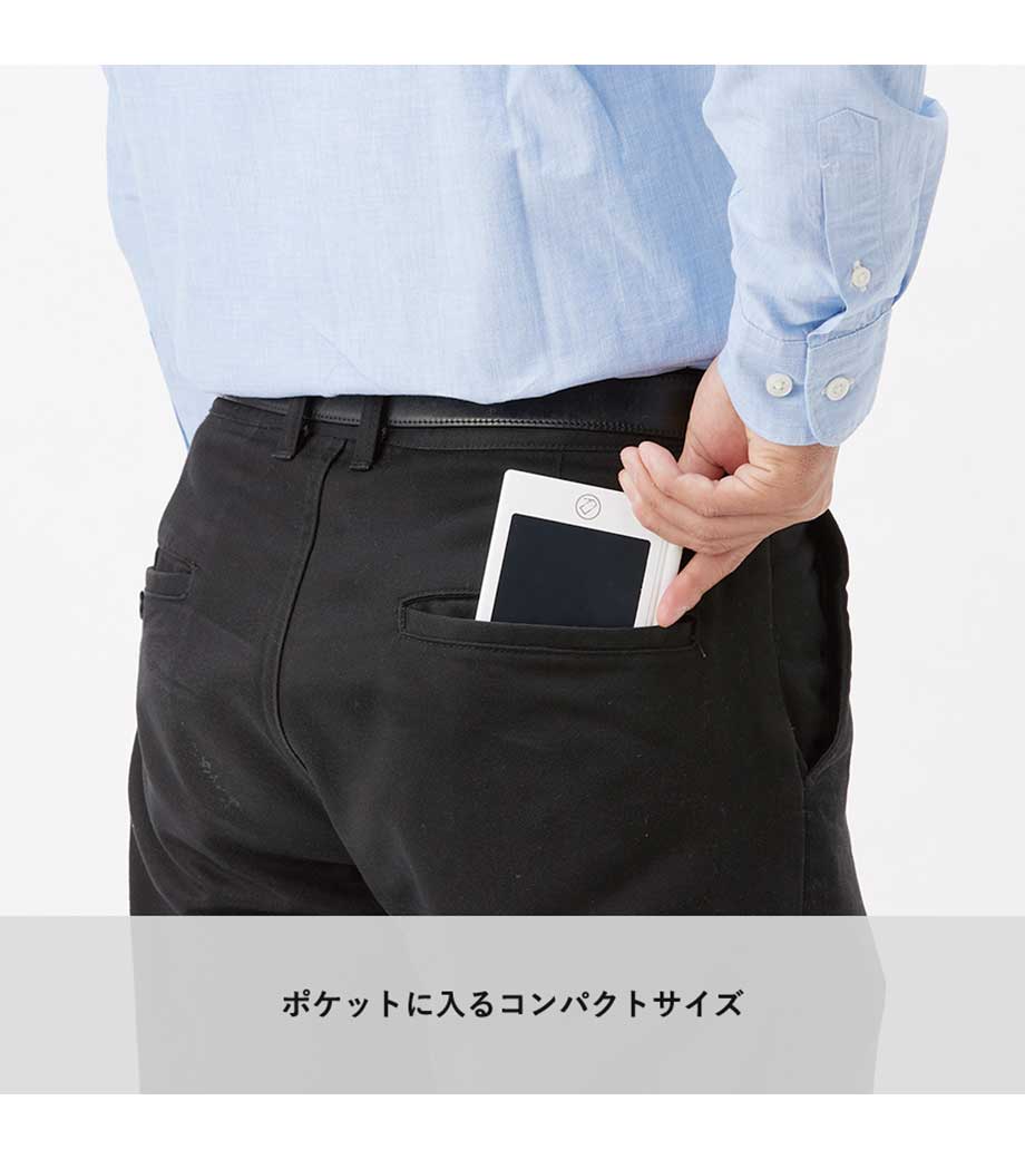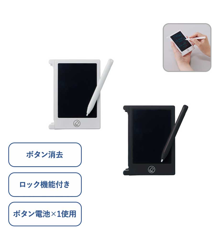電子メモ 4.5インチは、付属のペンで繰り返し書き込め、紙ごみの削減に繋がるエコなメモ帳です。コンパクトなポケットサイズは携帯に便利。出先や急な対応時にさっと出してすぐに書き留めることができます。書いたメモはパッド下部の消しゴムマークを押せば、瞬時に消せます。また、裏面のロックボタンをスライドすると、残したいメモや文章をキープすることができる優れもの。ちょっとした手書きメモに最適です。