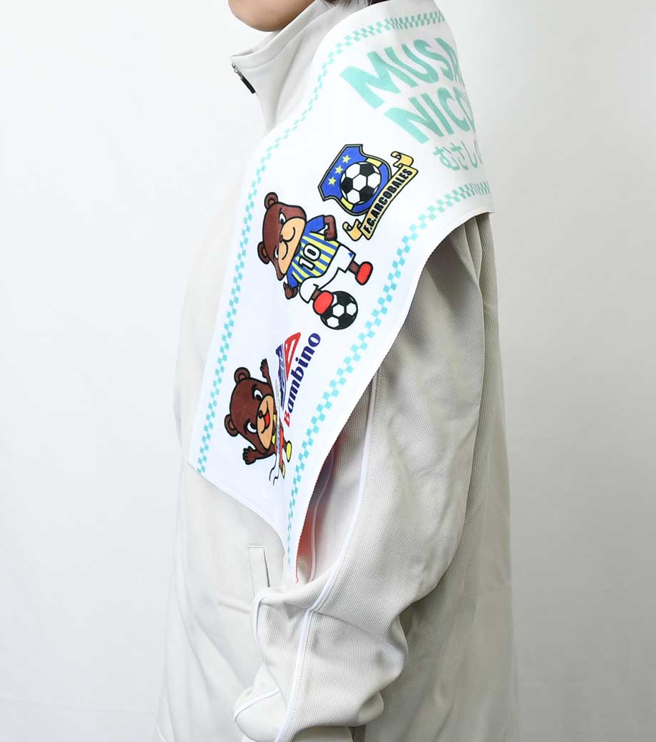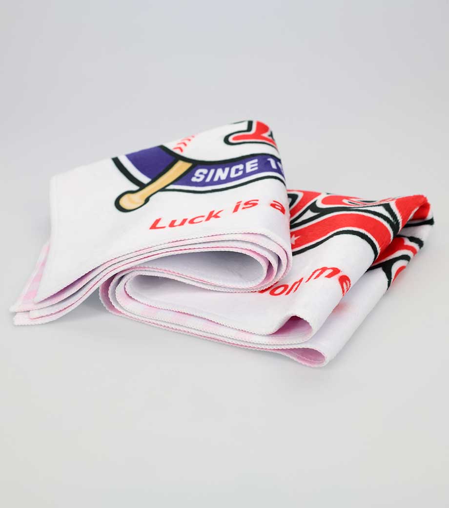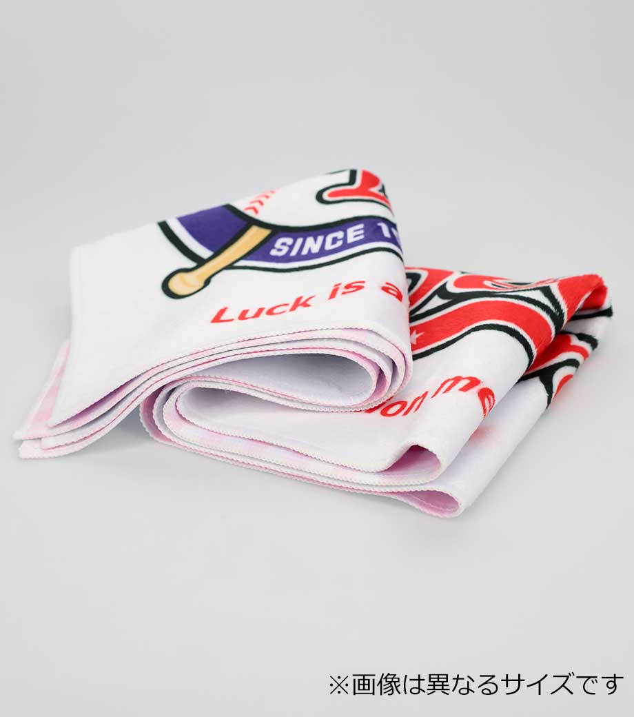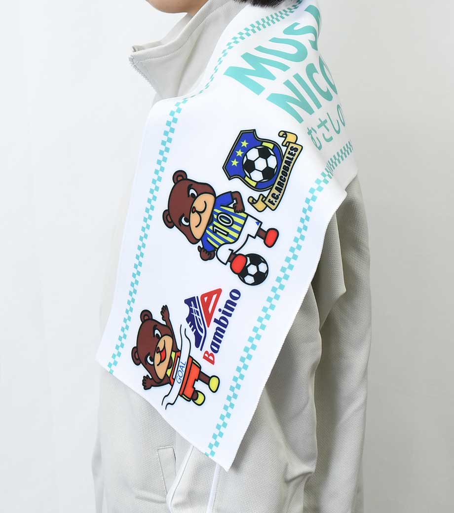 肩に掛けたり、首に巻いたり、マフラータオルは応援グッズの定番アイテム。スポーツチームやライブ・イベントのオリジナルグッズに人気です。表示価格は印刷代込みの格安価格!フルカラーのデザインも1色のデザインも同価格でご対応。1枚からの小ロットでご注文いただけます。