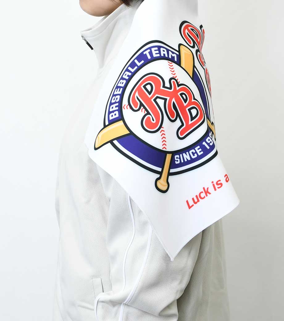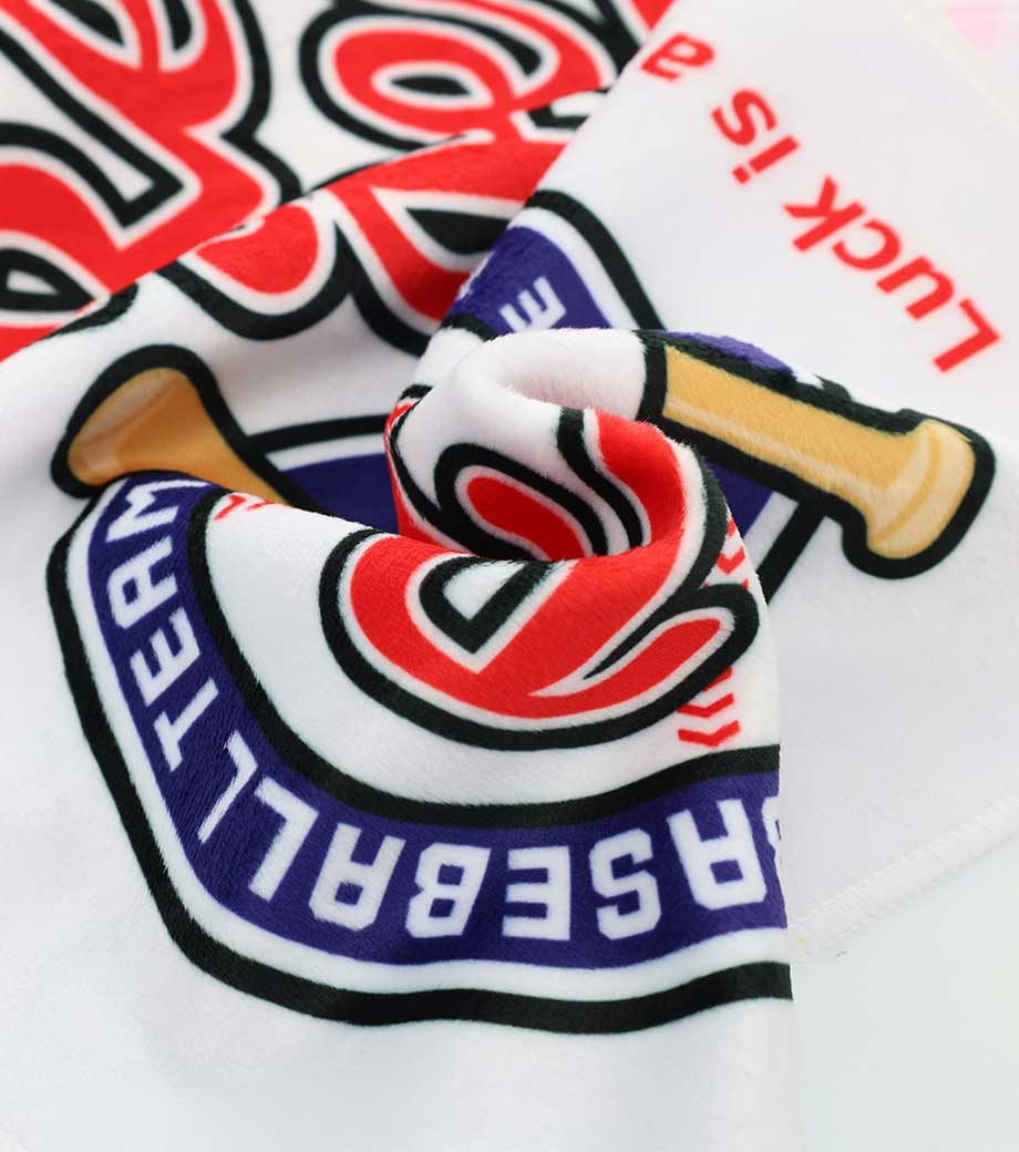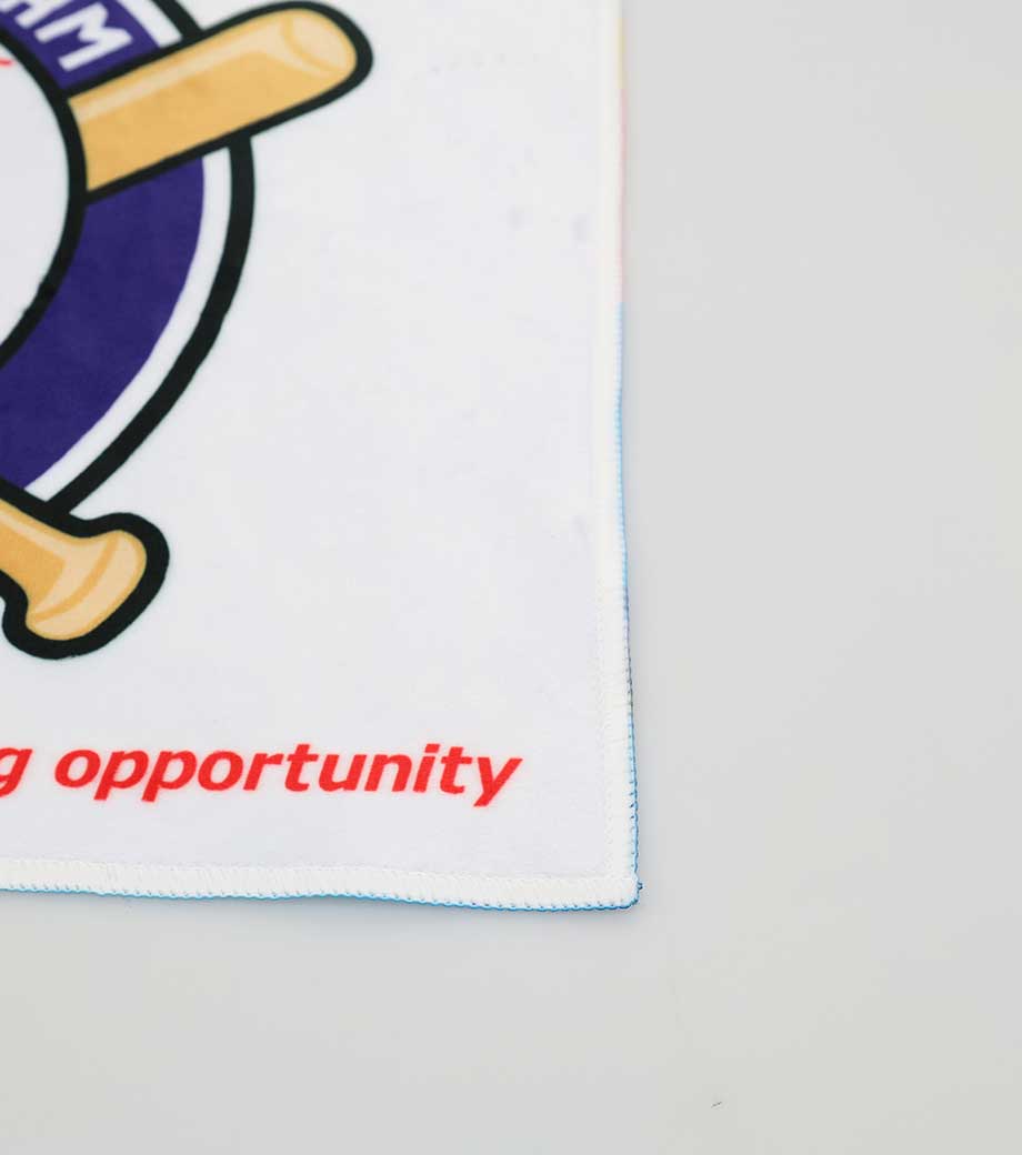 端までフルカラーでプリント可能なマフラータオルです。写真やグラデーションなど複雑なデータも綺麗に印刷可能。かさばりにくい中厚タイプは表面がマイクロファイバー素材、裏面は吸水性のあるコットン素材を使用しています。
