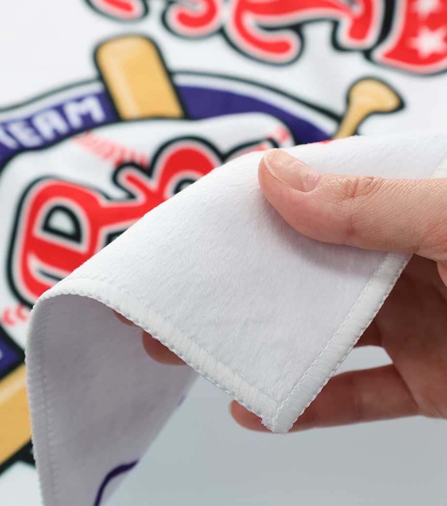 かさばりにくい中厚タイプの表面は印刷が綺麗に仕上がるマイクロファイバー素材。端までプリント可能です。裏面は吸水性のあるコットン素材を使用しています。表示価格は印刷代込みの格安価格!フルカラーのデザインも1色のデザインも同価格でご案内。1枚からご注文いただけます。
