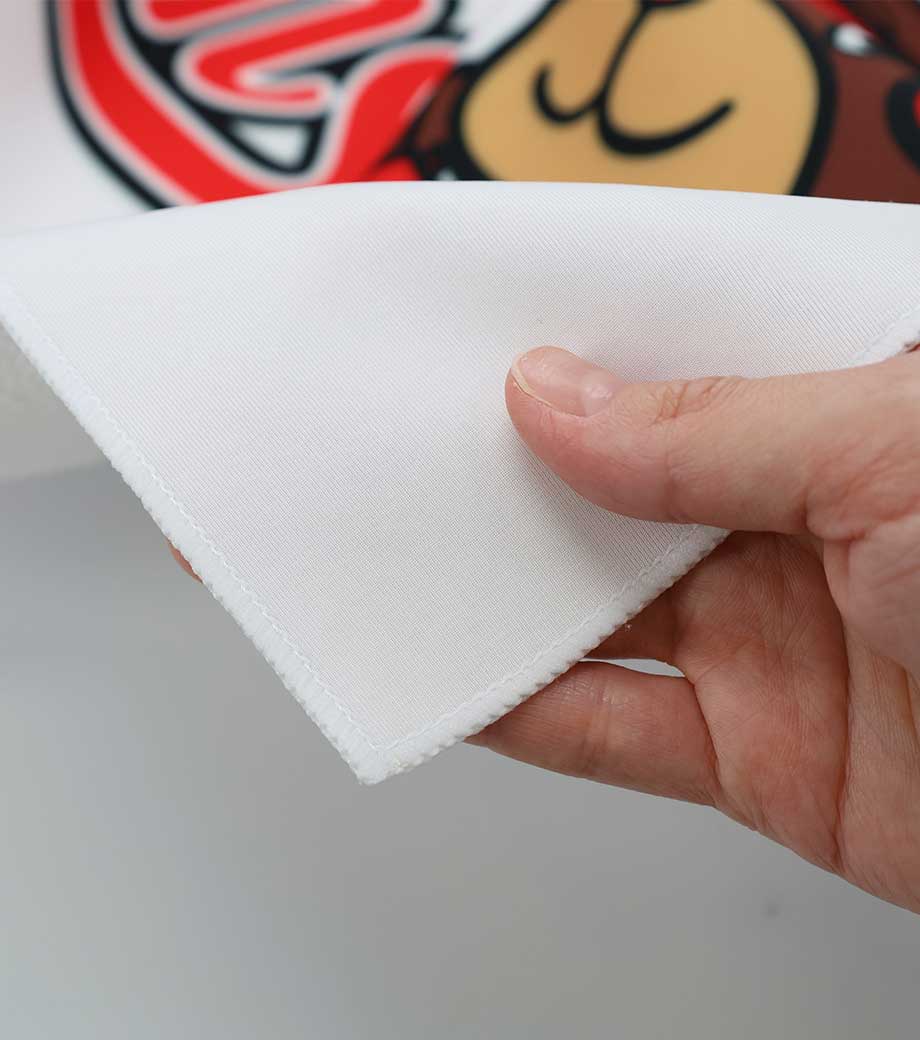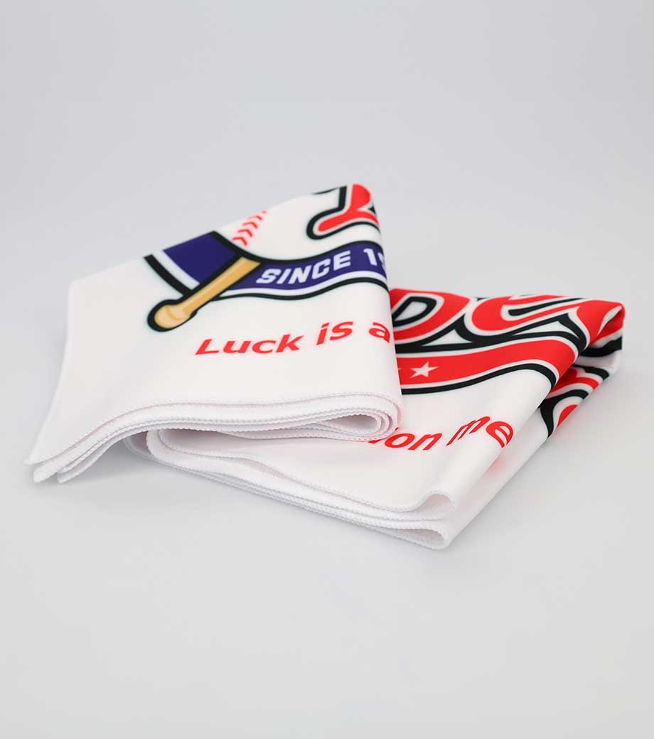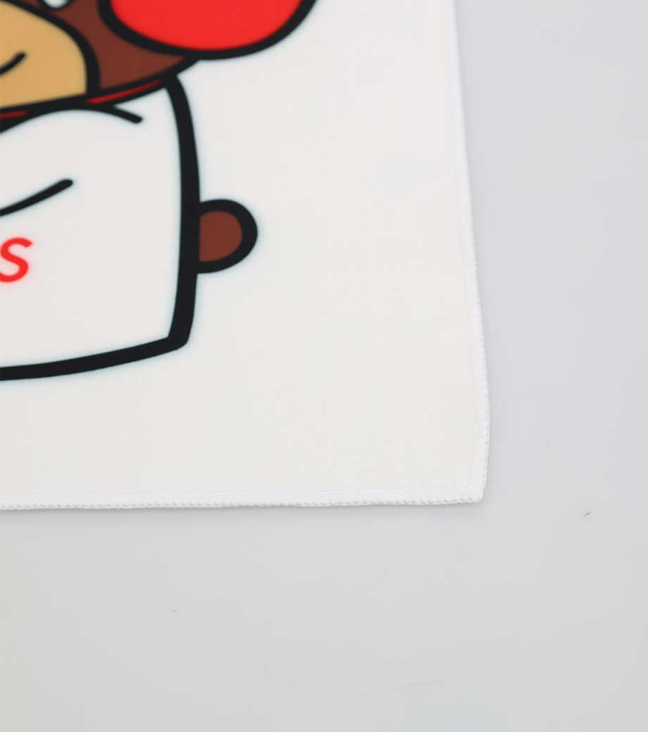表面は印刷が綺麗に仕上がるマイクロファイバー素材で、端までプリント可能。裏面は吸水性のあるコットン素材を使用しているので実用性も抜群です。表示価格は印刷代込みの格安価格!フルカラーのデザインも1色のデザインも同価格でご案内。1枚からご注文いただけます。