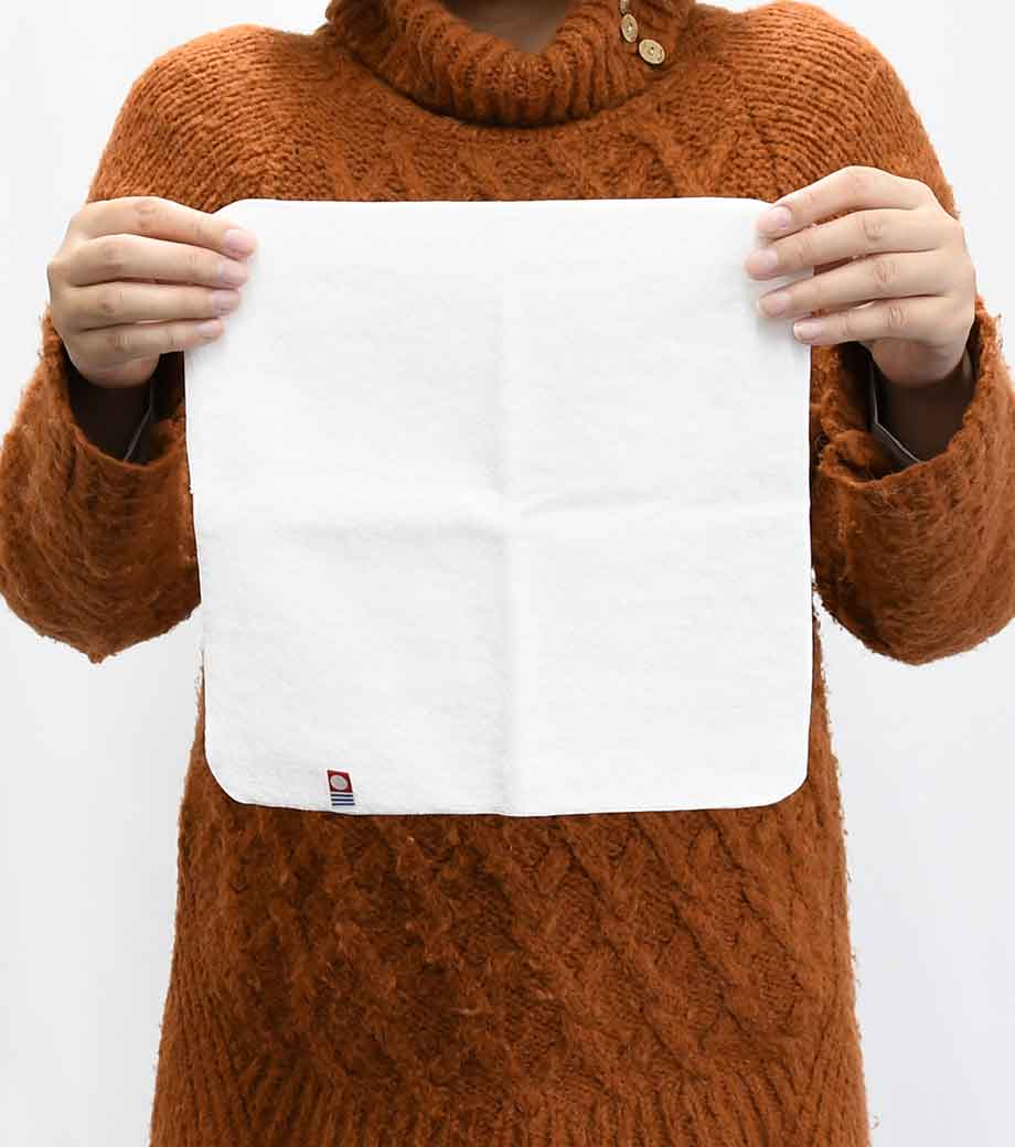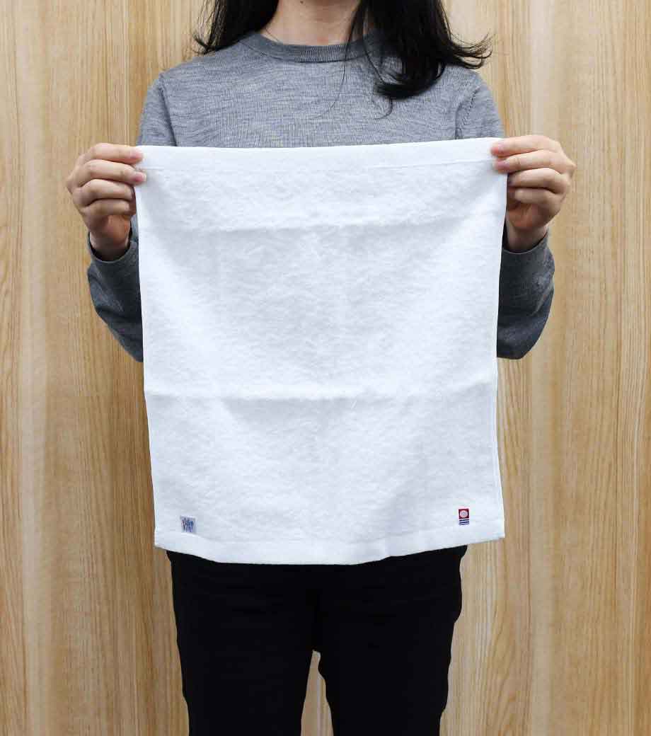 薄手でコンパクトな長方形の今治ハンドタオルです。2つ折りにしてもかさばらないので、スーツのポケットにスッキリ入ります。