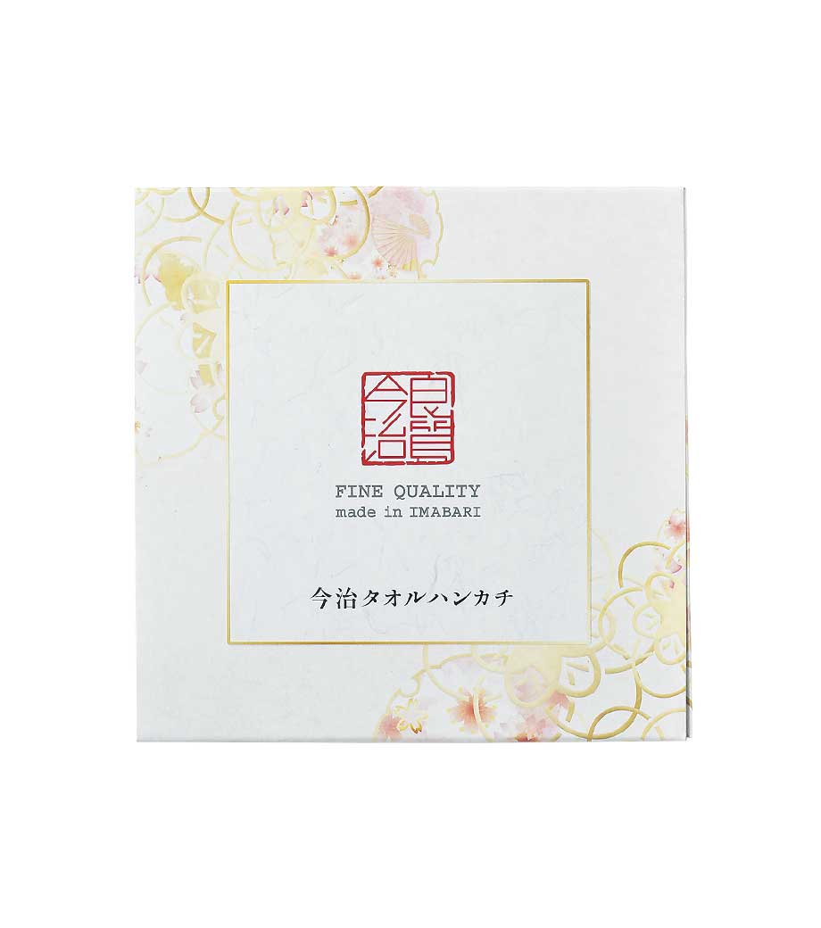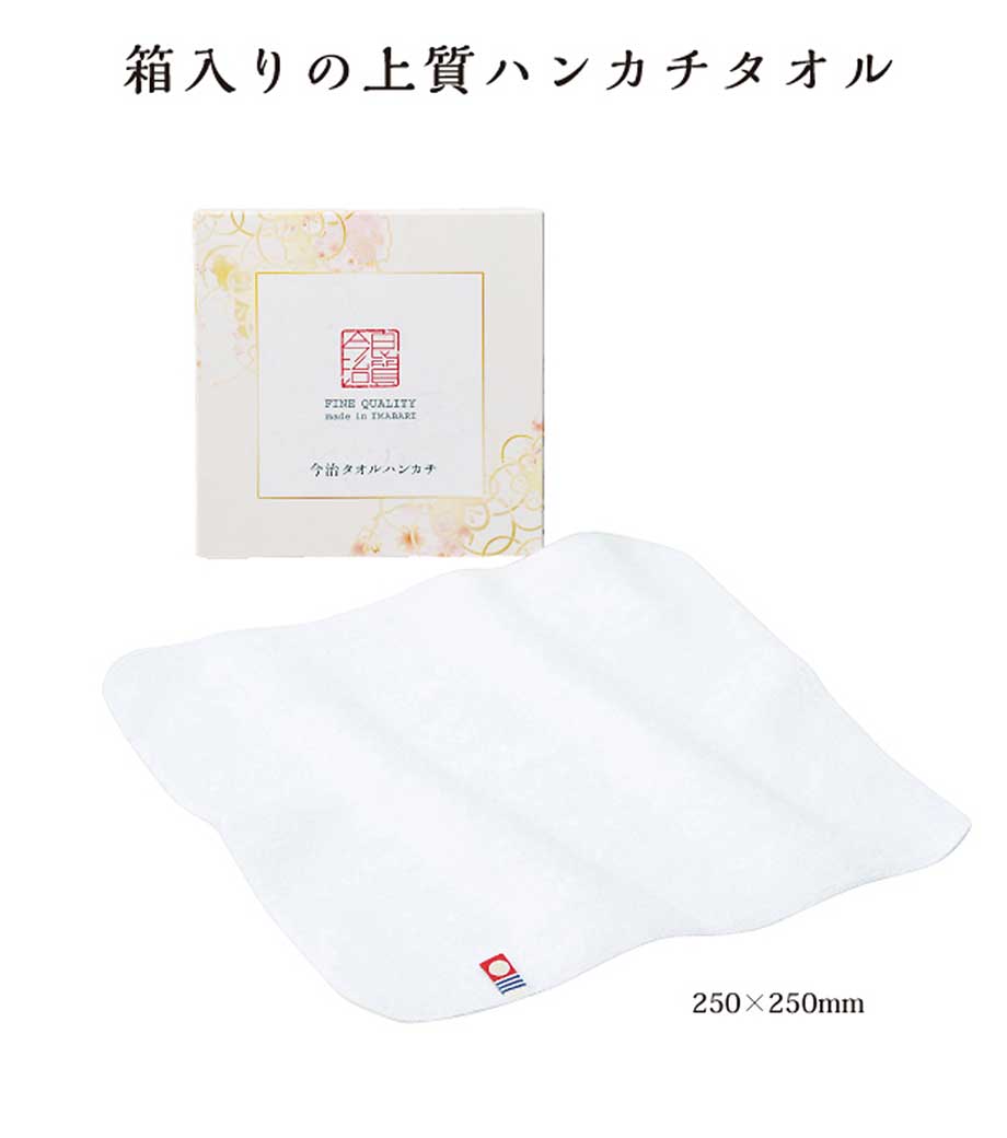 シャーリング生地で柔らかい手触りが特徴。薄型の四角いデザイン箱に入れてお届けするので、お客様にそのままお渡しできます。挨拶回りにピッタリの今治タオルノベルティです。