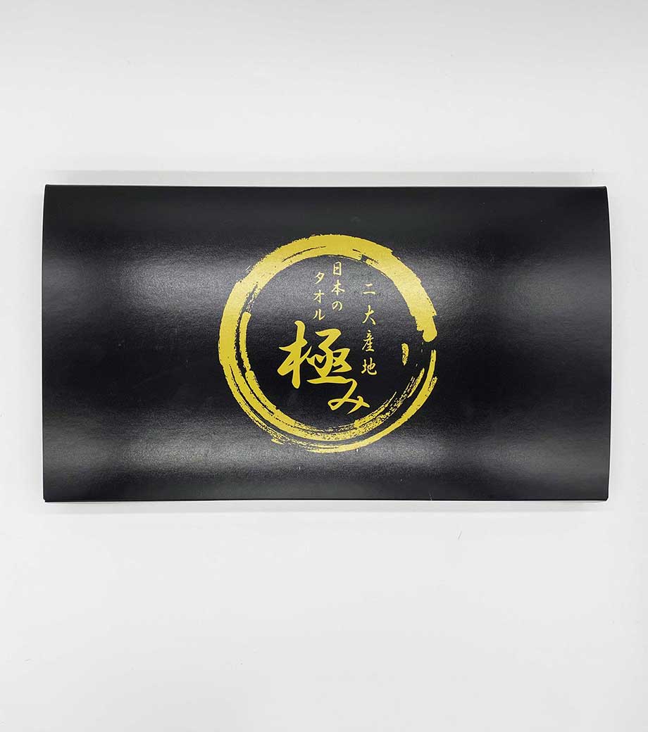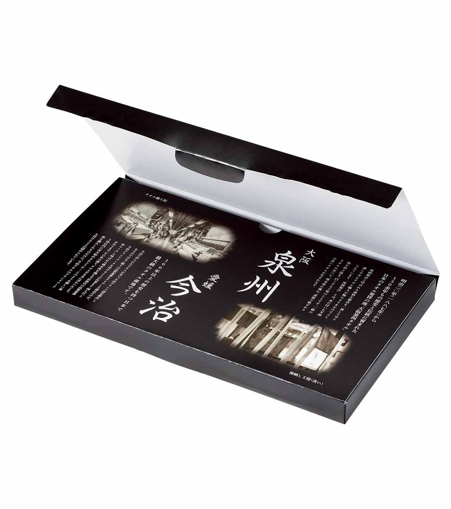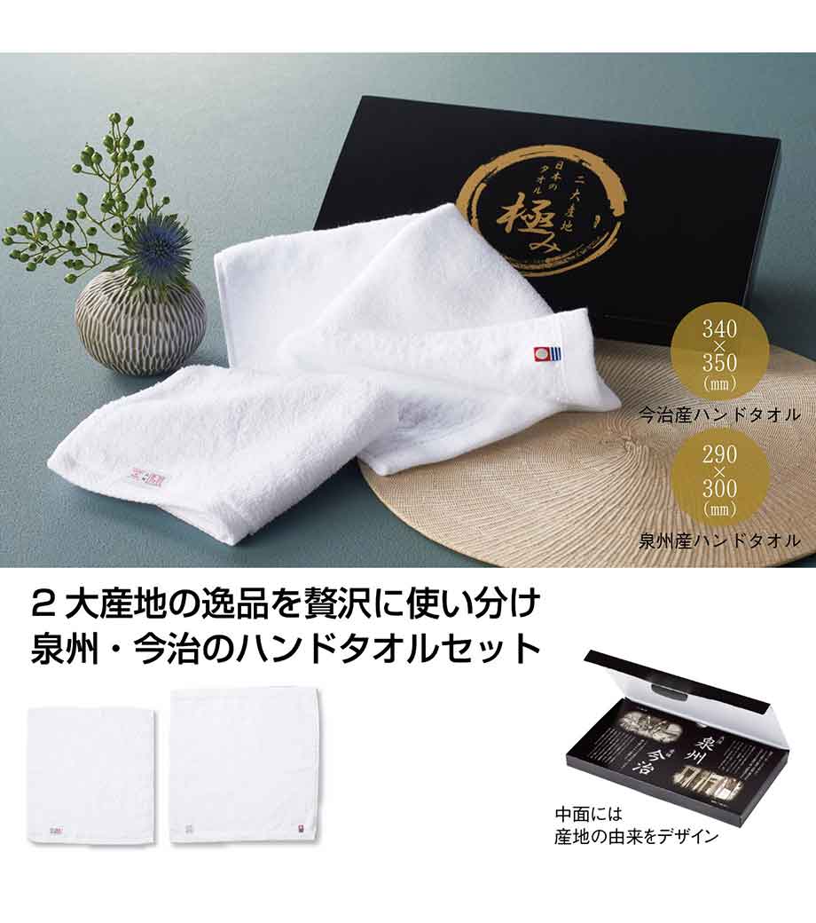 今治タオル、泉州タオル共に吸水性が高く肌触りが優しい風合いが特徴。今治タオルのほうが若干大きいサイズ。黒地の化粧箱の中面には産地の由来がデザインされています。ご挨拶回りや贈答用としておすすめです。