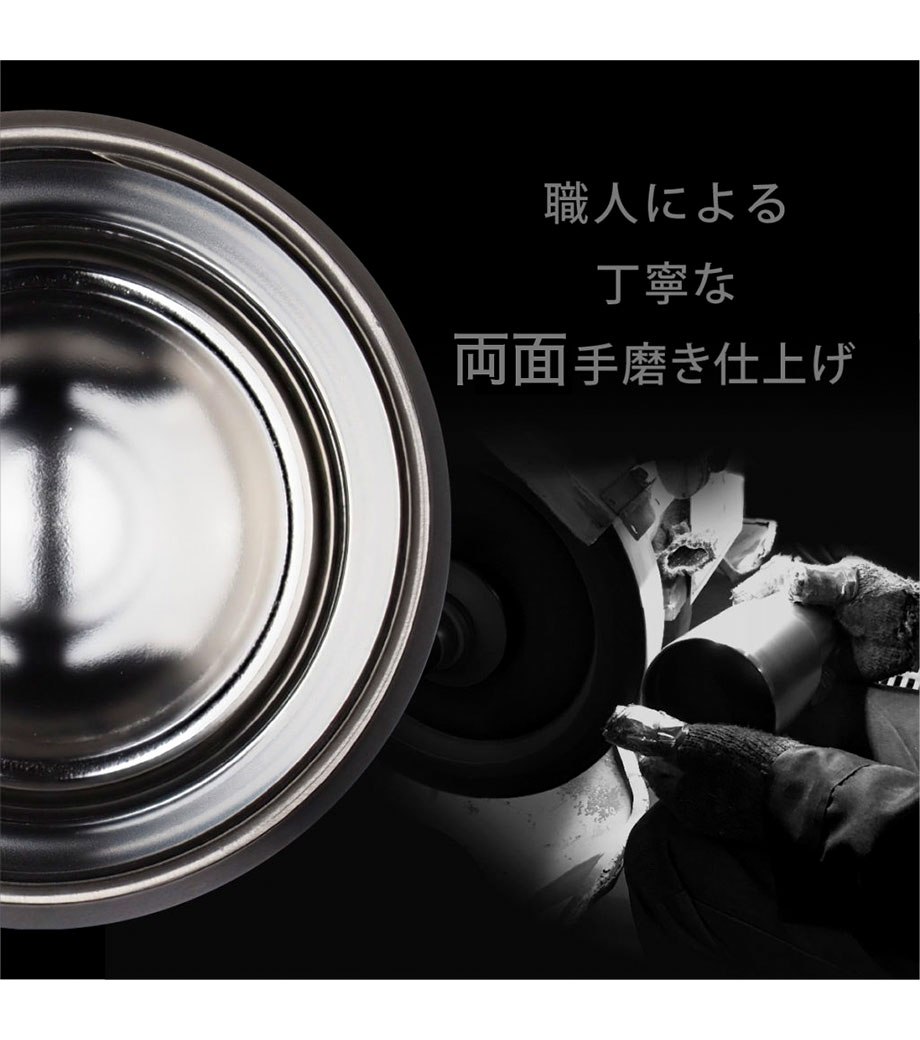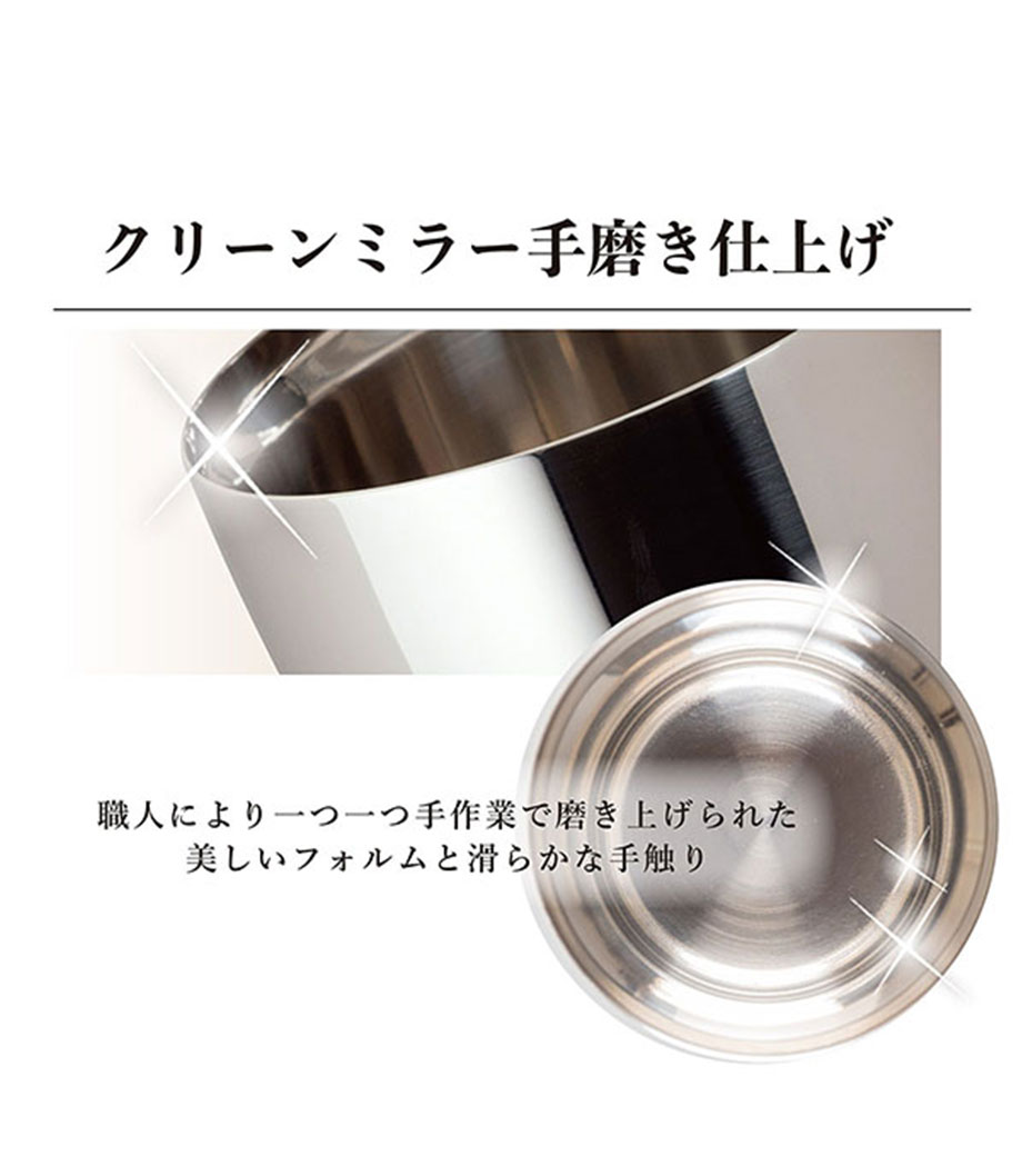丈夫で錆びにくいSUS304製。内・外の両面にクリーンミラー手磨き加工が施されているので、表面の凹凸が減り、ニオイや汚れの付着を抑えます。また、金属臭を抑えるのでお酒の風味をより一層楽しむことができます。アイスを入れてフロートを楽しんだり、デザートにも使えて、男女共におすすめなサイズ感です。