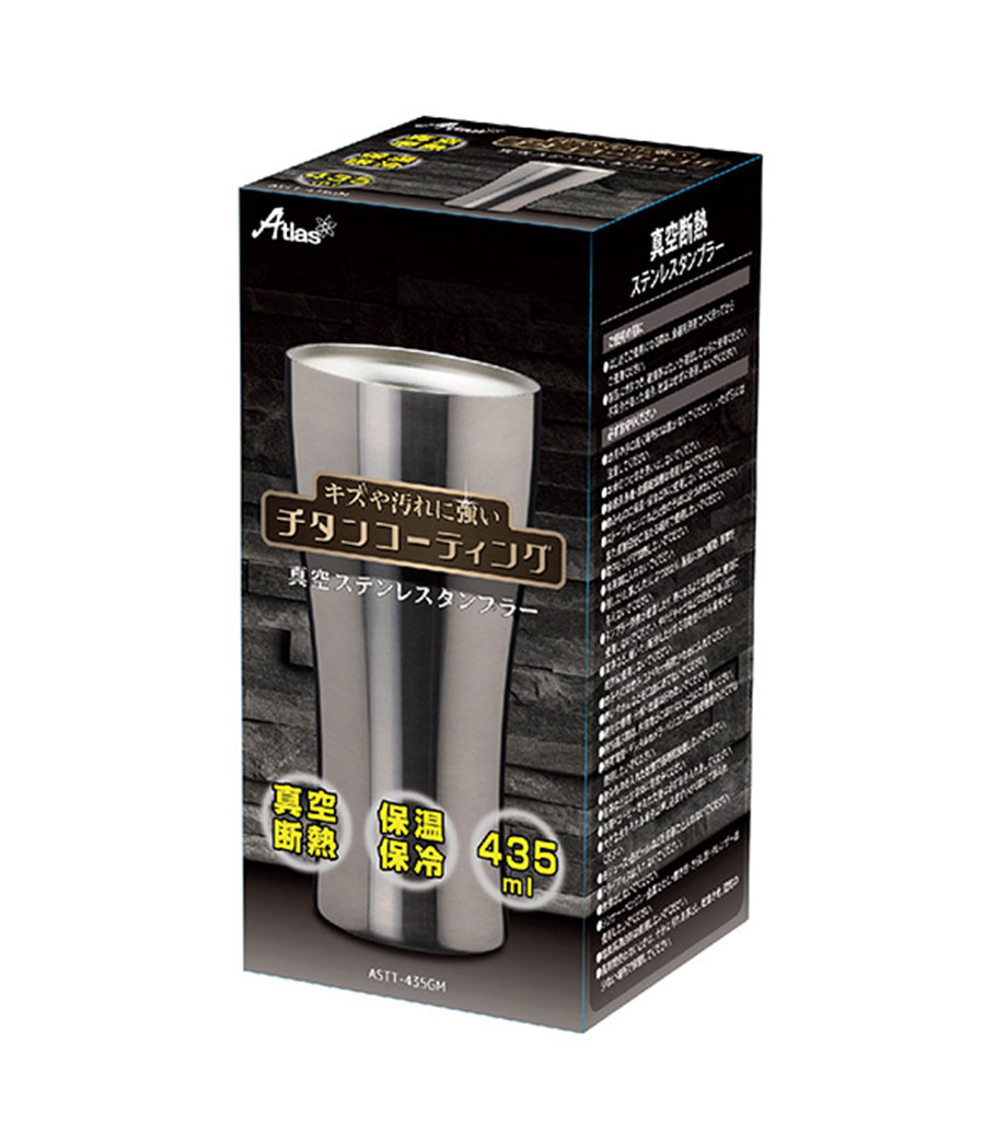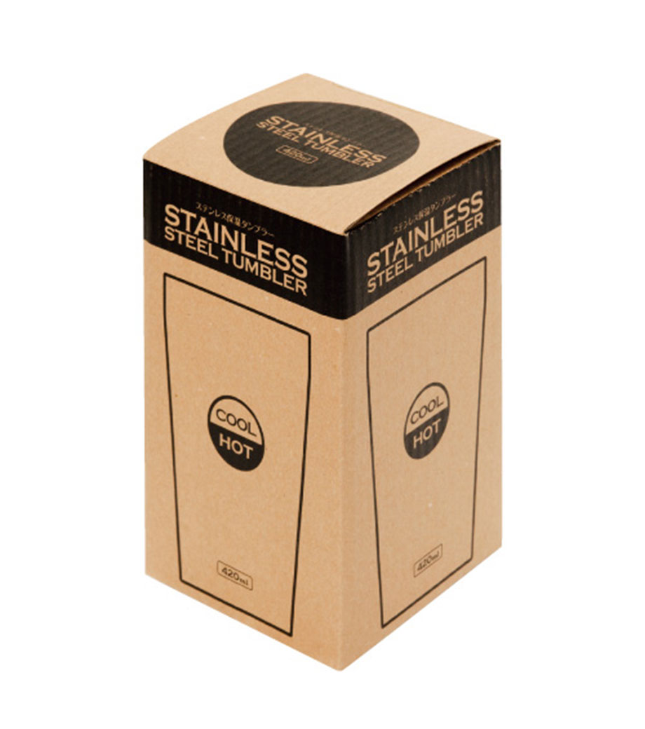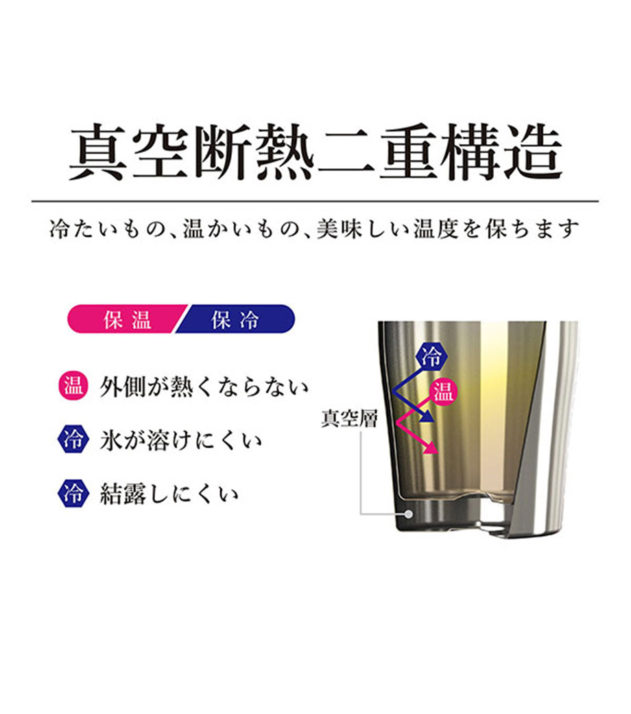 「真空ステンレスタンブラー420ml」は、丈夫なステンレス素材の真空二重構造タンブラーです。2重にしたステンレス層の間を真空構造にし、熱伝導を押さえ保冷・保温効果を持たせました。