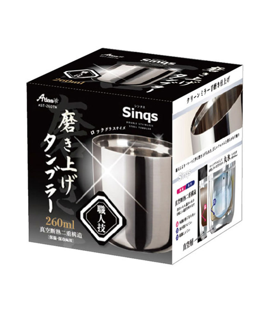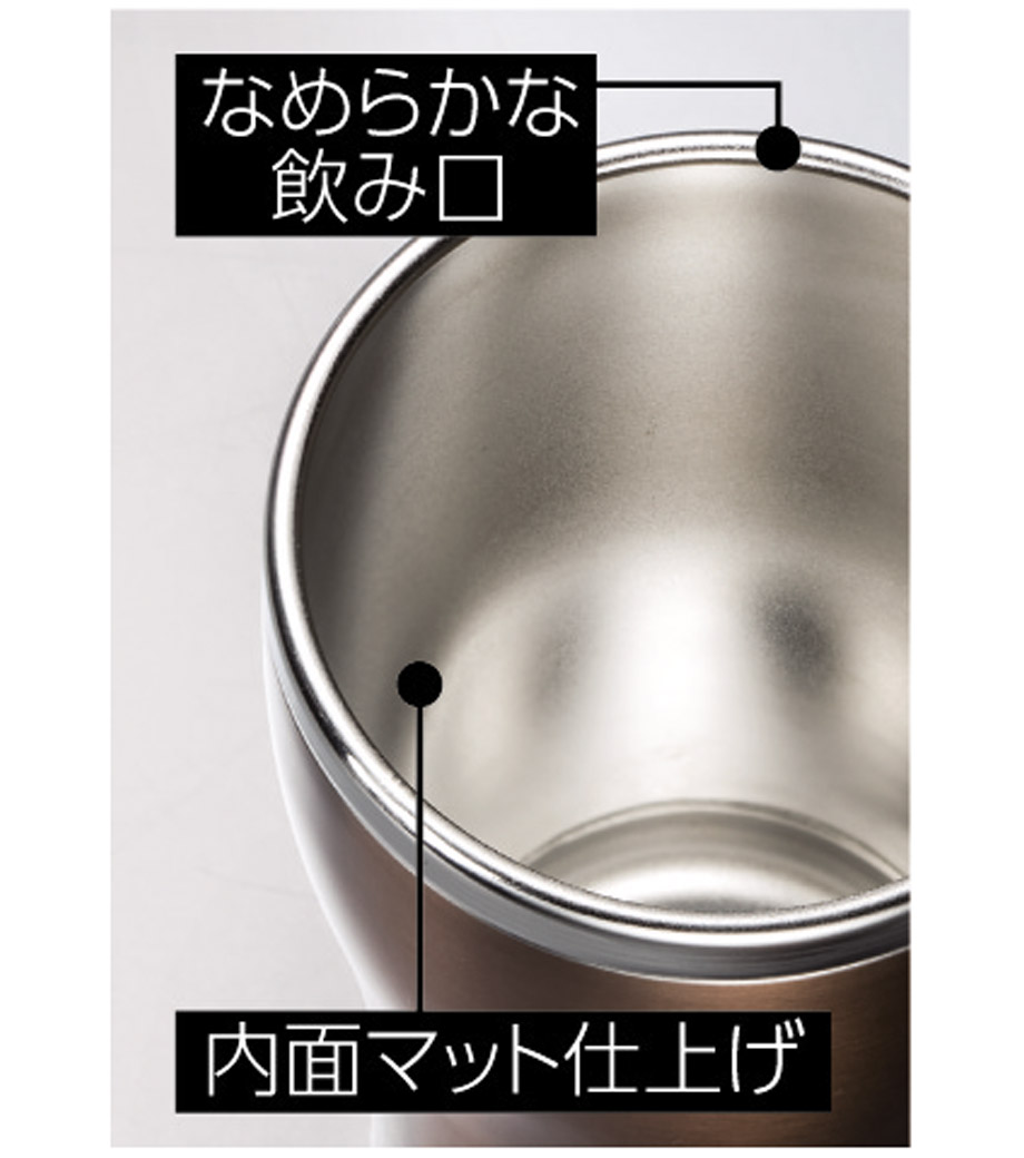 真空ステンレス磨き上げタンブラー260mlは、内・外の両面にクリーンミラー手磨き加工を施した商品です。職人によって磨き上げられた輝きは、美しさだけでなく口当たりのよさにも貢献しています。また、表面の凹凸が減ることによって汚れやニオイの付着を抑えます。真空断熱二重構造で冷たい飲み物はもちろん、温かい飲み物もゆっくり楽しめます。氷を入れても結露しにくいので、デスクでも使いやすいところがポイント。