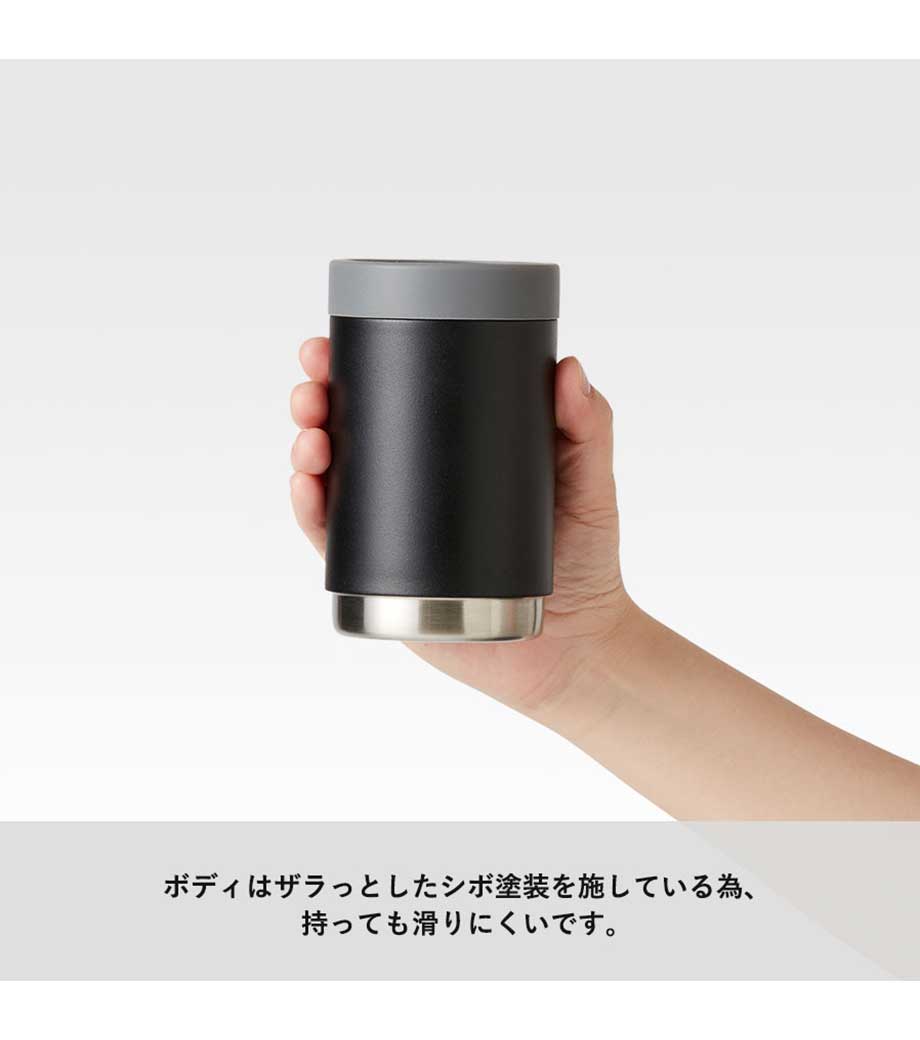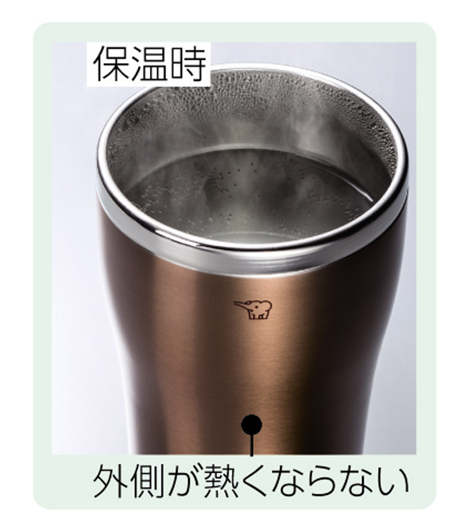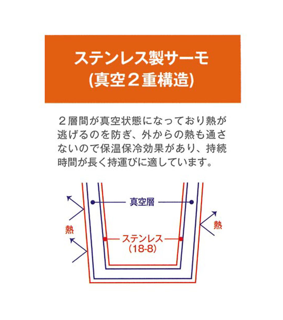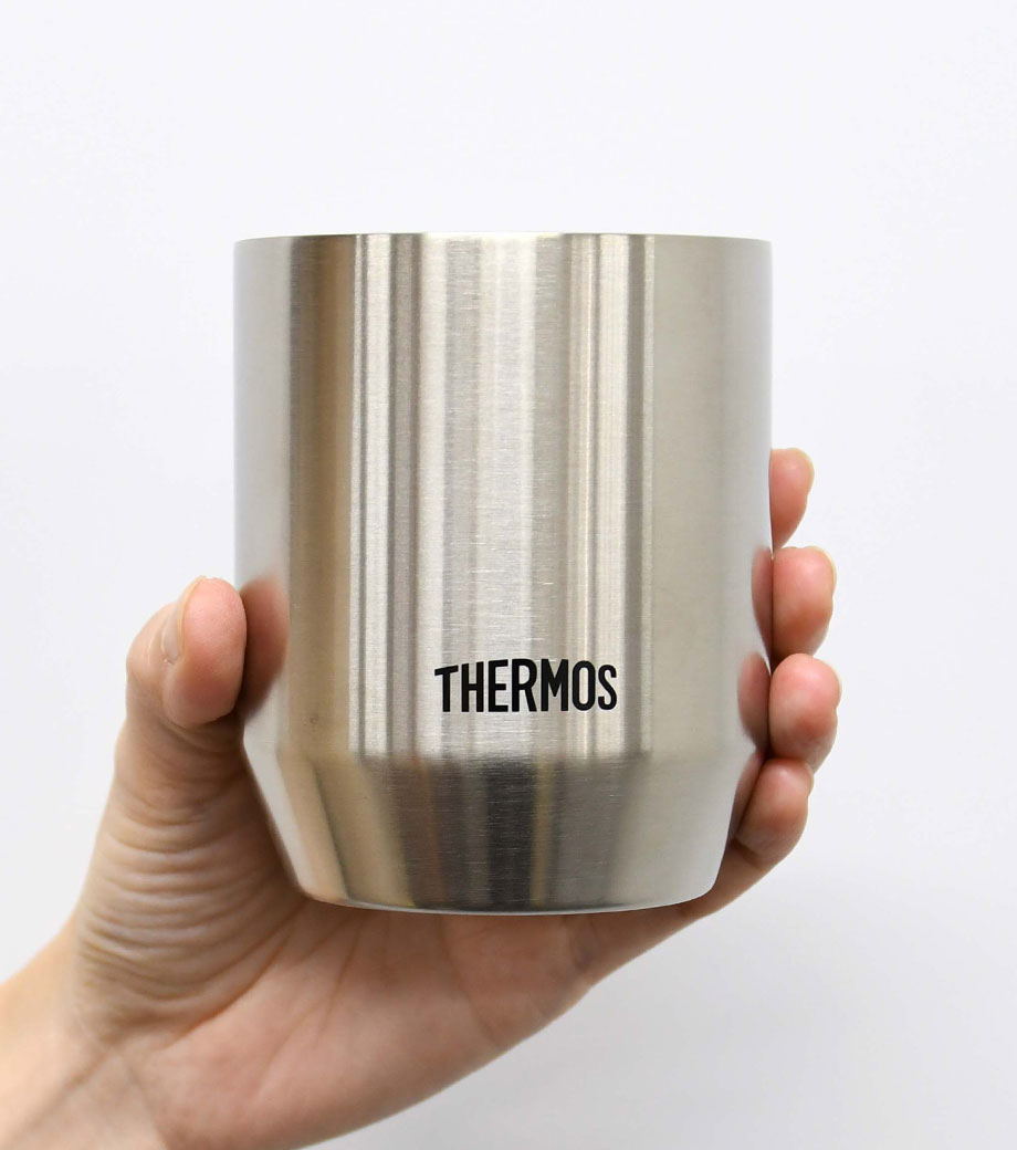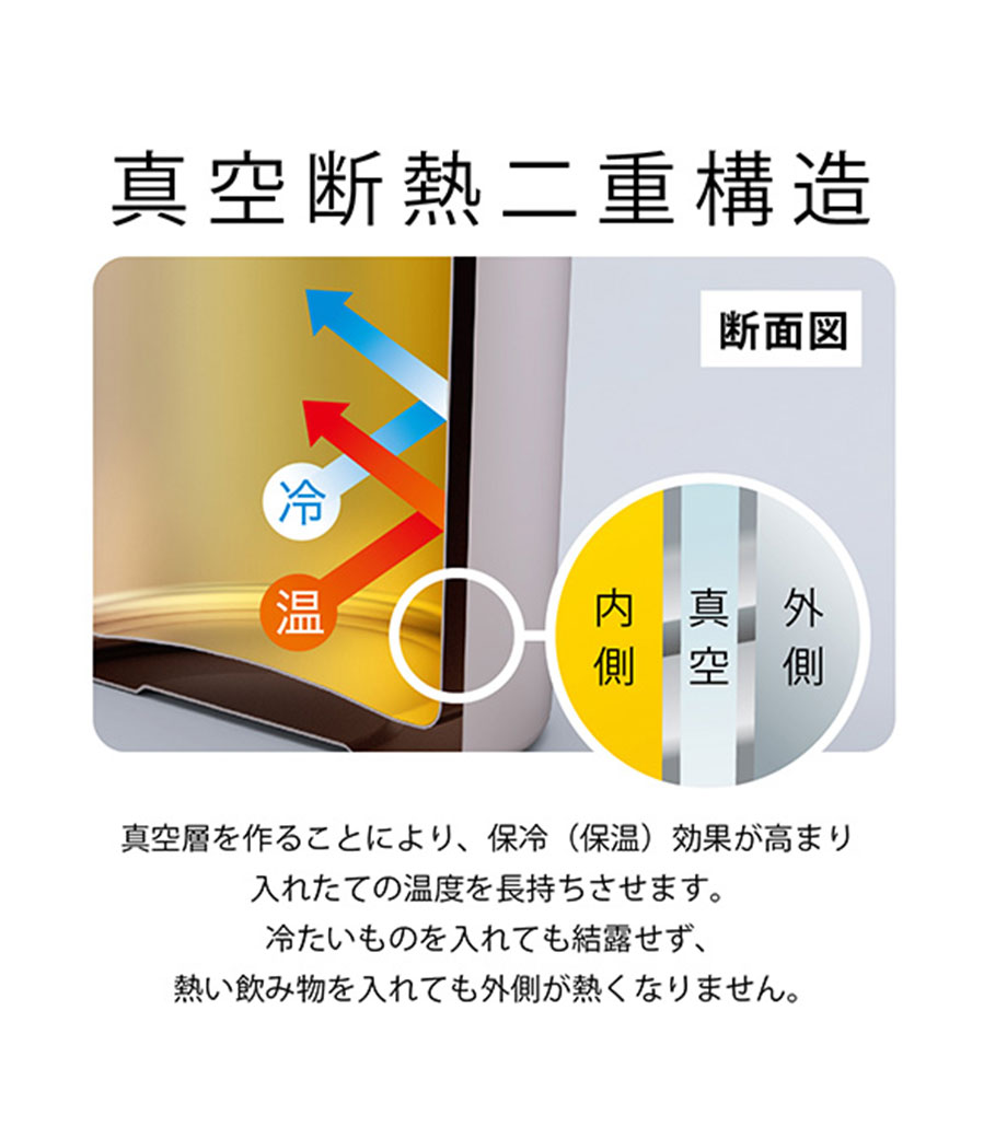 ステンレス製で真空二重構造なので、保冷・保温効果バッチリ!温かい飲み物を入れても外側が熱くならず、冷たい飲み物を入れた時は結露を防ぐ頼もしいアイテムです。