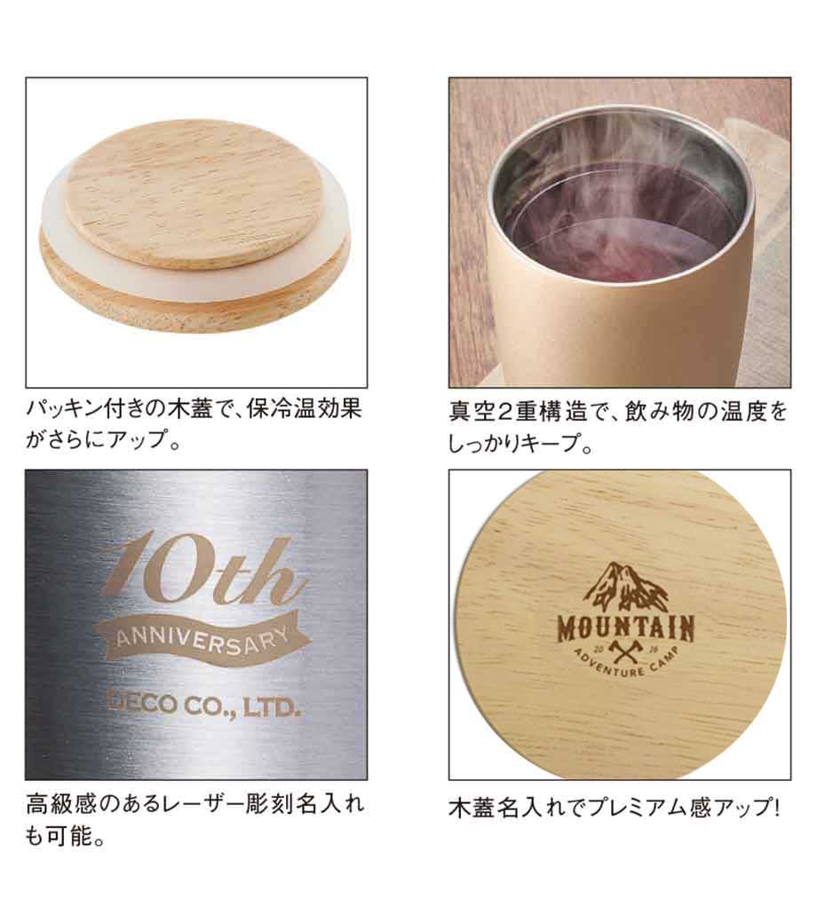 名入れはワンポイントのパッド印刷、広範囲に印刷できる回転シルク印刷、高級感が出るレーザー彫刻に対応しています。オリジナルのステンレスサーモタンブラーは周年記念や卒業記念に人気です。