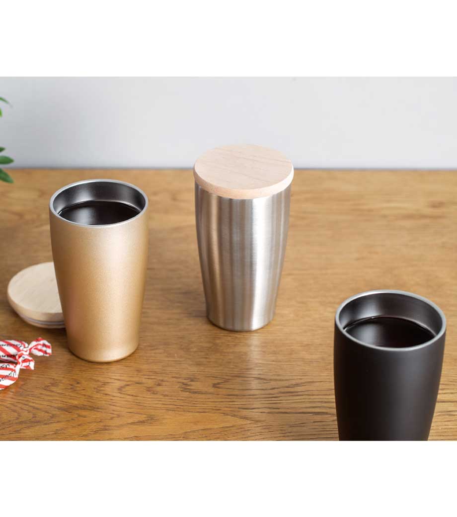 ウッドキャップ・ステンレスタンブラーは他とは違うタンブラーをお探しのあなたにオススメ!定番のステンレスタンブラーにパッキン付き天然木の蓋を付けました。保冷温効果がアップし真空2重構造で飲み物の温度をしっかりキープ。埃やごみの侵入も守ってくれます。オフィスやリビング、どんな場所でも馴染むシルバー・シャンパンゴールド・マッドブラックの3色をご用意しました。