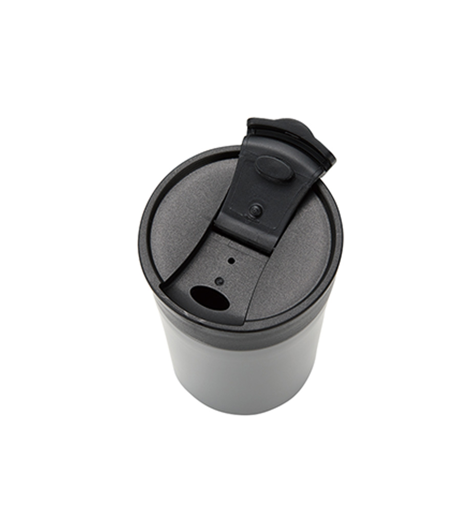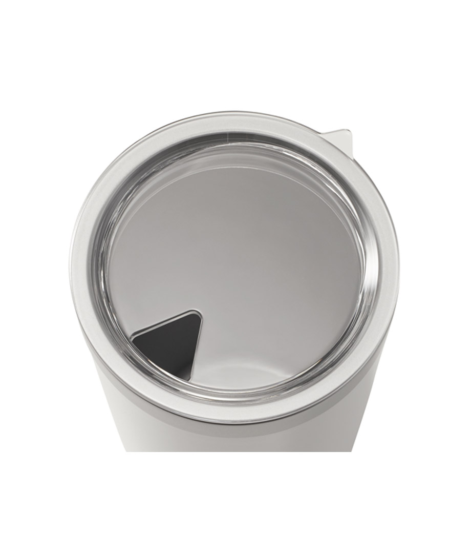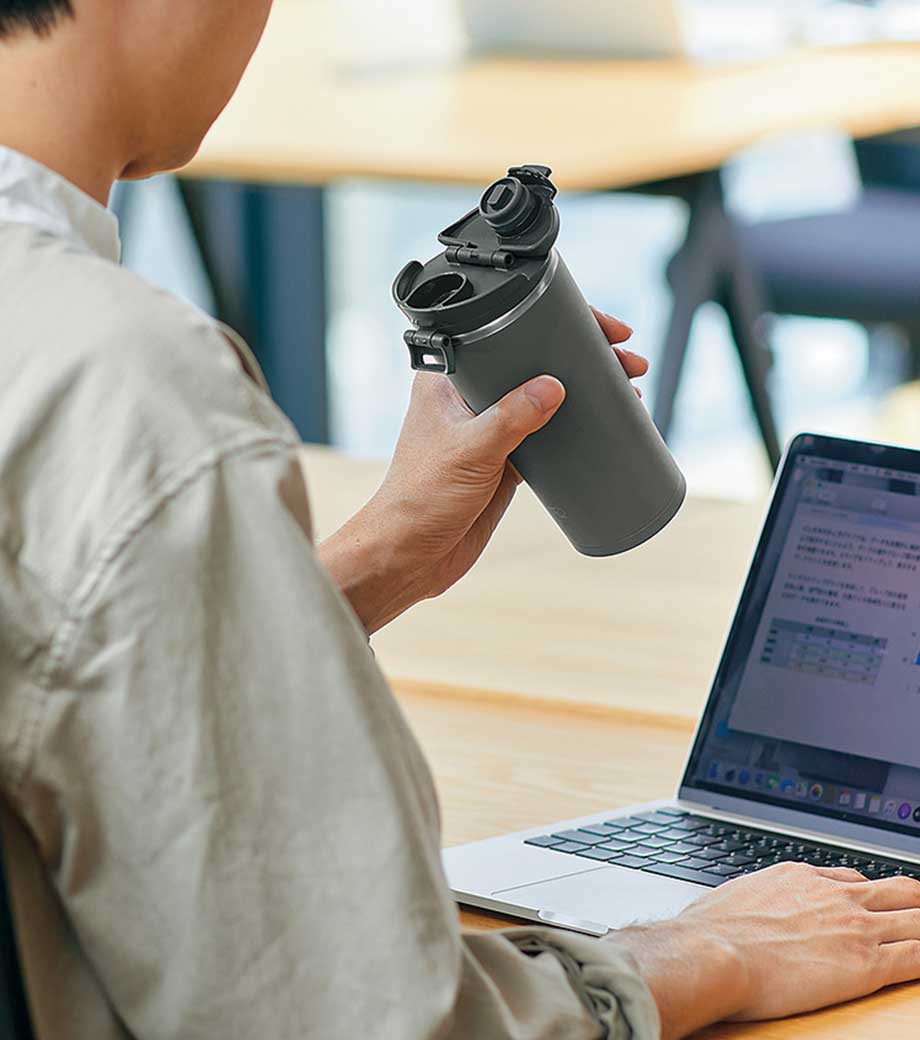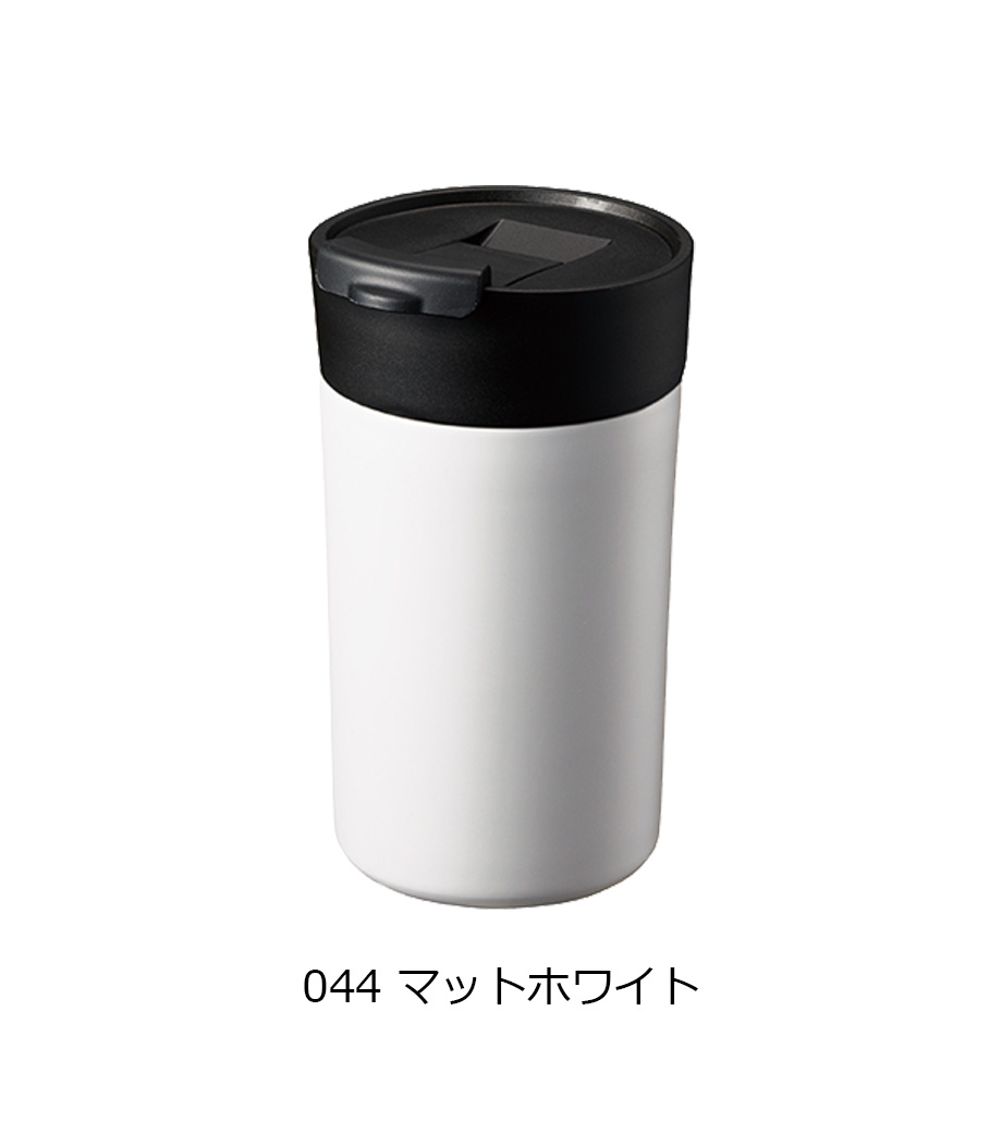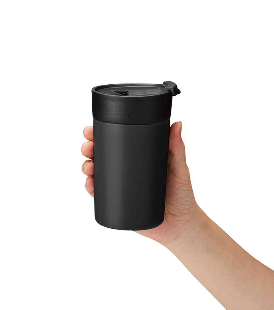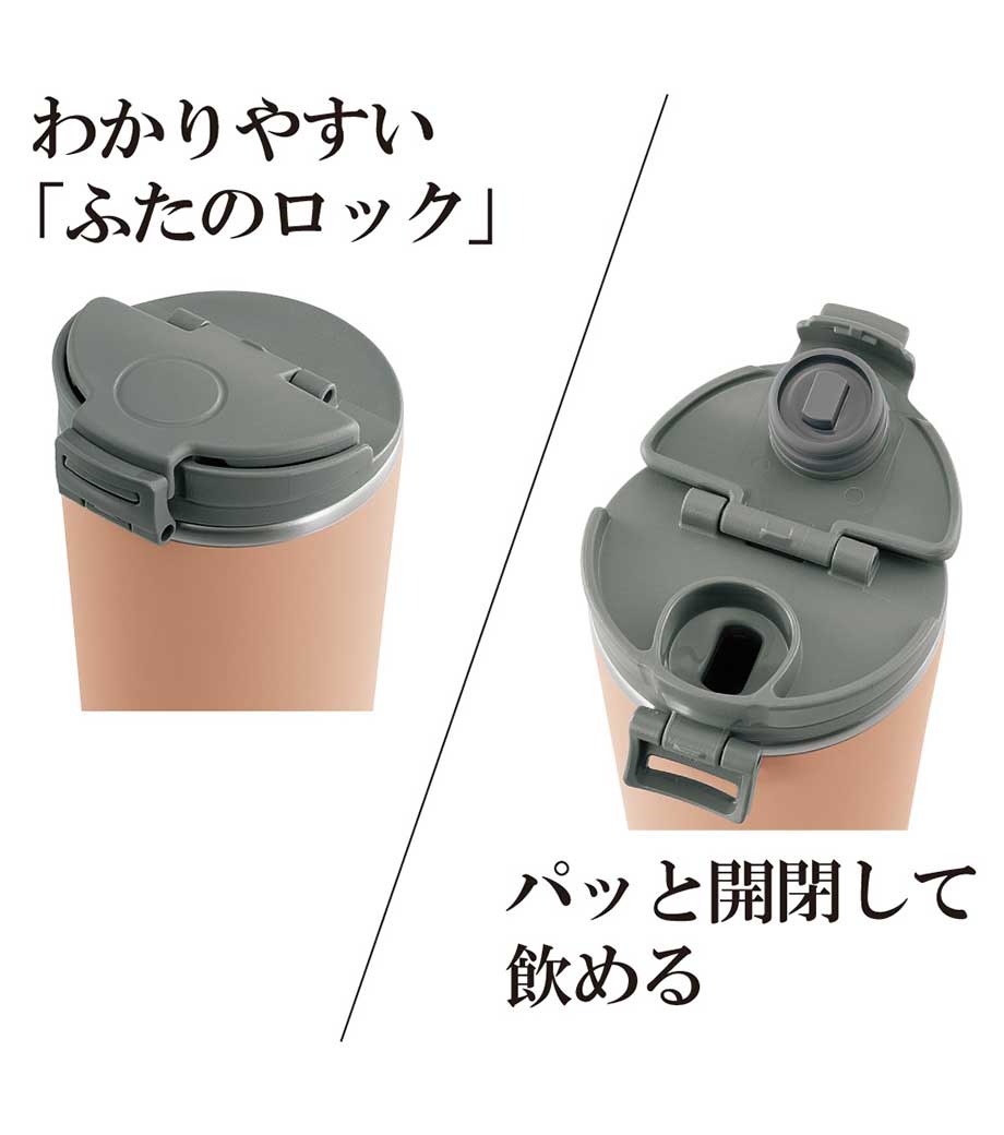 シンプルなモノトーンカラーに、ステンレスのワンポイントがスタイリッシュなタンブラーです。熱いものは冷めにくく、冷たいものは結露しにくい二重構造になっています。開け閉めラクラクなフラップ付きのフタが使いやすいポイント。ホコリなどが入りにくく、飲み口からはこぼれにくいです。フラップは後ろに倒して固定もできます。