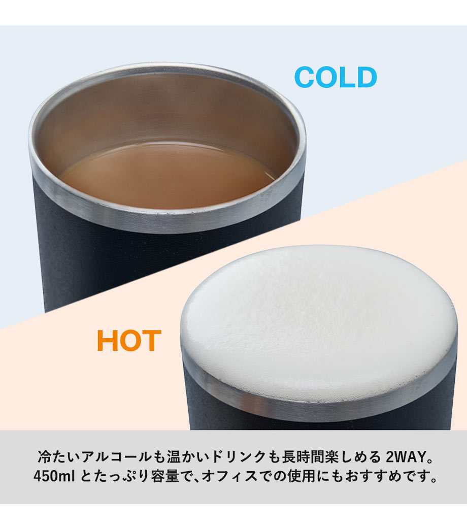 カラモ コンビニカップ対応 真空タンブラー450mlは、18-8ステンレスを使用した保冷温効果の高い真空二重構造です。汚れやニオイが付きにくく、錆にも強いのが特徴。飲みごろを長時間楽しめます。氷が入った飲み物も結露の心配がありません。ホットのコンビニカップMもそのまま入る、ビッグサイズの約450ml。飲み物を直に入れて在宅ワークやオフィス、普段使いにもピッタリです。