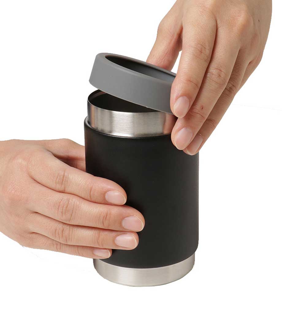 ステンレスサーモタンブラー360mlは、小さめのコーヒカップがそのまま入る優れもの。コンビニで手軽に買える本格コーヒーは、通勤・通学時に購入している人をよく見かけますよね。そんな手軽でおいしいコーヒーも、カップがプラスチックや紙製なのですぐにぬるくなるのが残念なところ。そんな時に、このタンブラーにカップごとすっぽり入れてしまえば、保温・保冷効果がぐっとUP!カップのまま入れることでタンブラーを洗う手間も省けますね。素材はステンレス(18-8)を使用しているので、さびにくく匂いも付きにくいのがポイント。もちろん飲み物を直接入れて普通のタンブラーとしてもご利用いただけます。