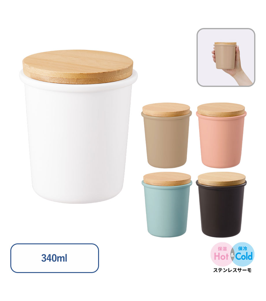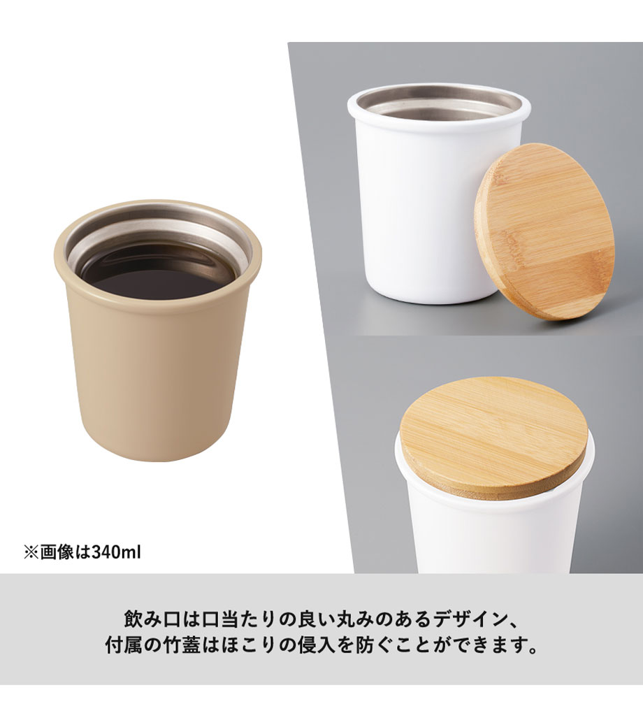 Maluttoサーモステンレスタンブラー340mlは保冷温性抜群の真空二重構造タンブラーで、適温を長時間キープしてくれます。ホコリ避けになる竹のフタ付き。蓋はコースターとしても使えます。たっぷり入る約340ml容量はオフィスや屋外、リビングでのくつろぎタイムにぴったり。厚みがあるソフトな飲み口も魅力です。