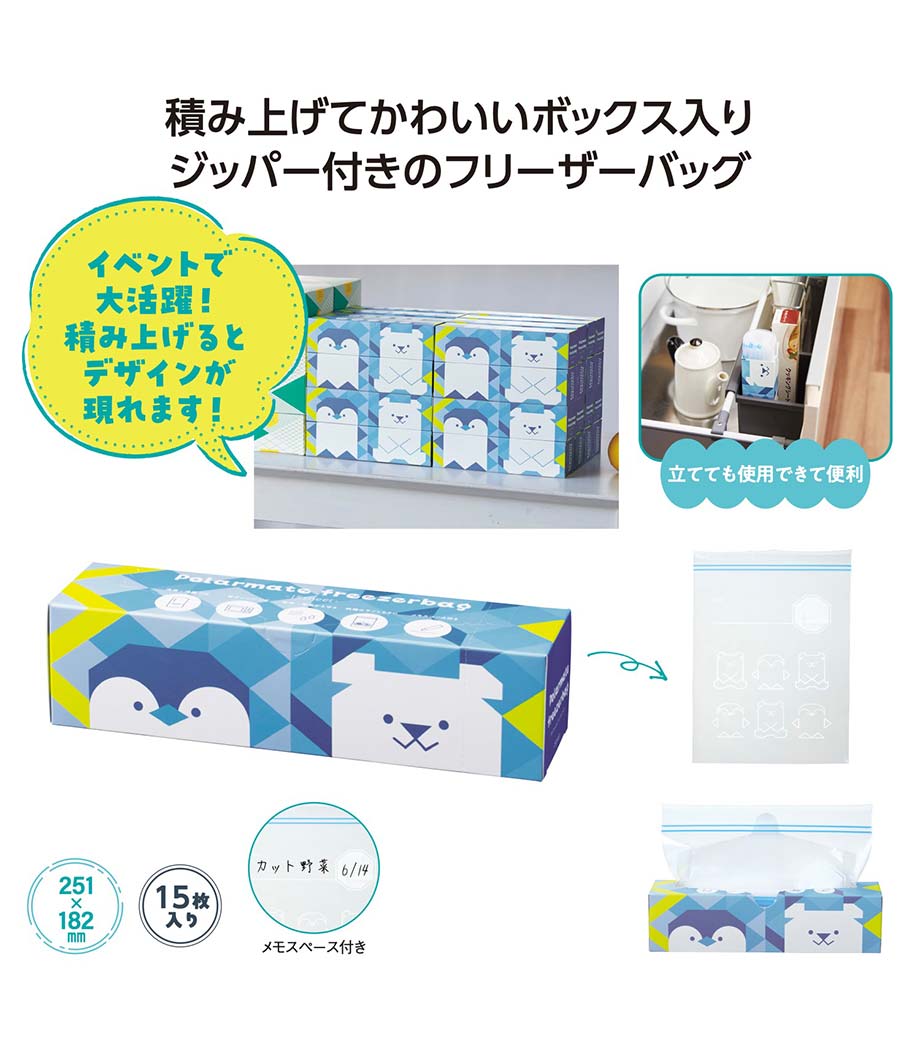 毎日の食材保存をちょっと楽しくしてくれるフリーザーバッグ。シロクマとペンギンが描かれた可愛いパッケージはキッチンに置くだけでほっこり癒されます。