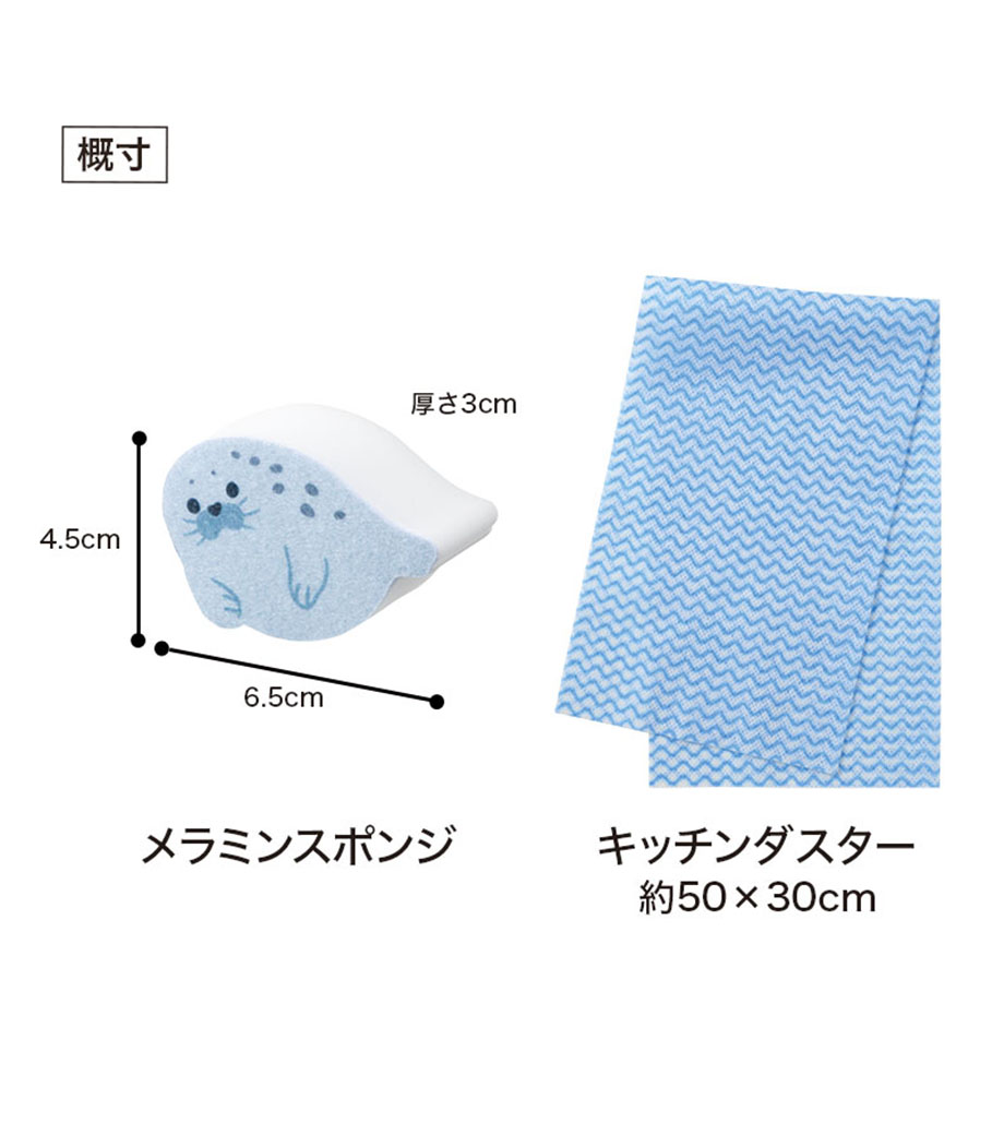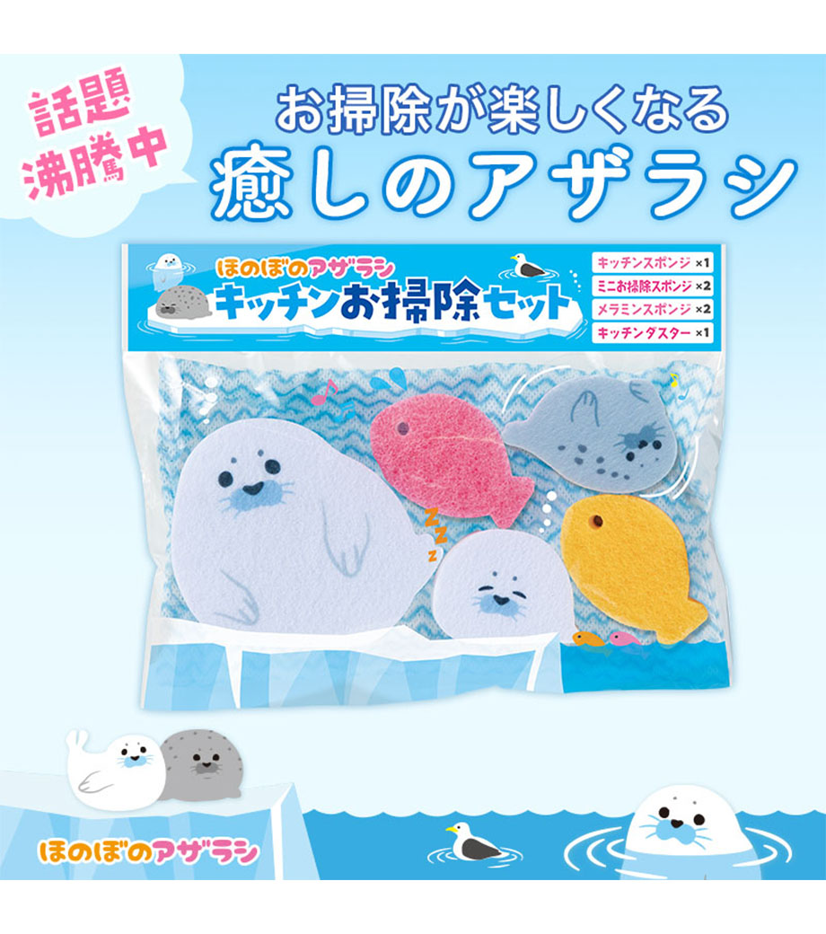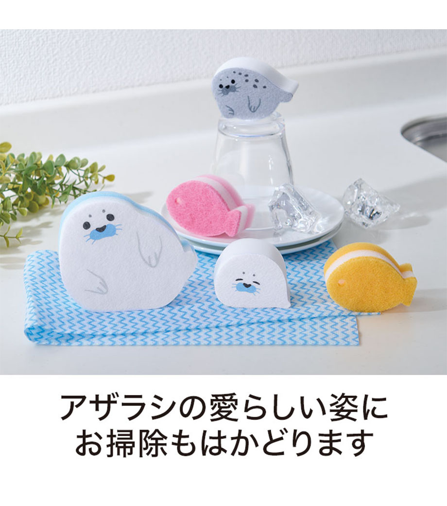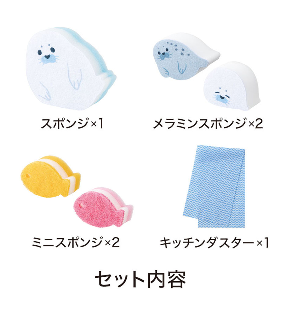 毎日のキッチン仕事をほっこり楽しい時間にしてくれるお掃除セット。あざらしや魚のかたちをしたキッチンスポンジ、メラミンスポンジ、キッチンダスターがセットになっています。かわいらしいデザインで、シンクまわりに置いておくだけでも癒しのアクセントに。