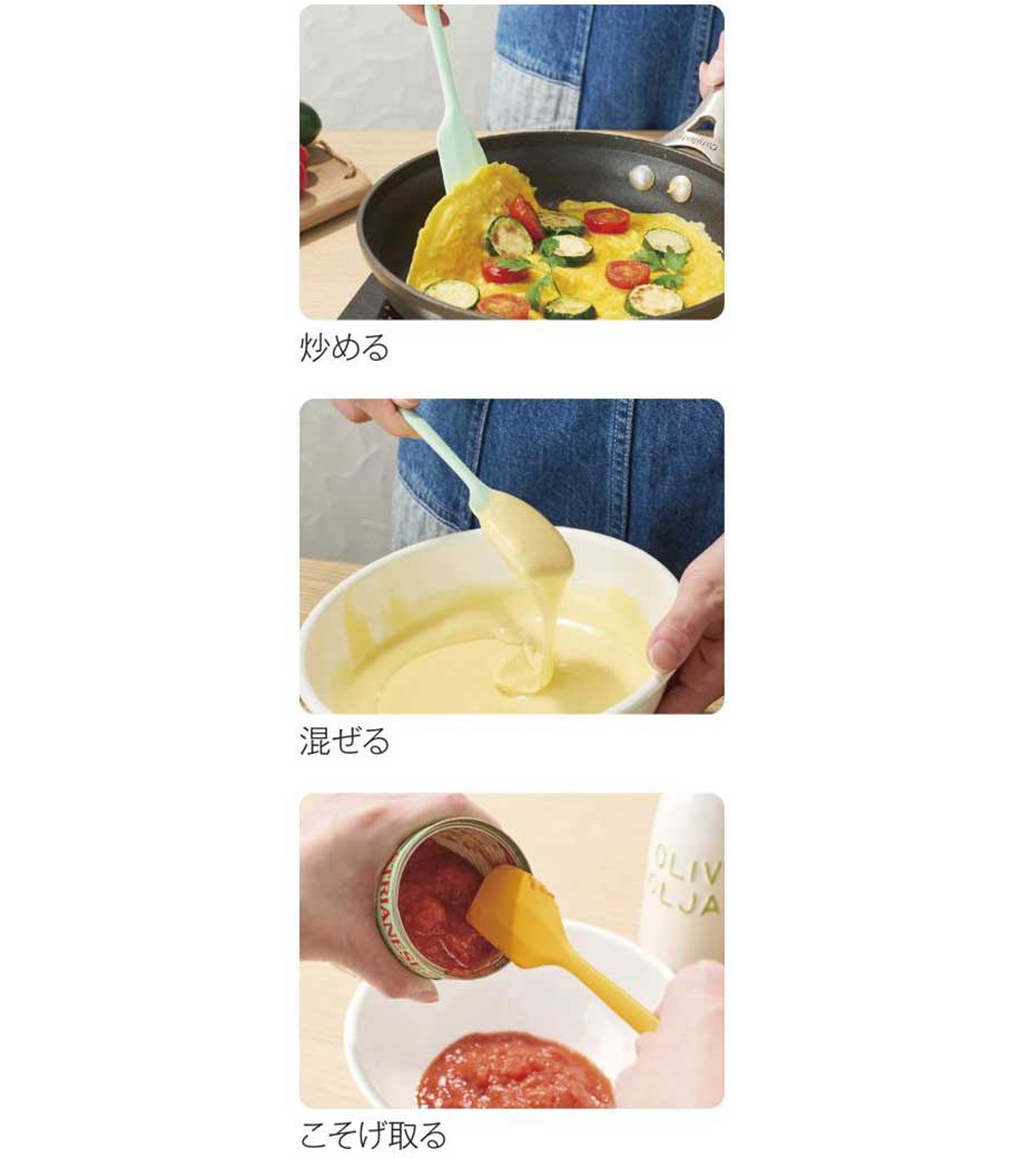 毎日のお料理やお菓子作りに便利なシリコン製スパチュラ。先端はやわらかなシリコン素材でボウルのカーブに沿ってしなやかに曲がり、食材をムダなくきれいにすくえます。炒め物から生地作りまで幅広く活躍しキッチンでの使い勝手も抜群です。