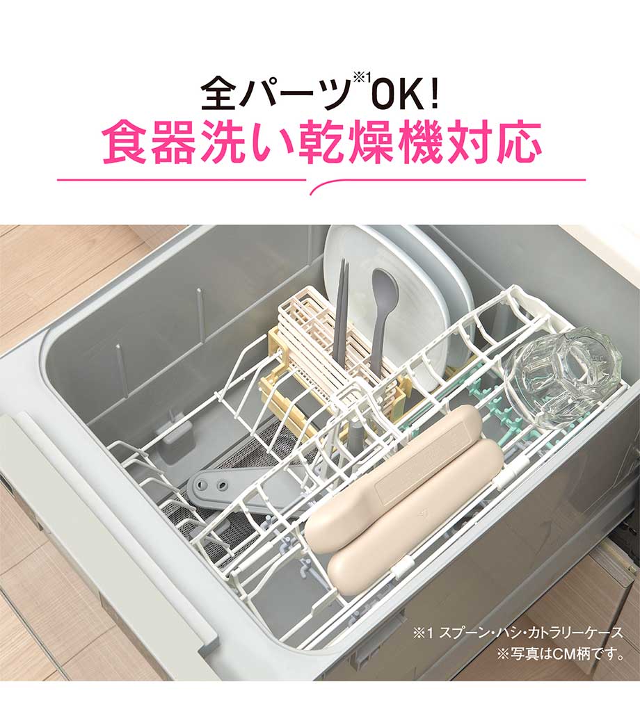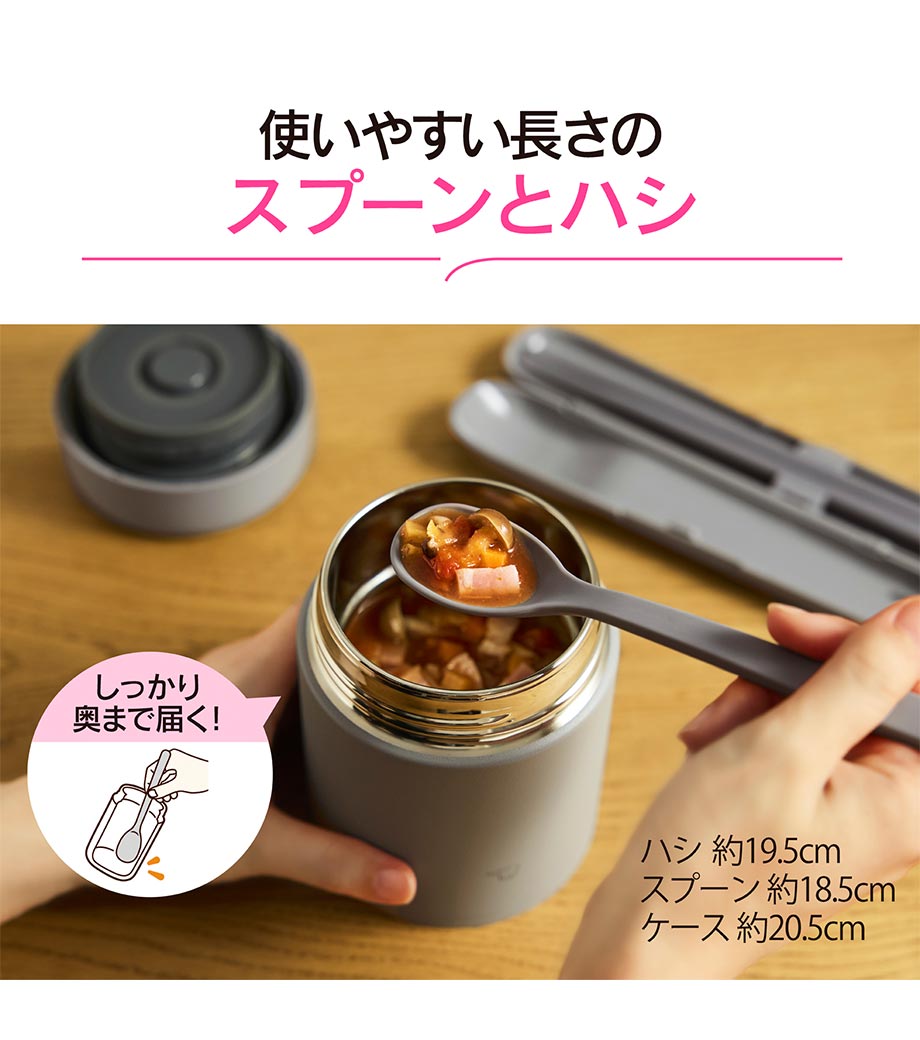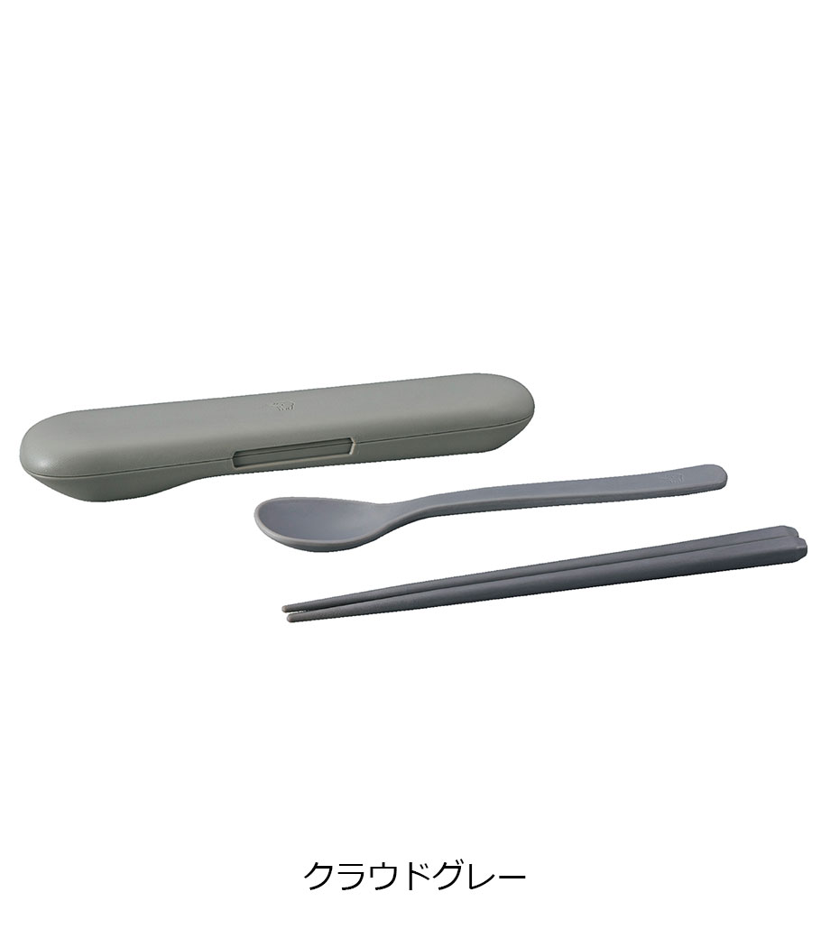 丸くて広い先端形状で、すくいやすく口当たりがよいスプーンと、お箸がケースに入ったカトラリーセットです。スプーンはスープジャーに丁度良いつくりで、しっかり奥まで届く長さがうれしい。持ち歩いてもカタカタ音がしにくいシリコーンゴム製のハシ留め付き。全パーツ食洗機対応です。