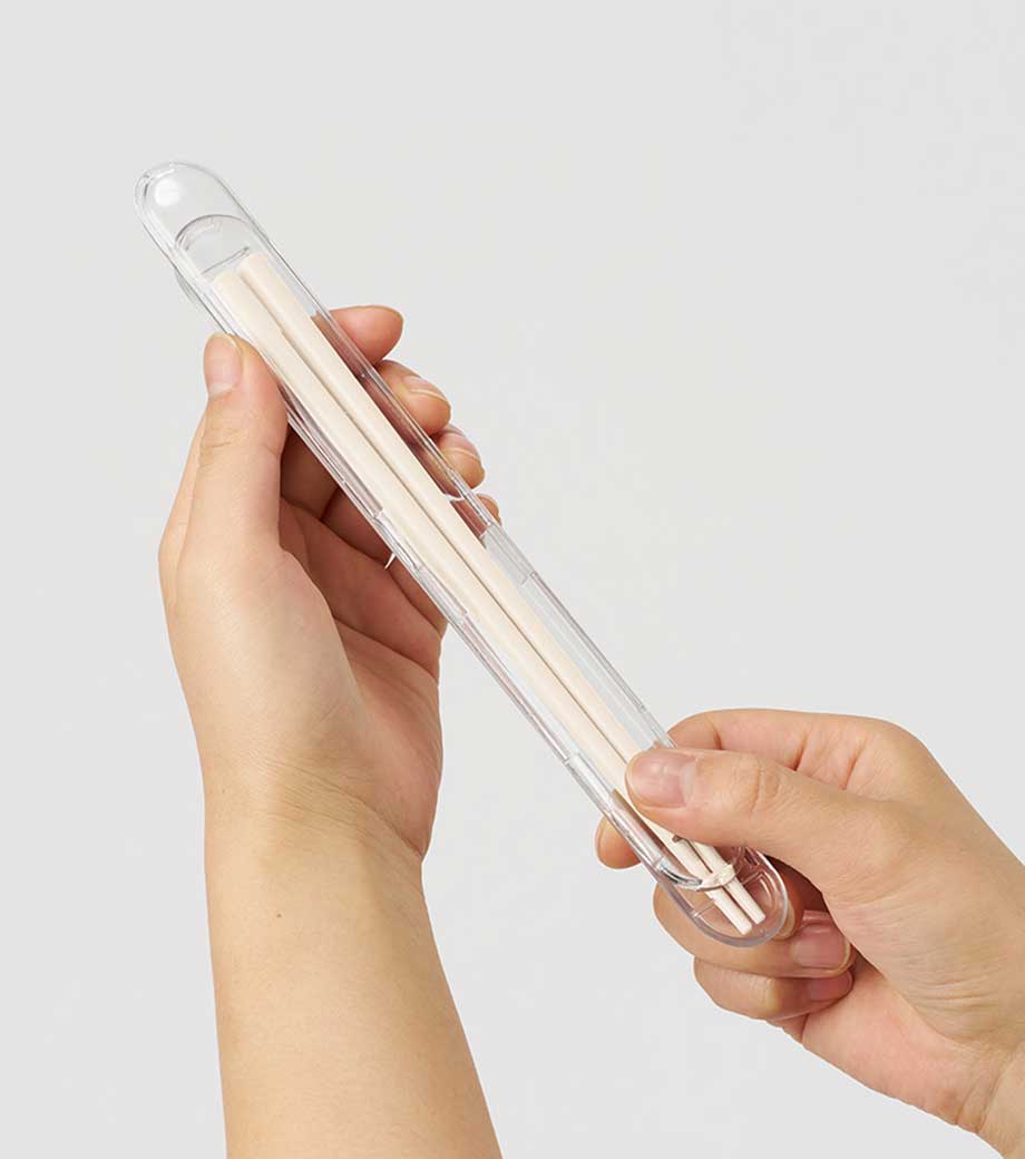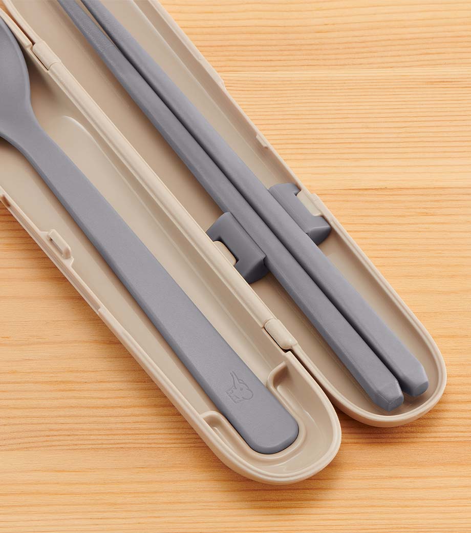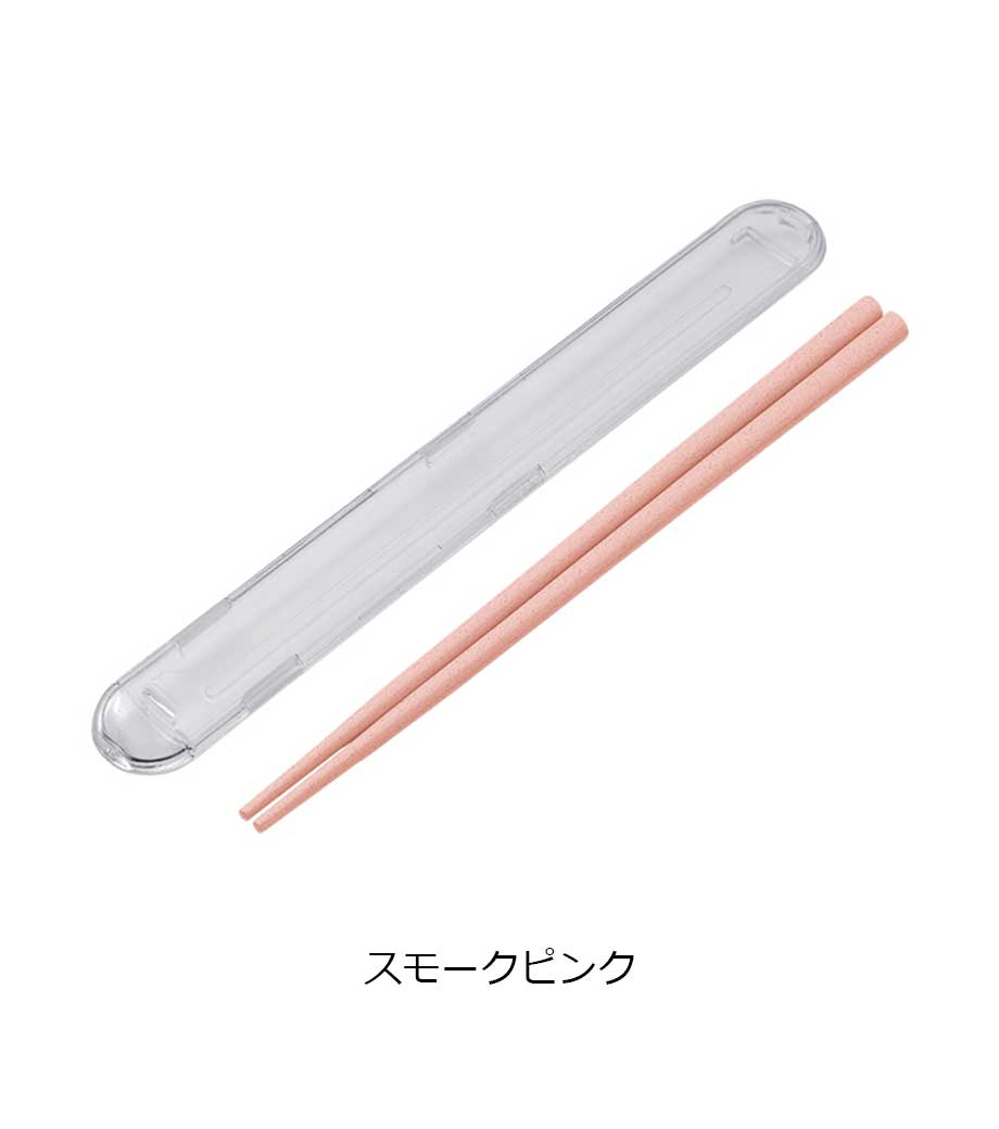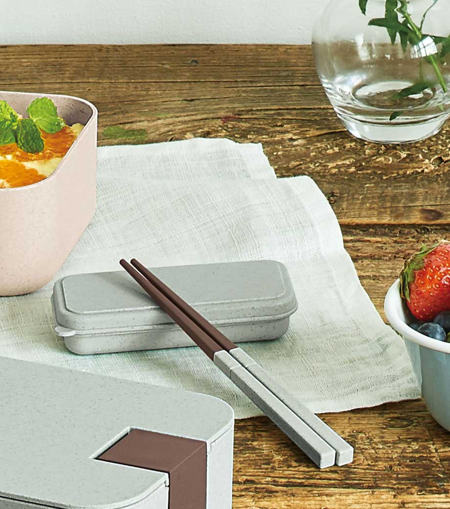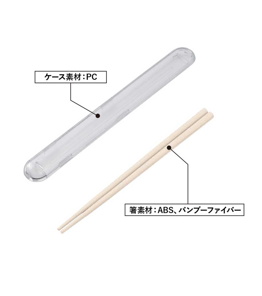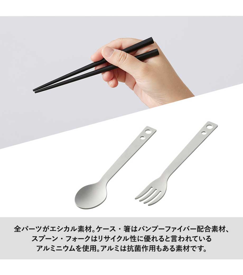 持ち運びに便利なケース入りのカトラリー。箸にバンブーファイバーを25%以上配合し、樹脂の使用量を削減したエコで環境に優しいアイテムです。箸は先端にシボをつけることで、食品が掴みやすくなっています。ケースは透明で中が見えるデザイン。2つに分解でき、細部まできちんと洗えるので衛生的です。