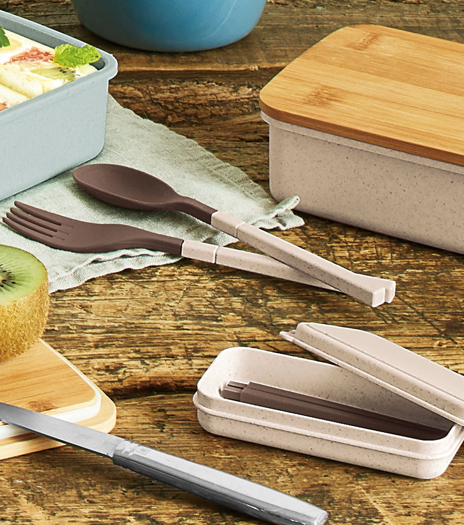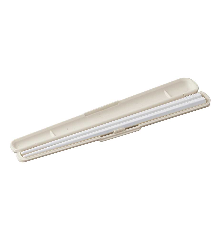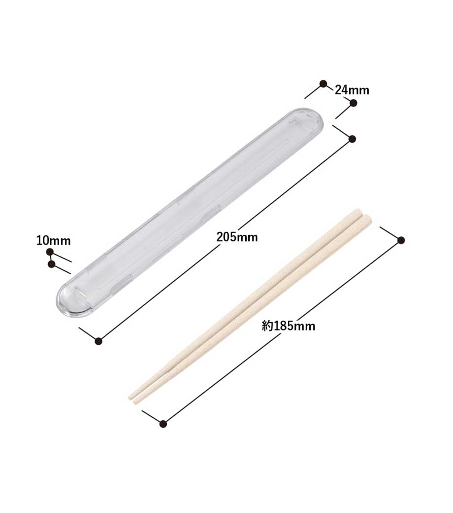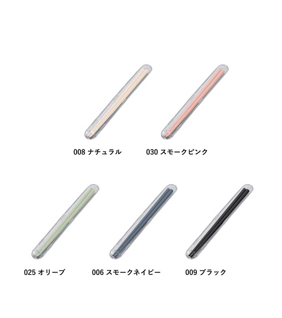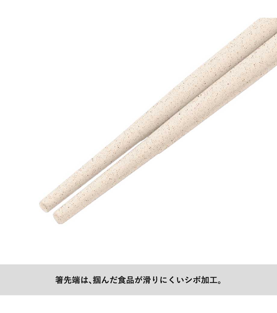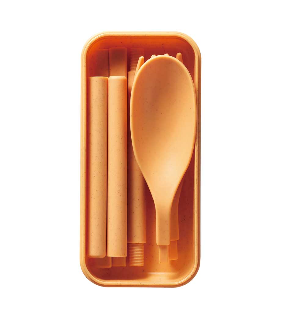 持ち運びに便利なケース入りのカトラリー。箸にバンブーファイバーを25%以上配合し、樹脂の使用量を削減したエコで環境に優しいアイテムです。箸は先端にシボをつけることで、食品が掴みやすくなっています。ケースは透明で中が見えるデザイン。2つに分解でき、細部まできちんと洗えるので衛生的です。