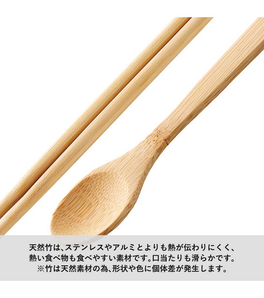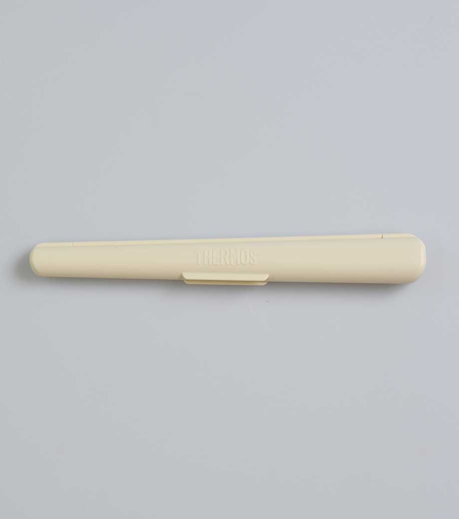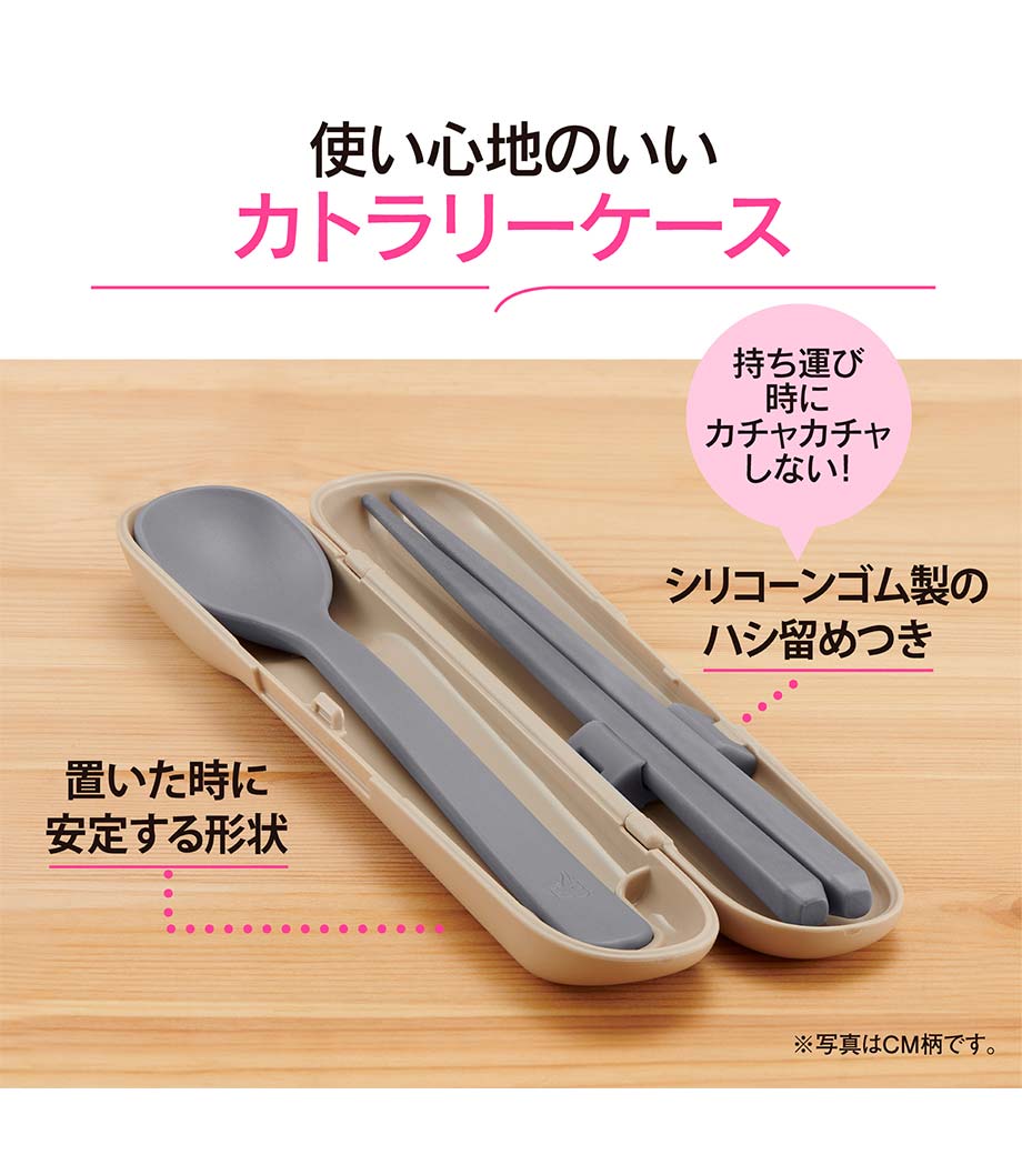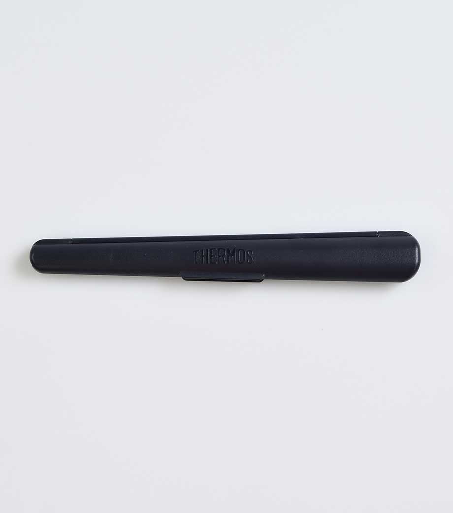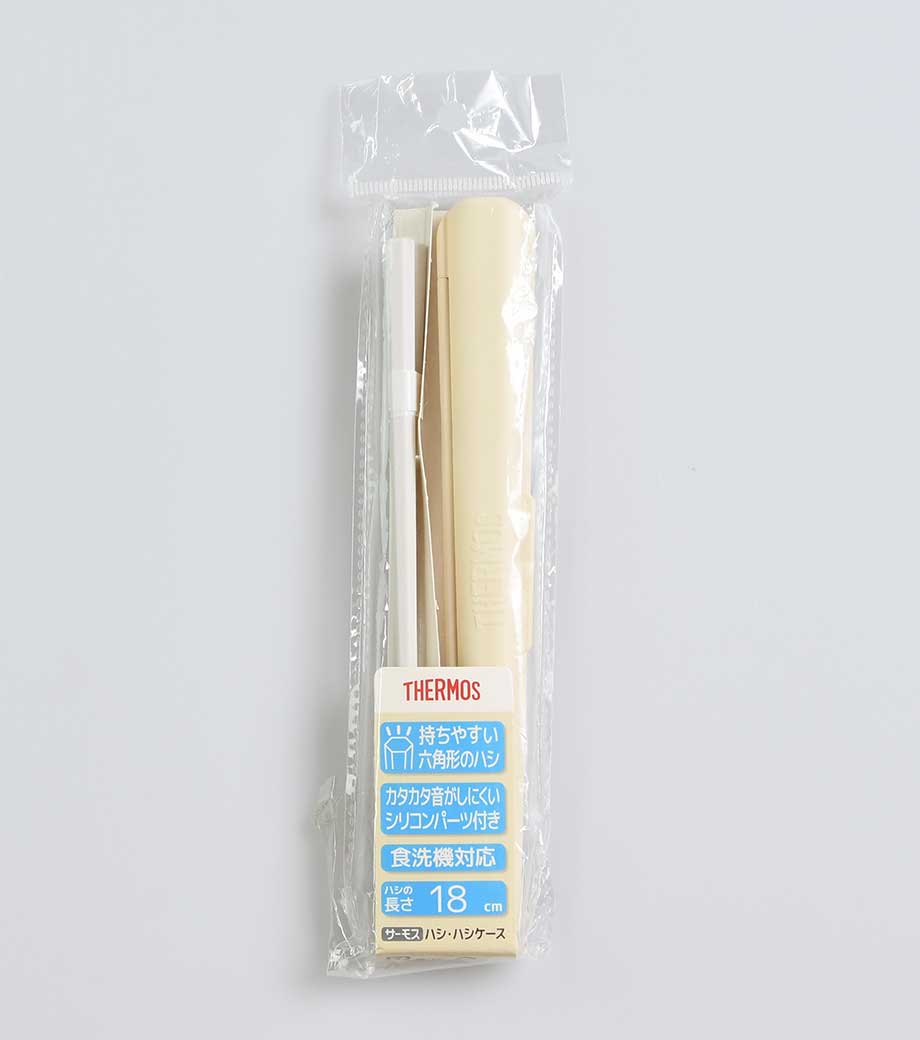 ケースに入れて持ち運べるスプーンとハシのセットです。ケース内にシリコン製のハシ留めがあり、移動中にカチャカチャと音が鳴りにくい仕様。木製のような素材感で口当たりが良く、細かいこだわりはサーモス(thermos)ブランド製品ならでは。スプーンの角はスクエア型でお弁当を最後まで綺麗に食べやすいのが人気のポイントです。