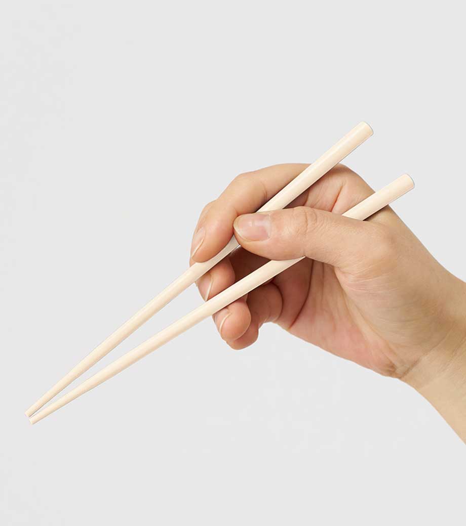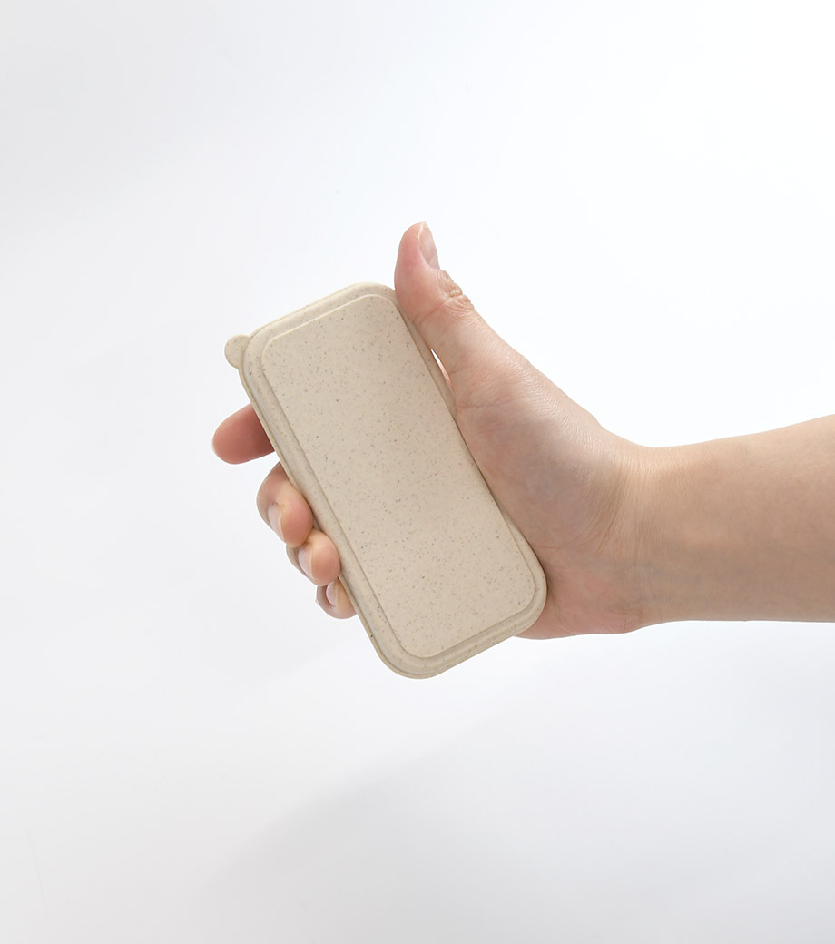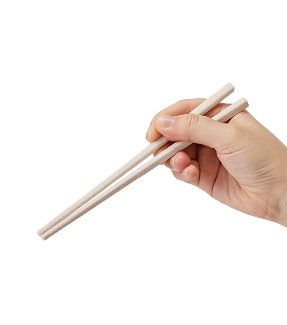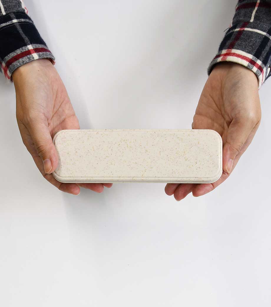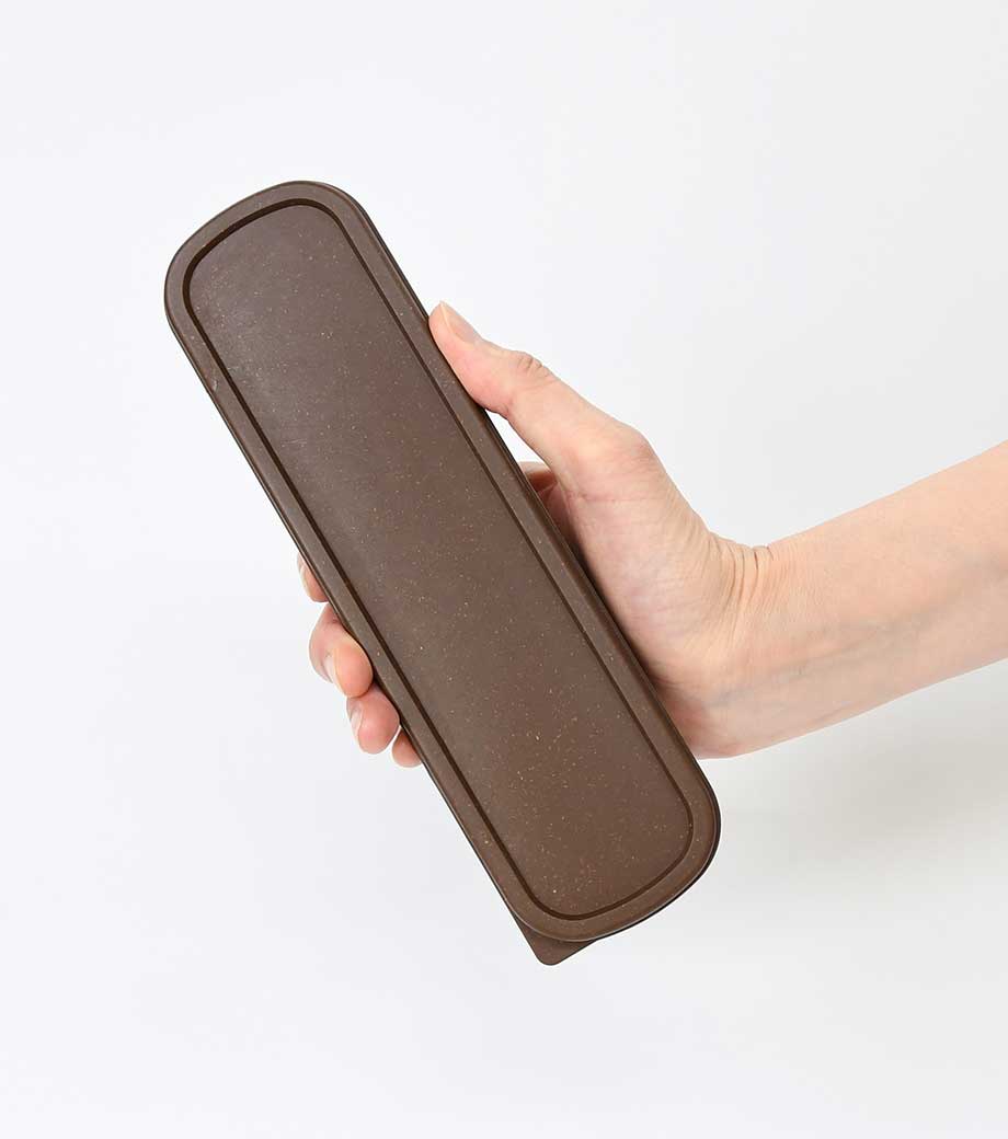 箸の下半分がケースで覆われているコンパクトなカトラリーです。ケースを付けると凹凸がないシルエットになるすっきりしたデザイン。ケースは先端が開く仕様なので、隅まできちんと洗えて衛生的です。箸はバンブーファイバーを25%以上配合したエコ素材を使用。環境に配慮したアイテムはSDGsへの取り組みをPRできます。