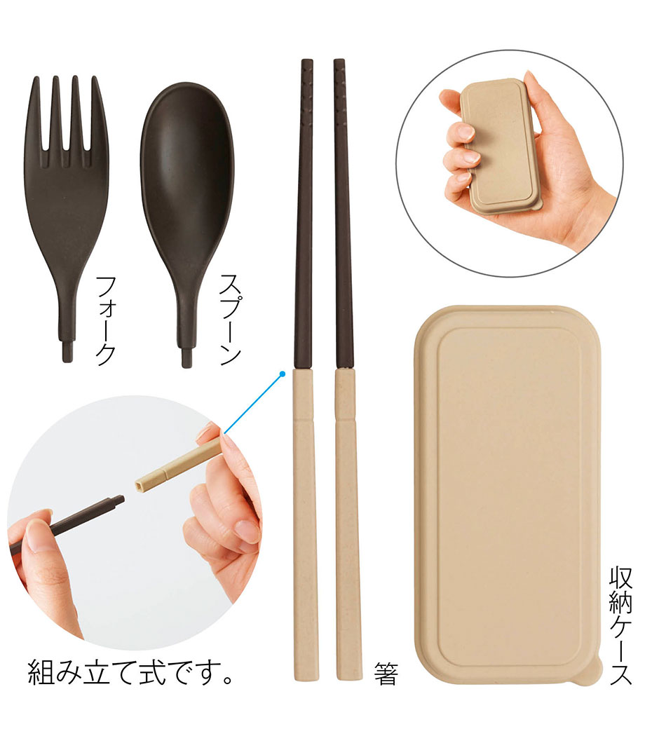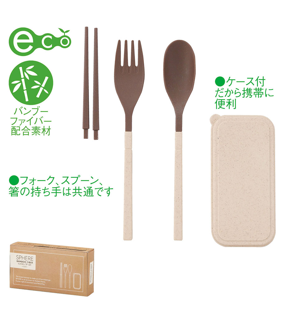 バンブーファイバー 携帯カトラリーセットは環境に配慮したカトラリー。箸、スプーン、フォークがセットになっていて便利な組み立て式。収納ケースにいれればコンパクトになり鞄に入れてもかさ張りません!
