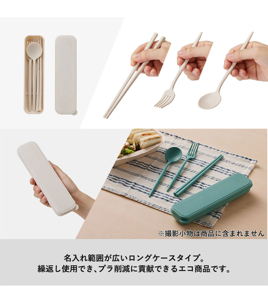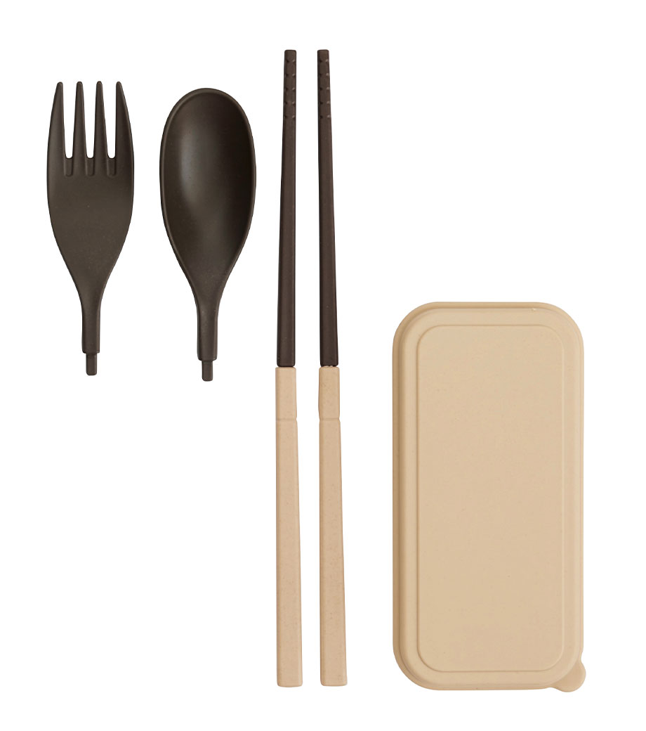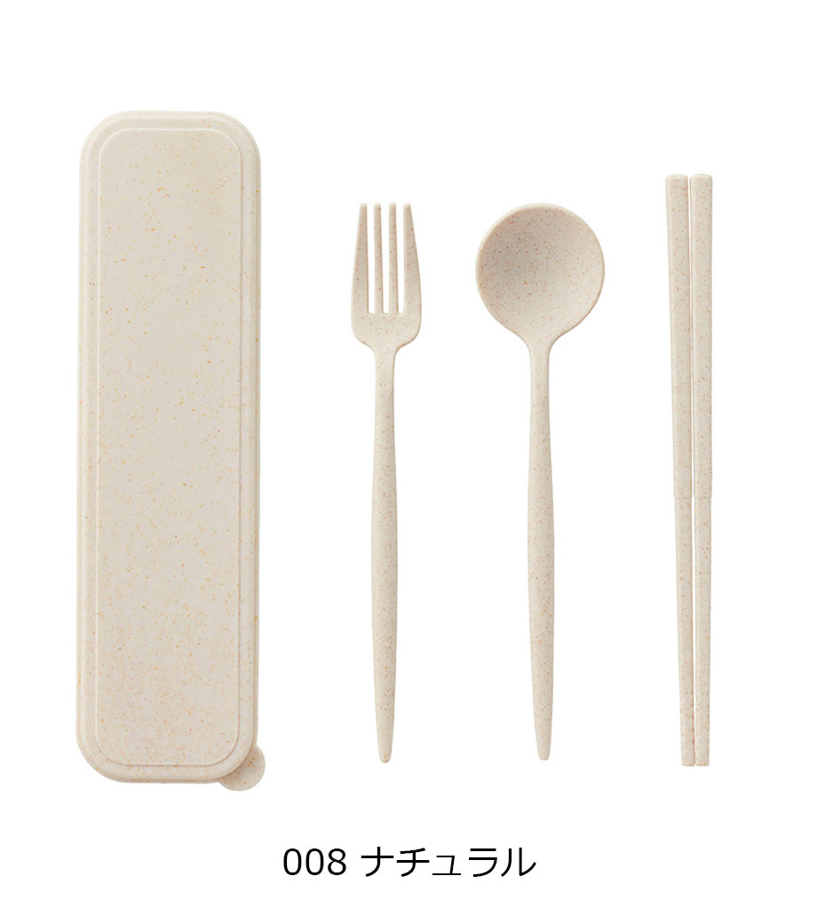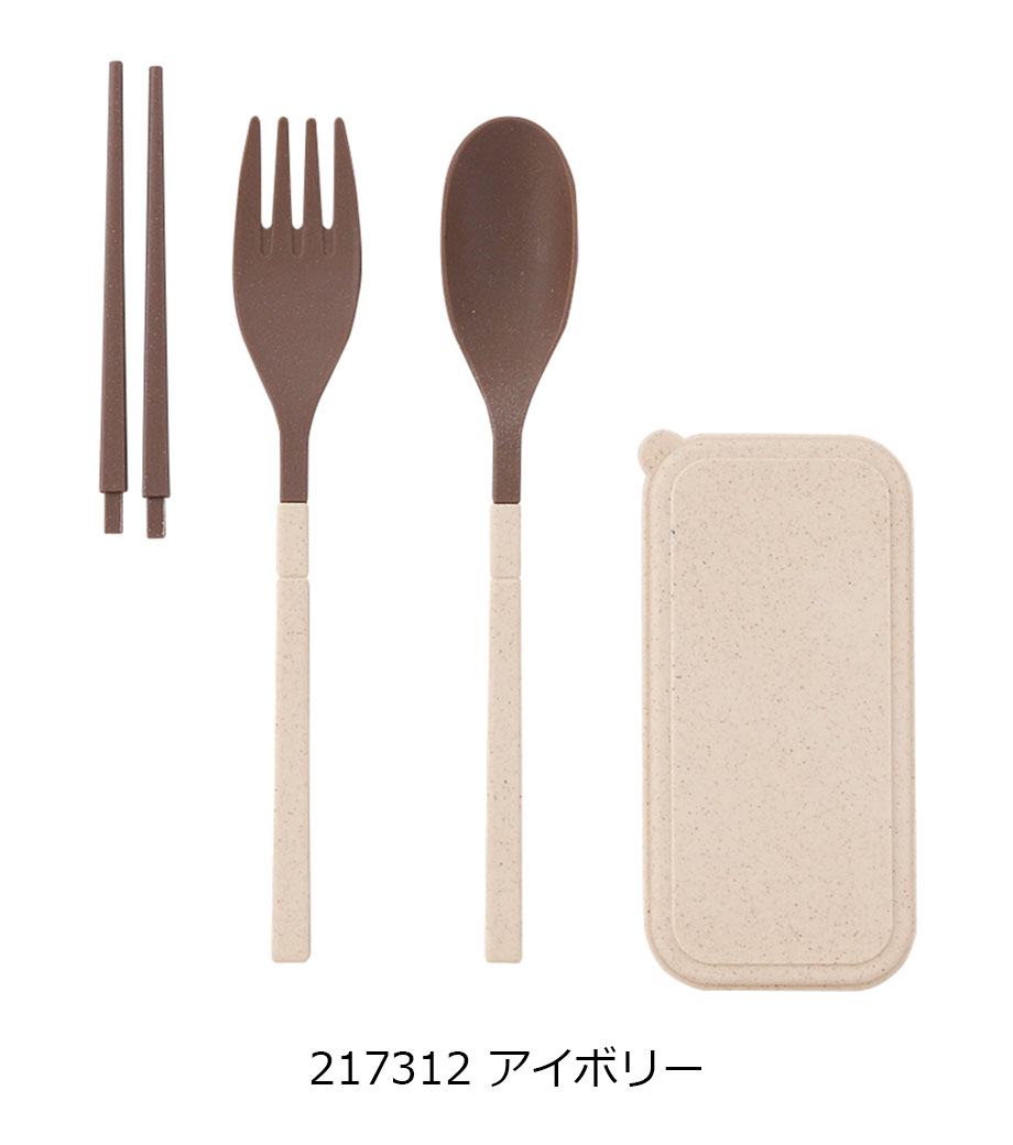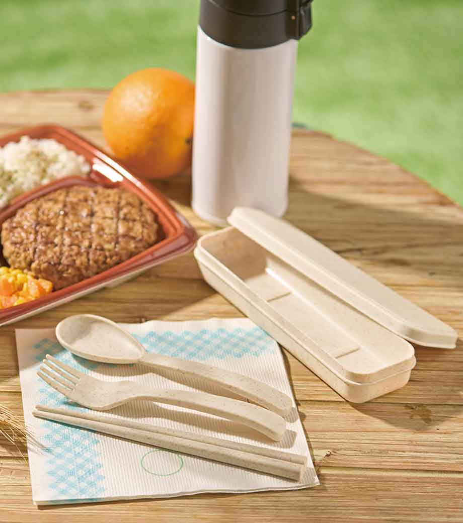 カトラリーセット 麦わら入は、スプーン、フォーク、箸の3点セットカトラリーです。廃棄される麦わらを原材料に配合することでプラスチックの使用料を抑えた環境にやさしいエコグッズ。麦を彷彿させるナチュラルな色合いで温かみを感じます。持ち運びに便利なケース付き。お弁当タイム・アウトドアやレジャーに大活躍です。