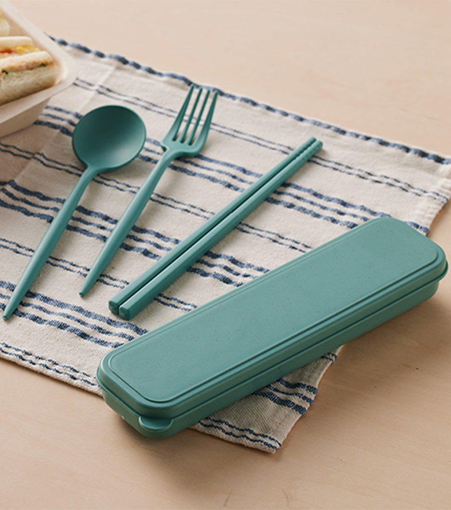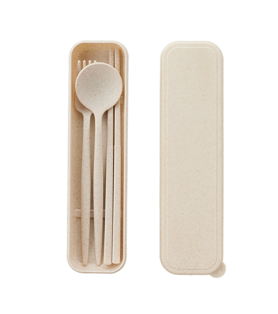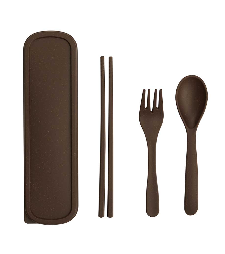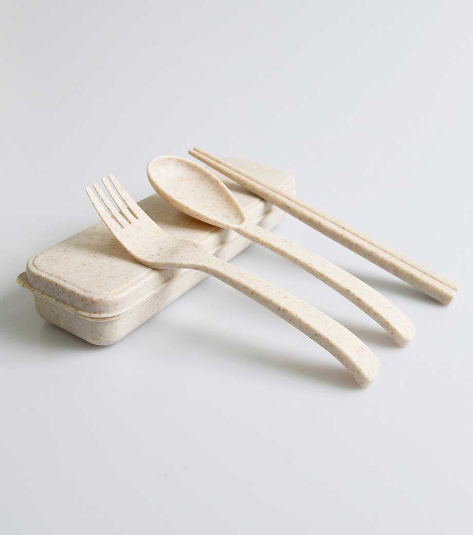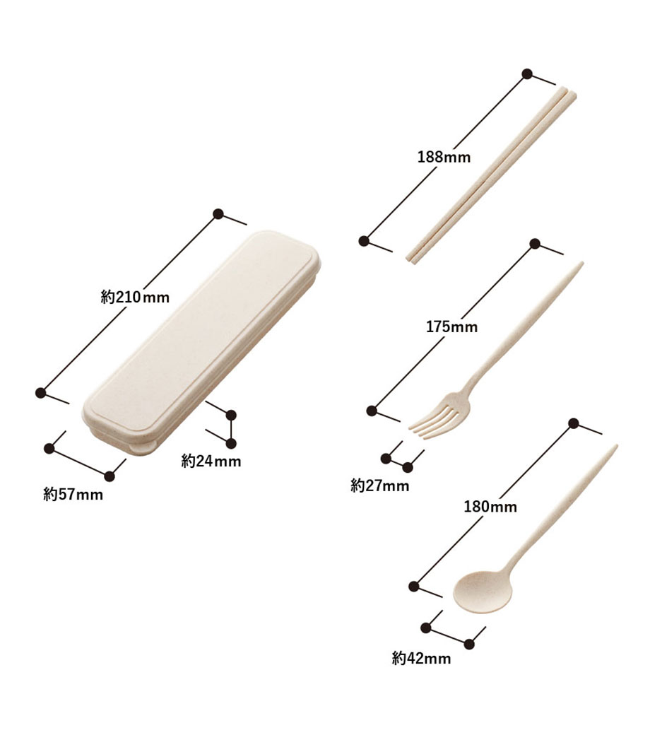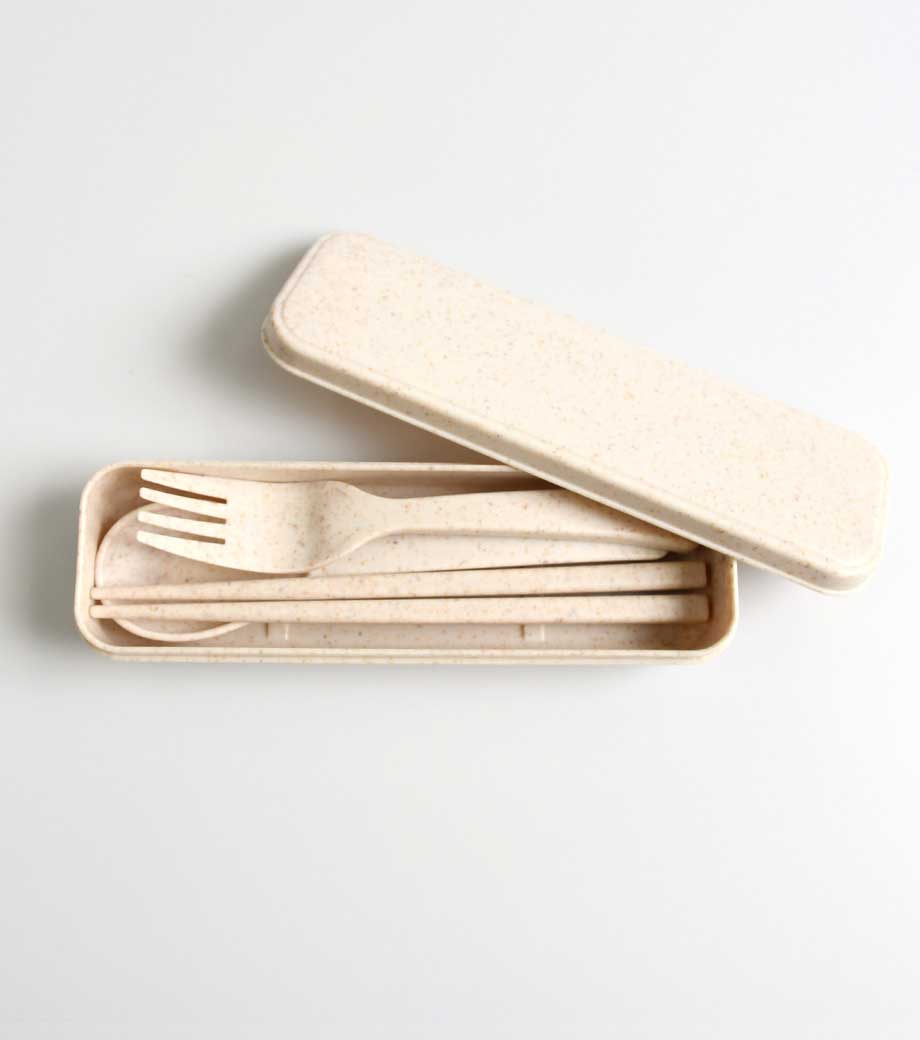 カトラリーセット 麦わら入は、スプーン、フォーク、箸の3点セットカトラリーです。廃棄される麦わらを原材料に配合することでプラスチックの使用料を抑えた環境にやさしいエコグッズ。麦を彷彿させるナチュラルな色合いで温かみを感じます。持ち運びに便利なケース付き。お弁当タイム・アウトドアやレジャーに大活躍です。