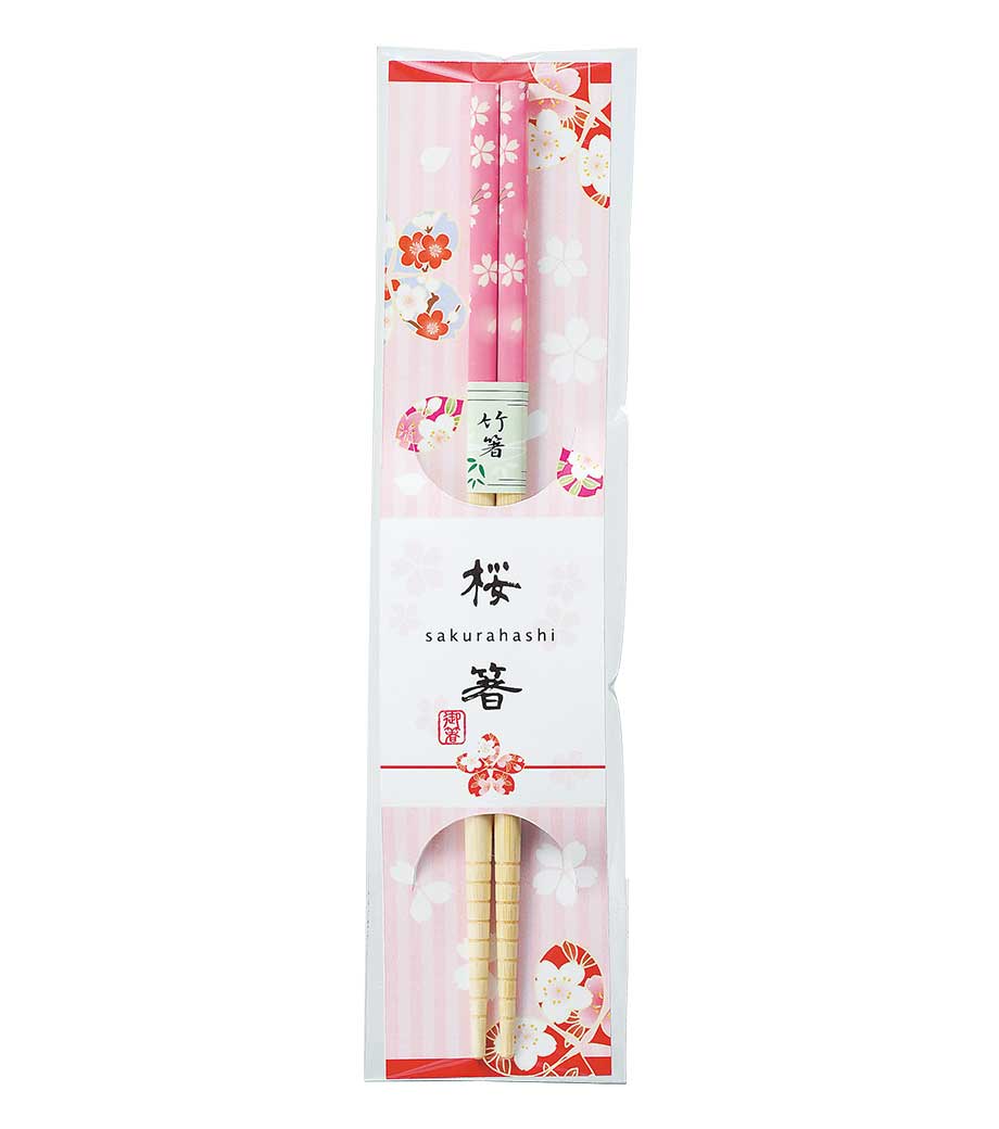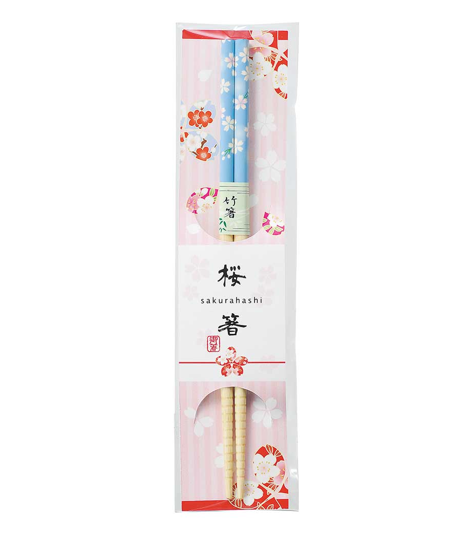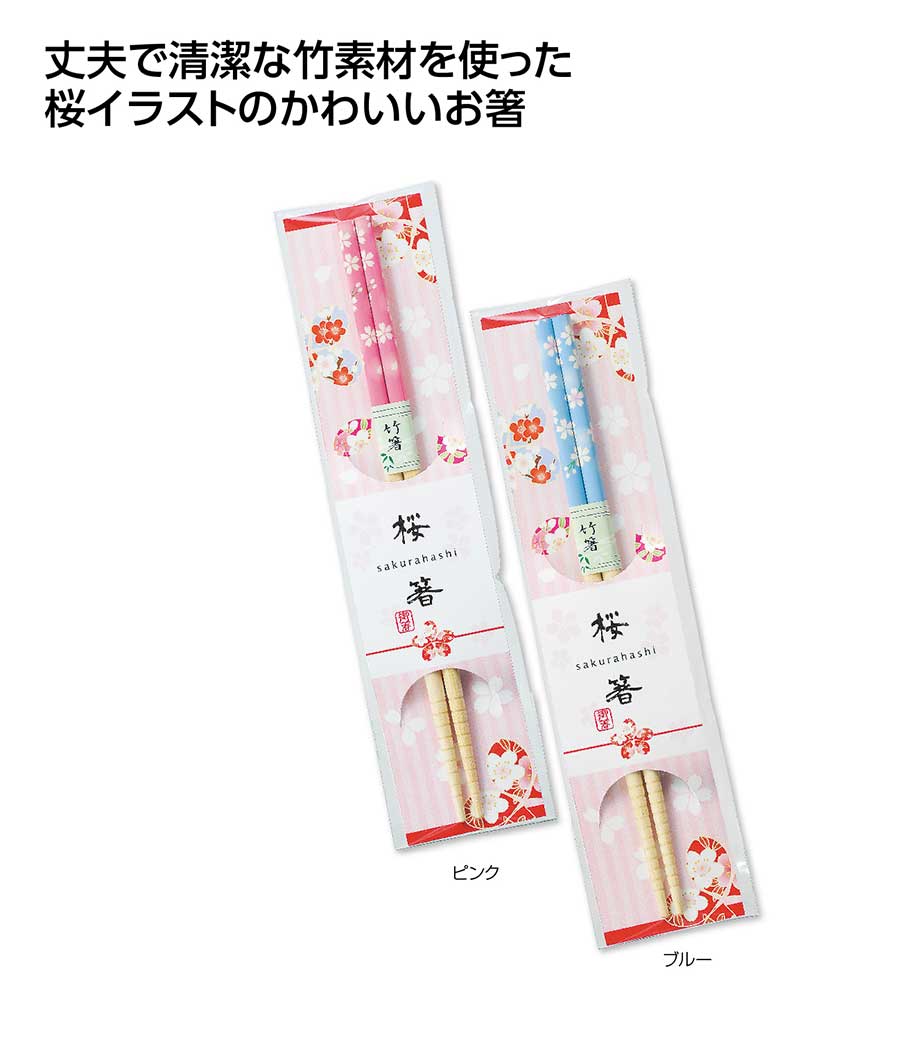 丈夫で清潔な竹素材を使用したさくら柄のお箸です。お箸の先は食材をつかみやすい先端加工が施されています。春の販促イベントにピッタリのアイテム。お渡ししやすい桜デザインの台紙付きパッケージで、ピンク・ブルーの2色取混ぜでお届けします。インバウンド向けのプレゼントやノベルティにおすすめです。