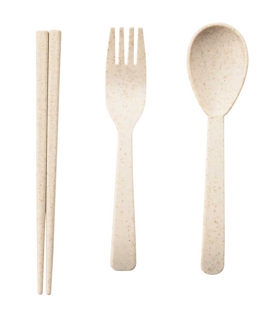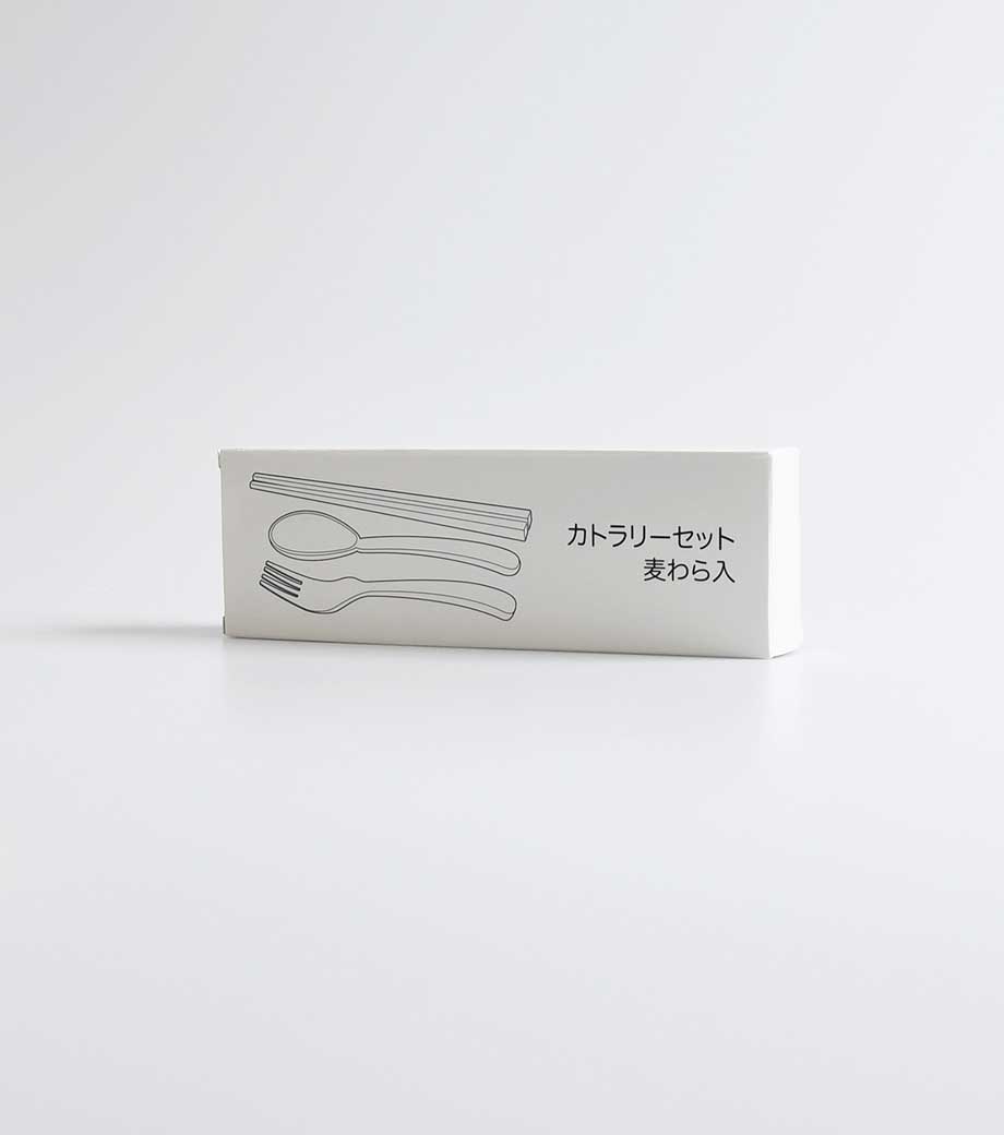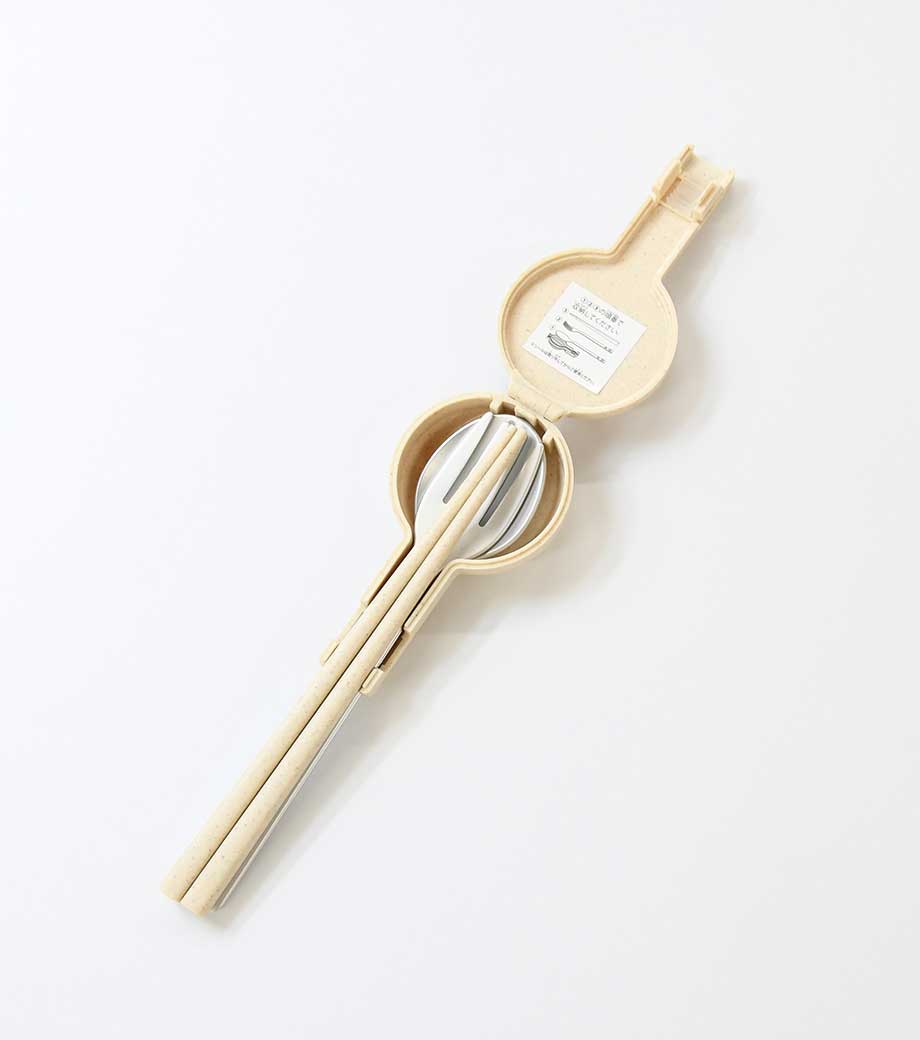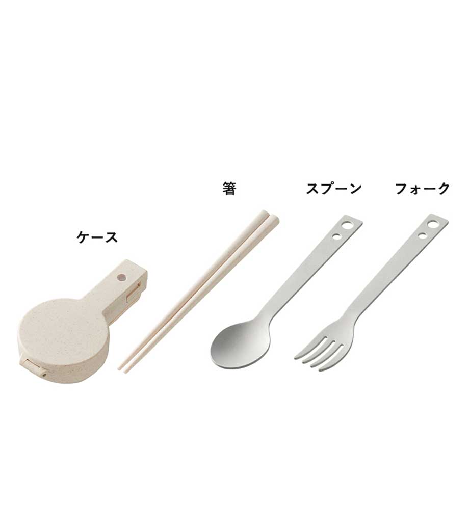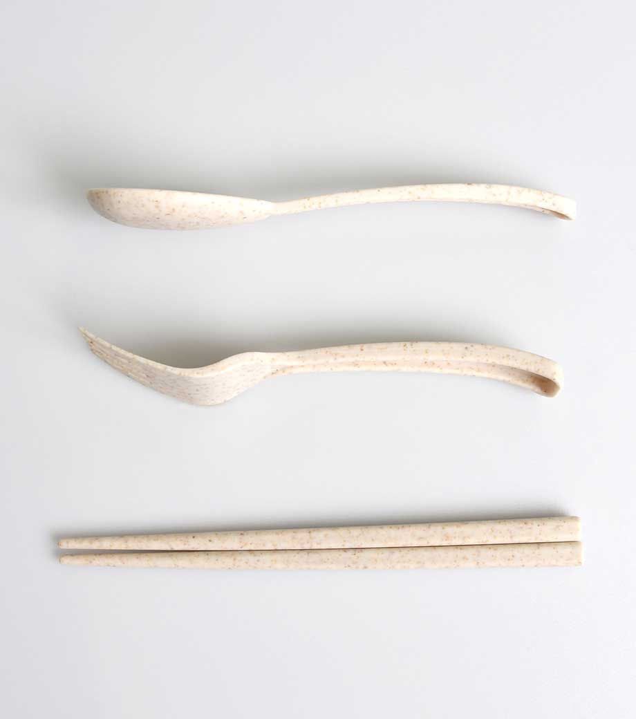 お箸・スプーン・フォークの3点セット。お箸のすべり止めや、フォークの深い切り込みなど使いやすさにもこだわりがあります。環境だけでなく使う人にもやさしいアイテムですよ。