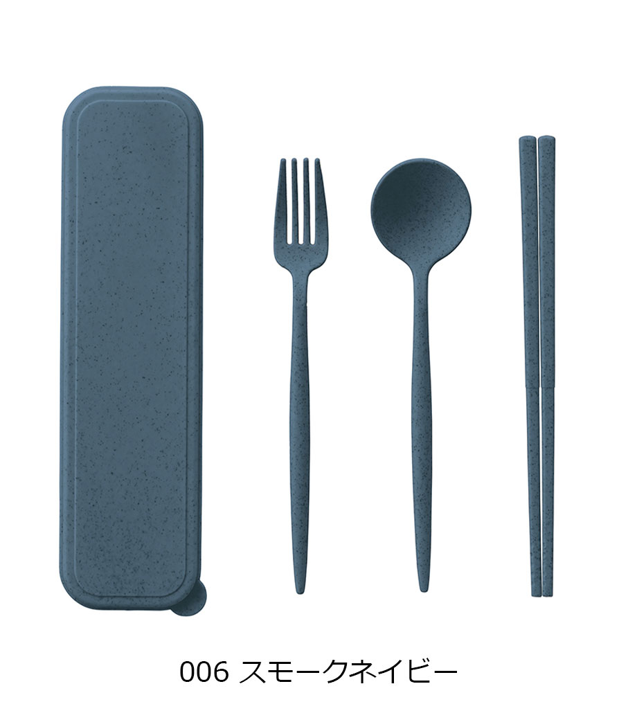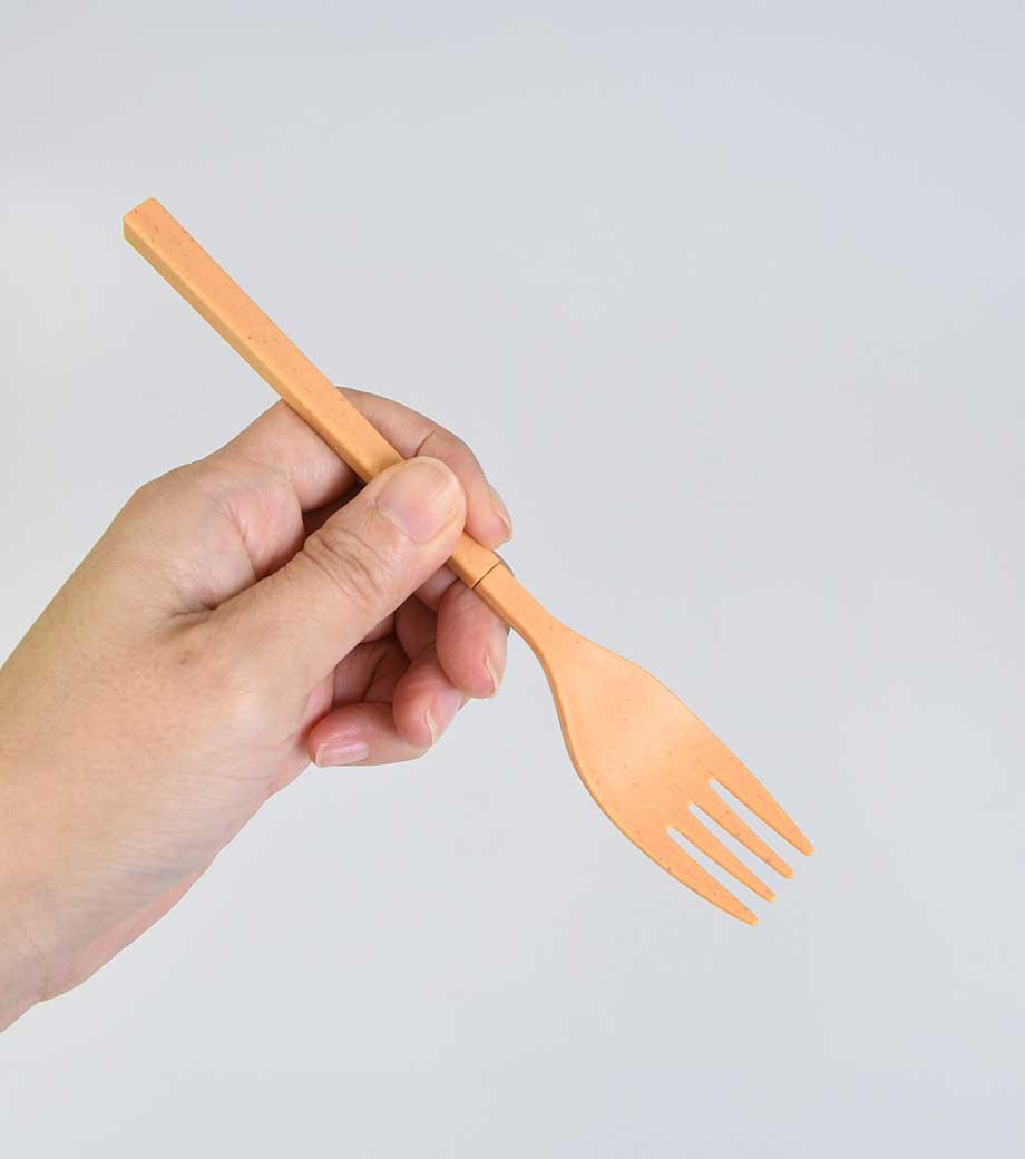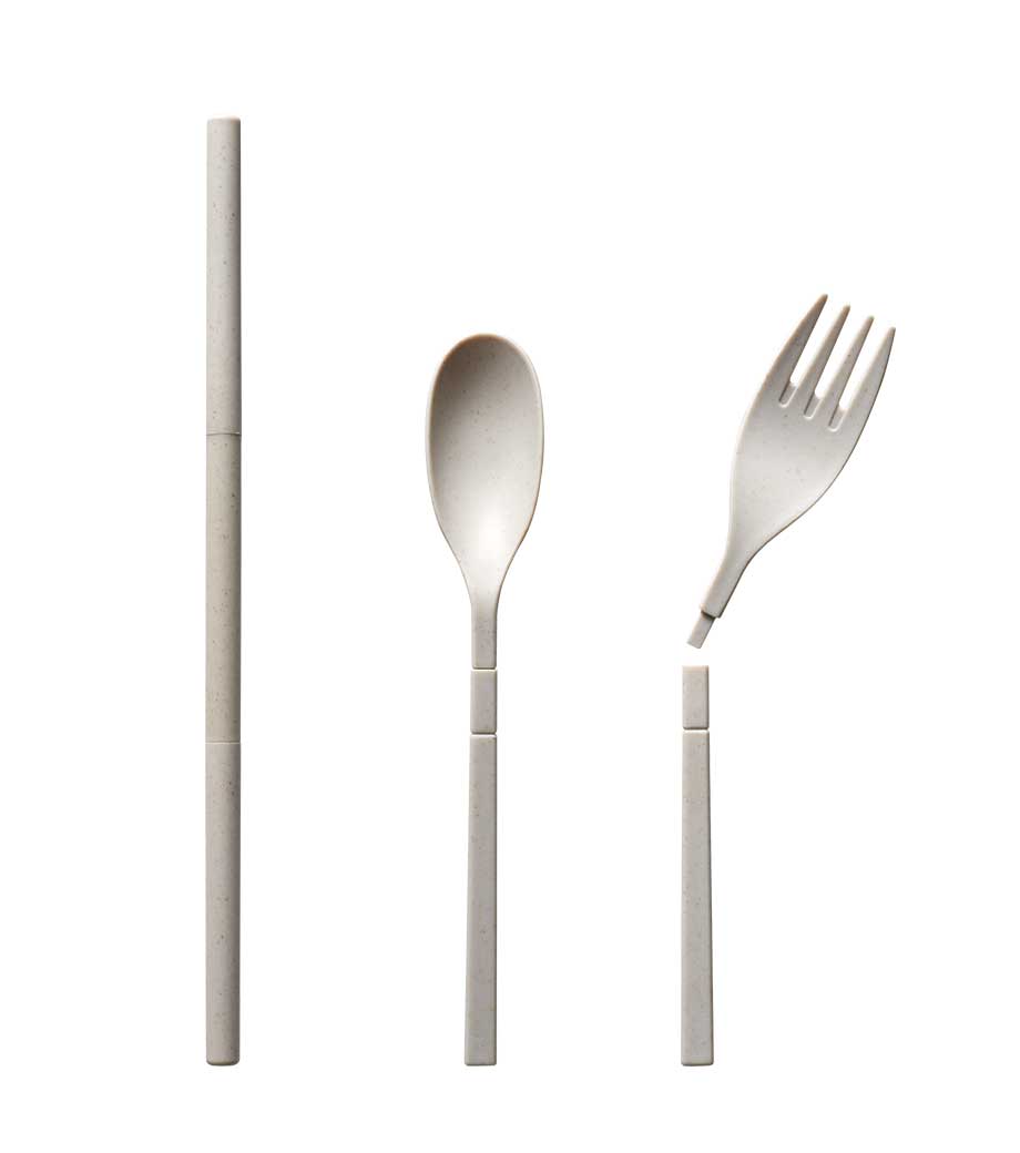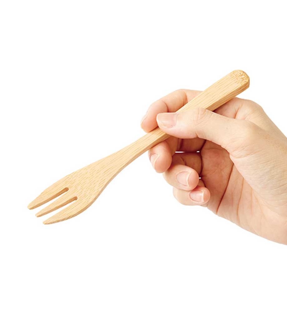 お箸・スプーン・フォークの3点セット。お箸のすべり止めや、フォークの深い切り込みなど使いやすさにもこだわりがあります。環境だけでなく使う人にもやさしいアイテムですよ。