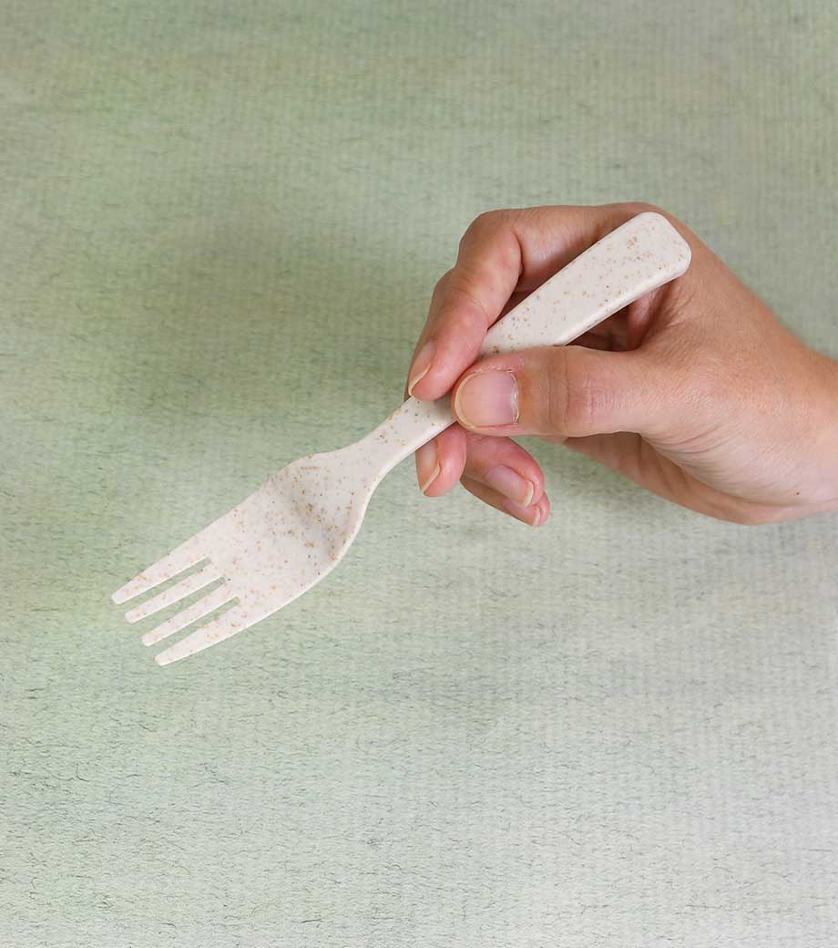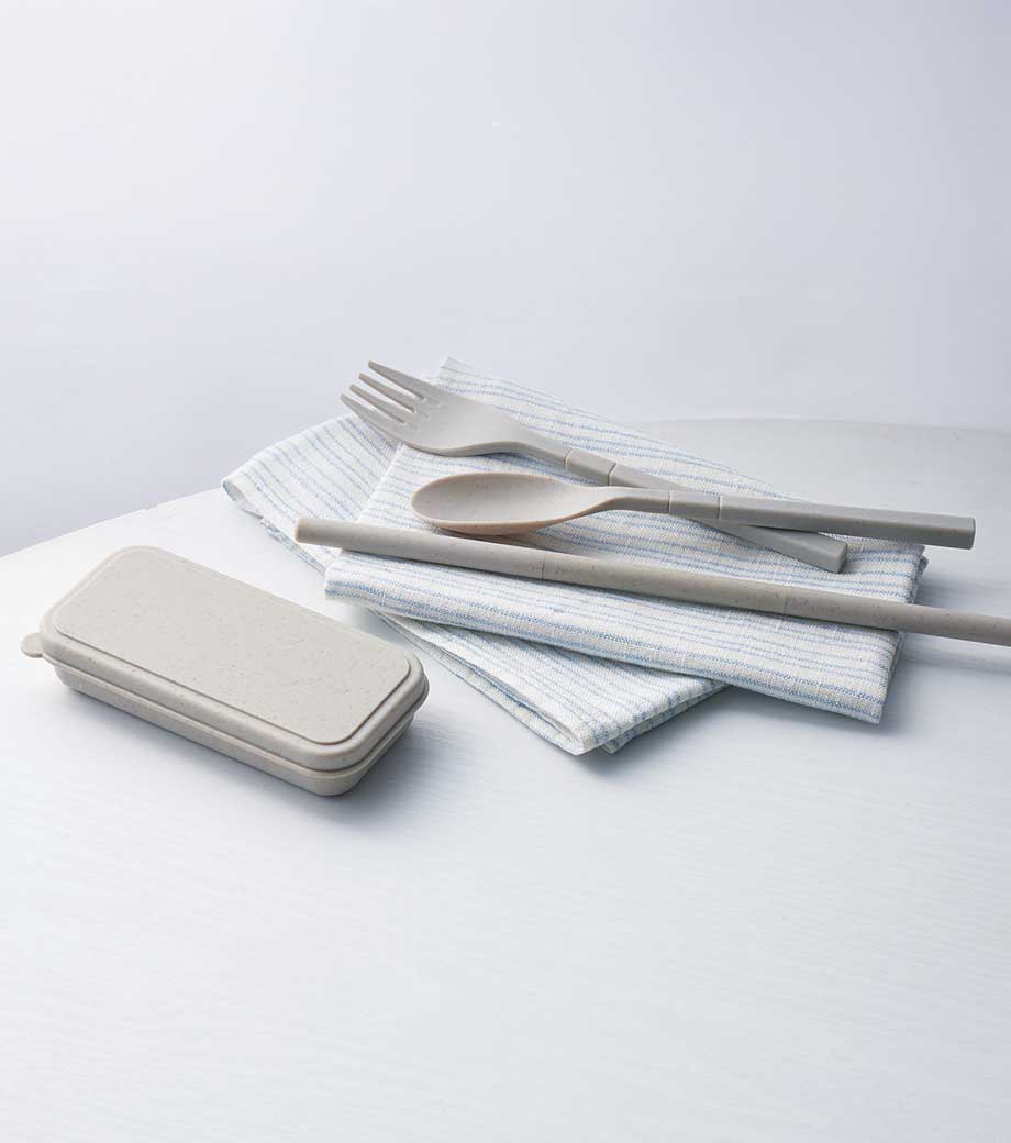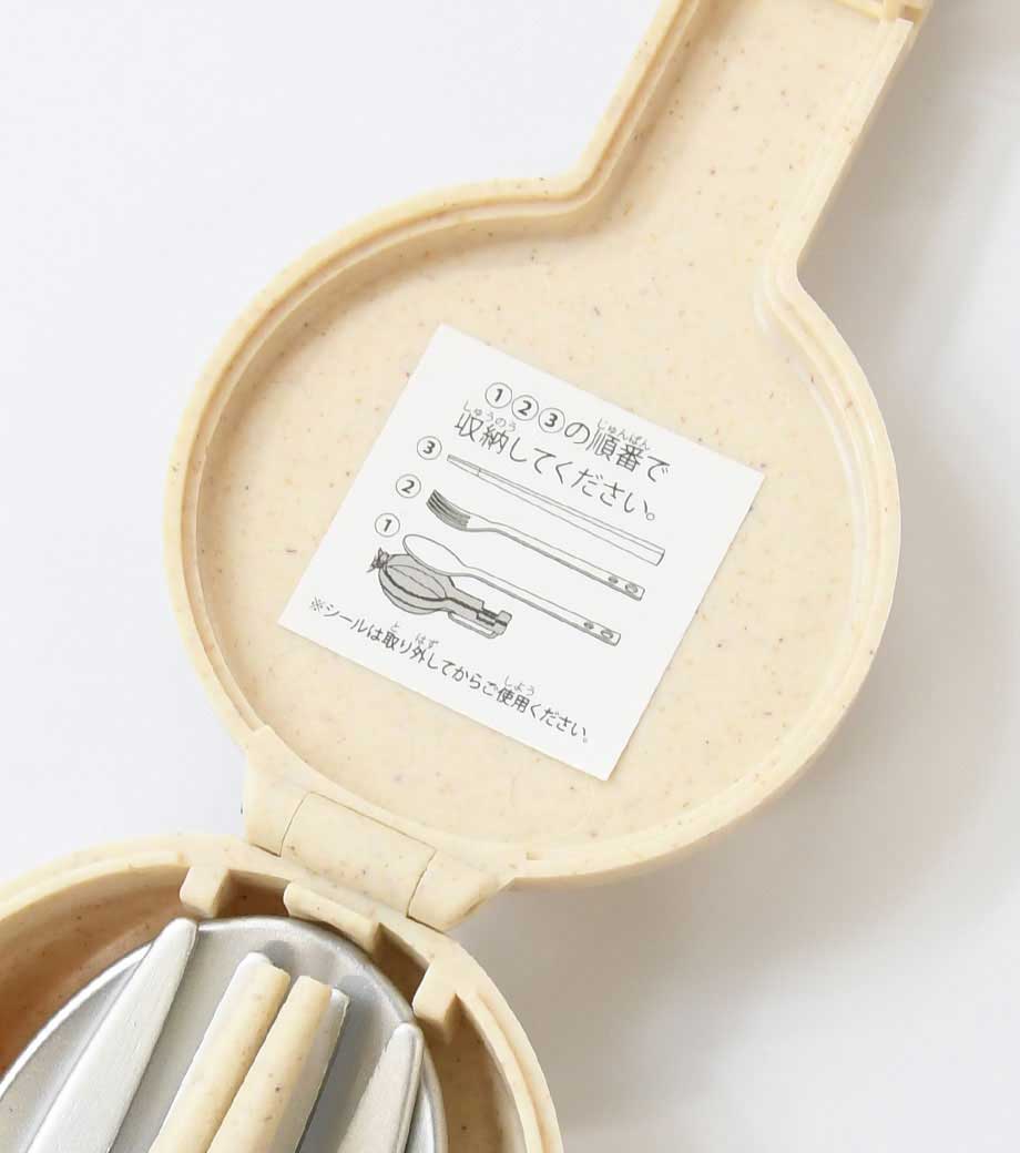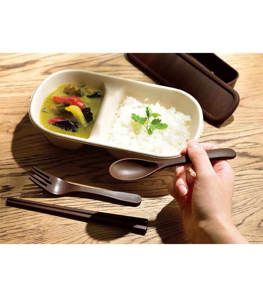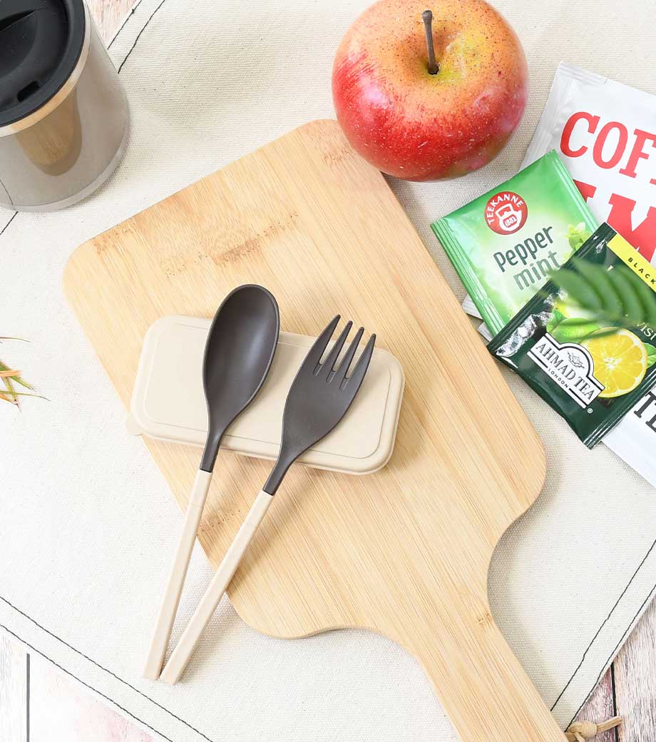 お箸・スプーン・フォークの3点セット。お箸のすべり止めや、フォークの深い切り込みなど使いやすさにもこだわりがあります。環境だけでなく使う人にもやさしいアイテムですよ。