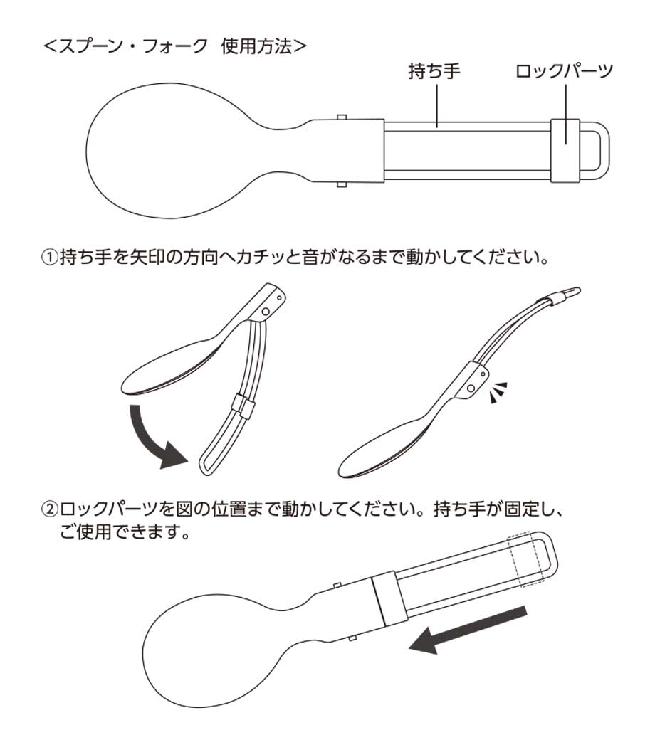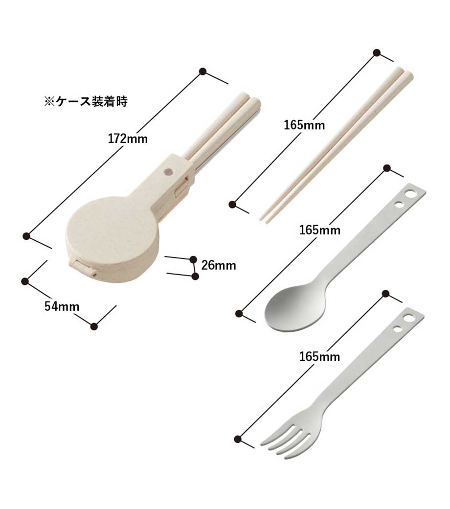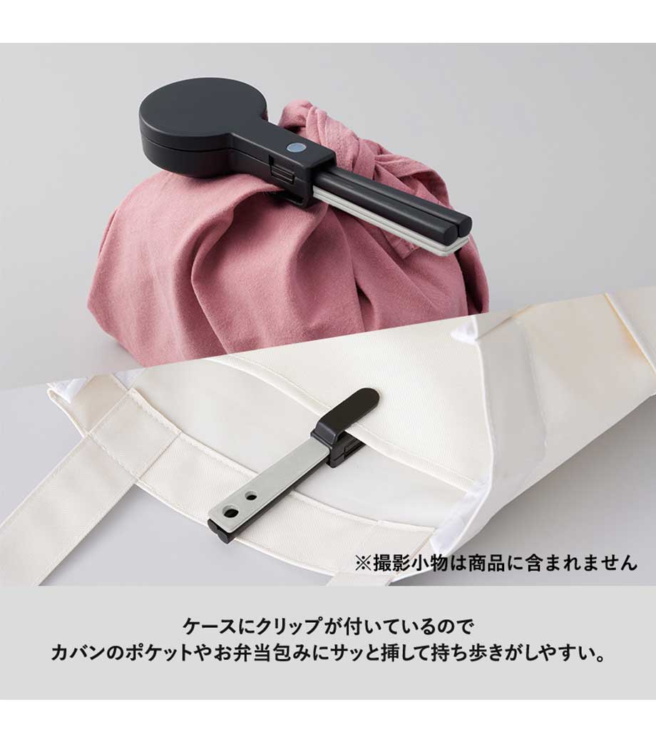 本体は持ち手部分と先端パーツを取り換えることで、箸またはスプーン・フォークとして使えます。ケースの蓋は便利な片開タイプ。お手持ちのカラビナなどを通せるストラップ穴付きで、ランチバッグなどに提げて携帯できます。