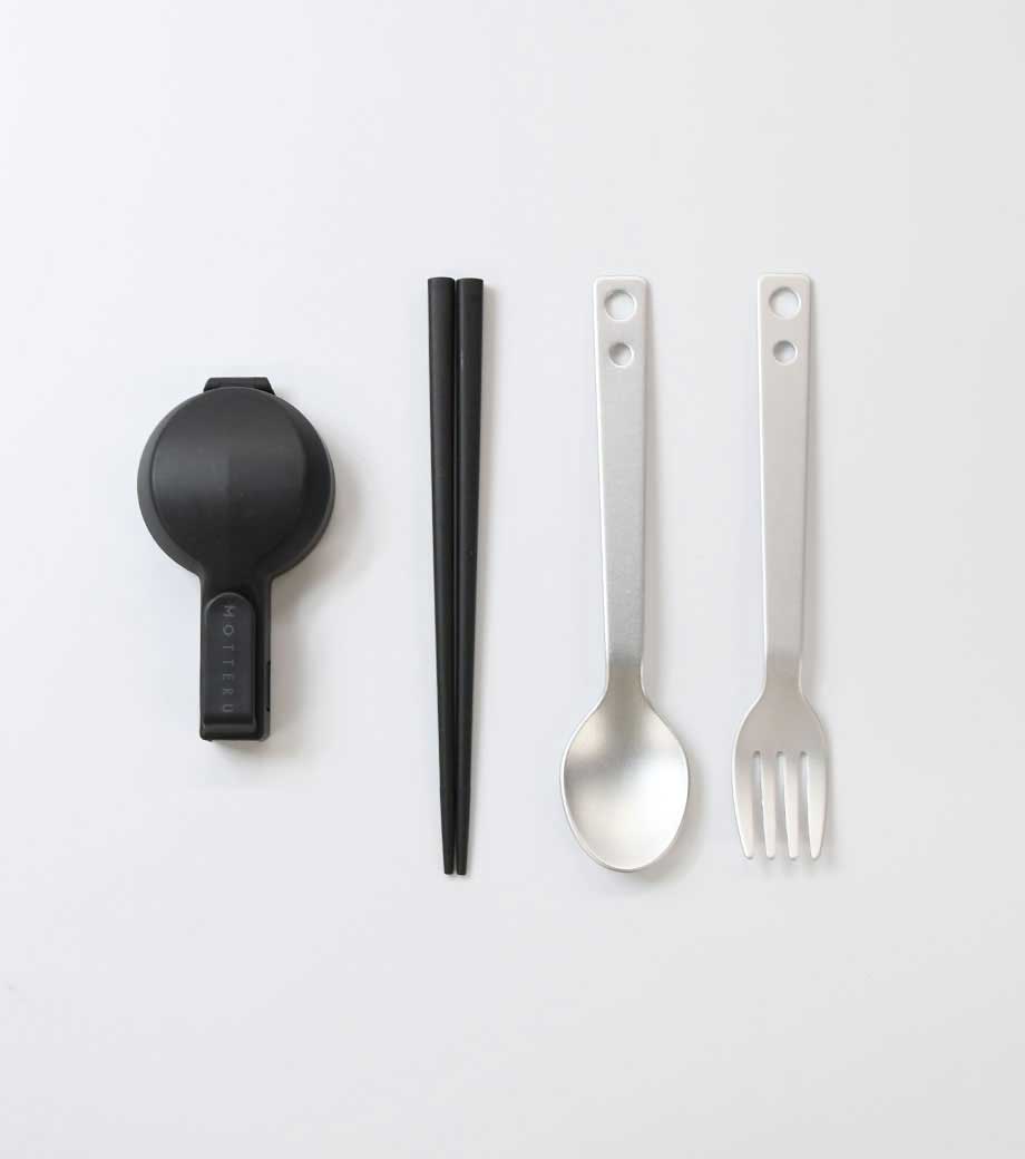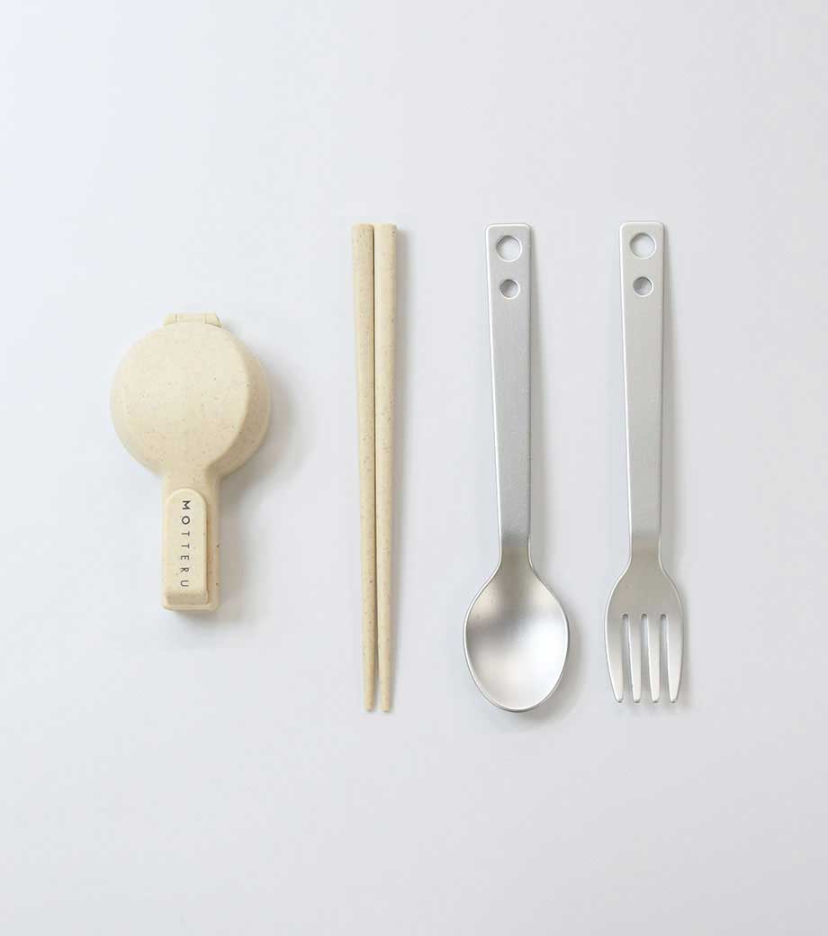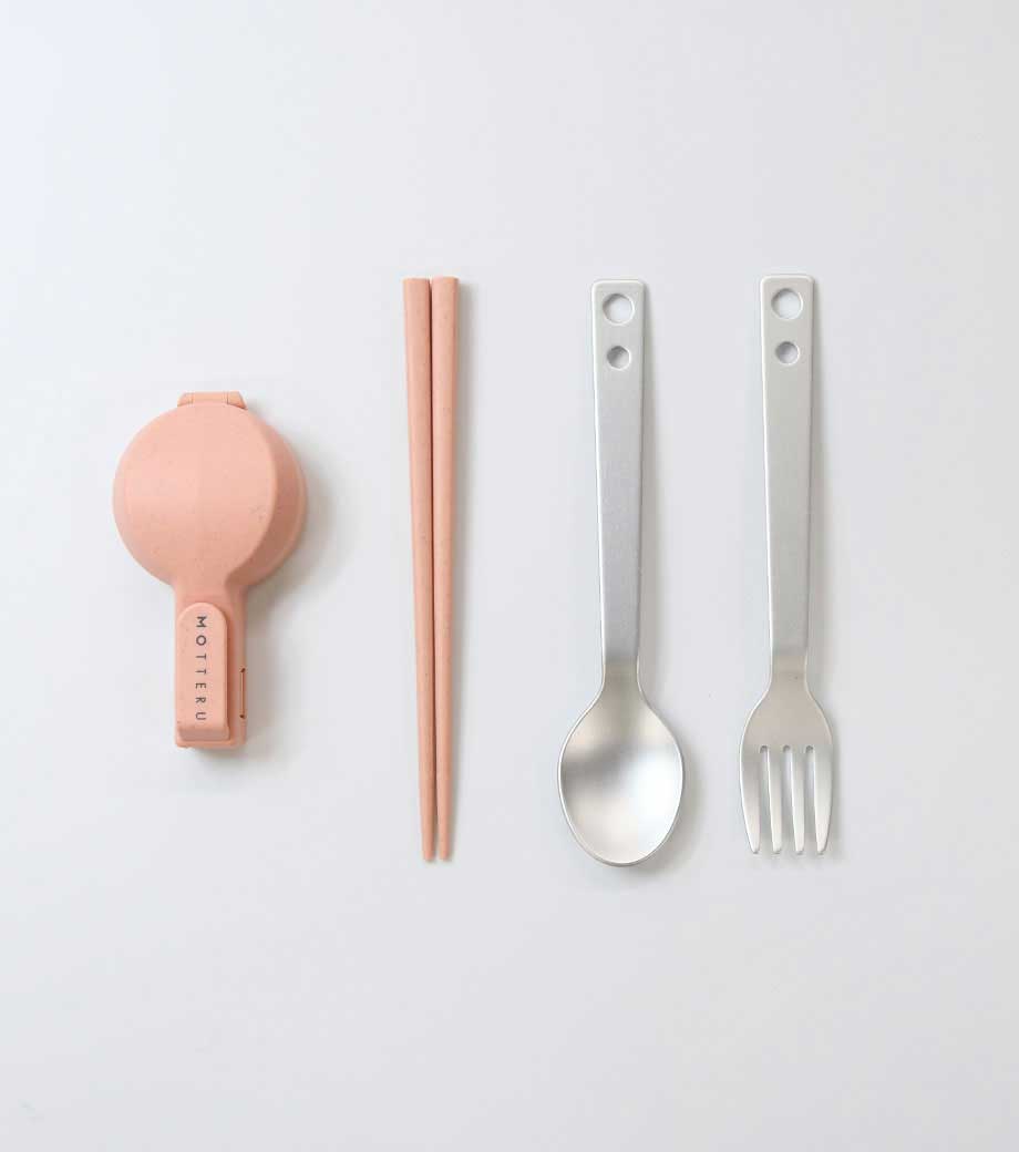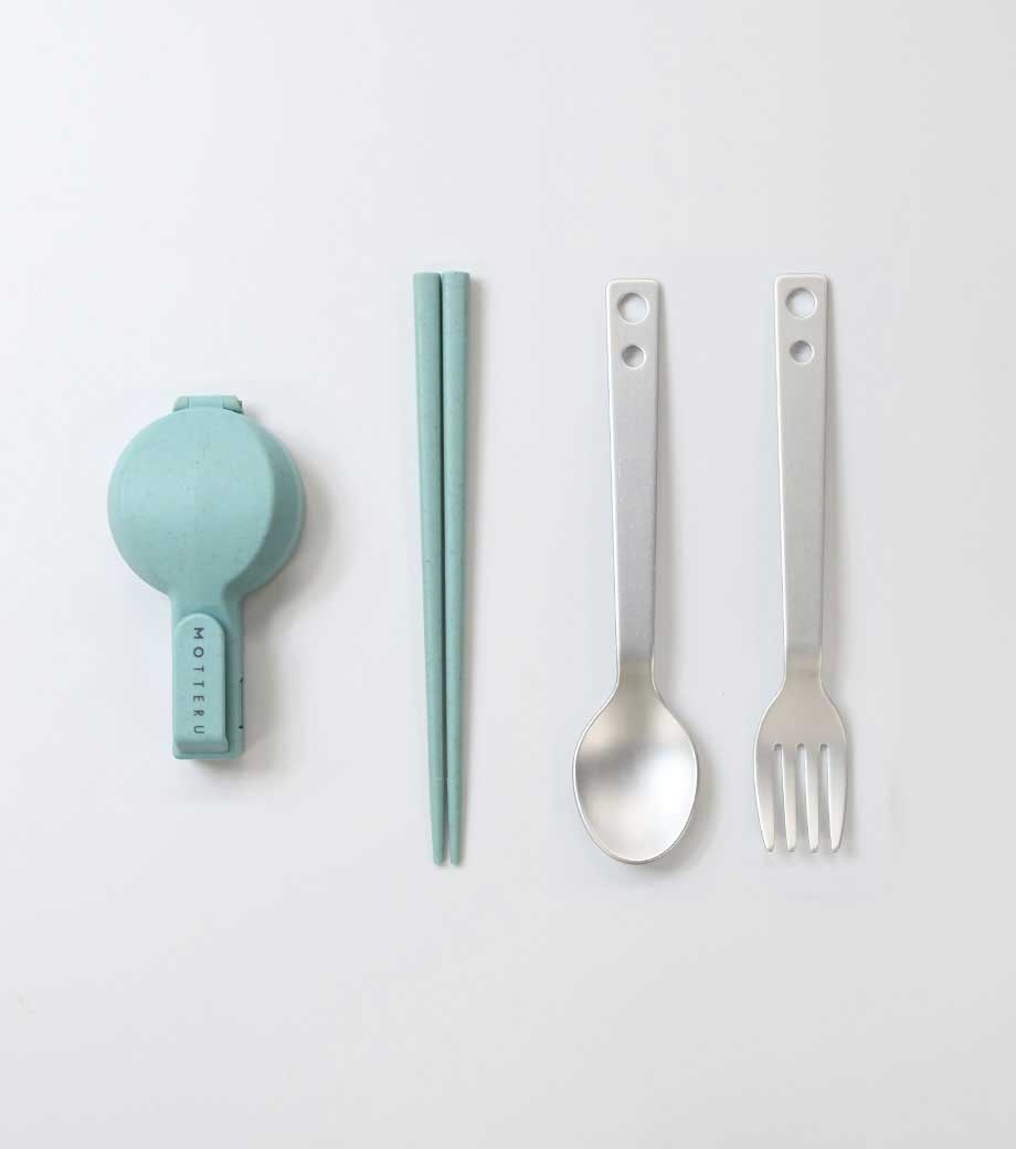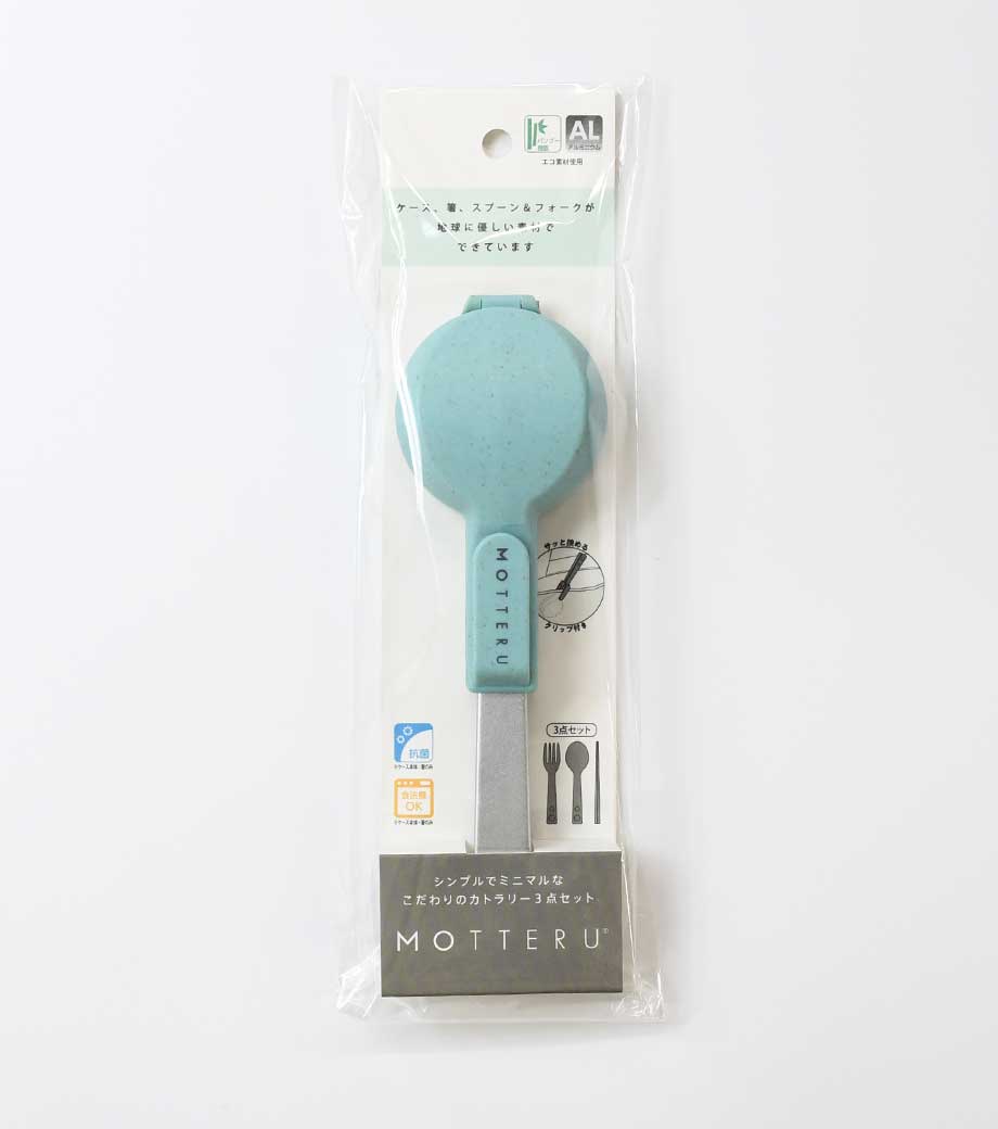 【MOTTERU】カトラリーセットはエコ素材を使用した持ち運びに便利な3点セット。ケース・箸にはバンブーファイバーを配合し、プラスチック削減に貢献。嬉しい抗菌加工です。スプーン・フォークにはプラスチックより少ないエネルギーでリサイクルできるアルミ素材を使用しています。