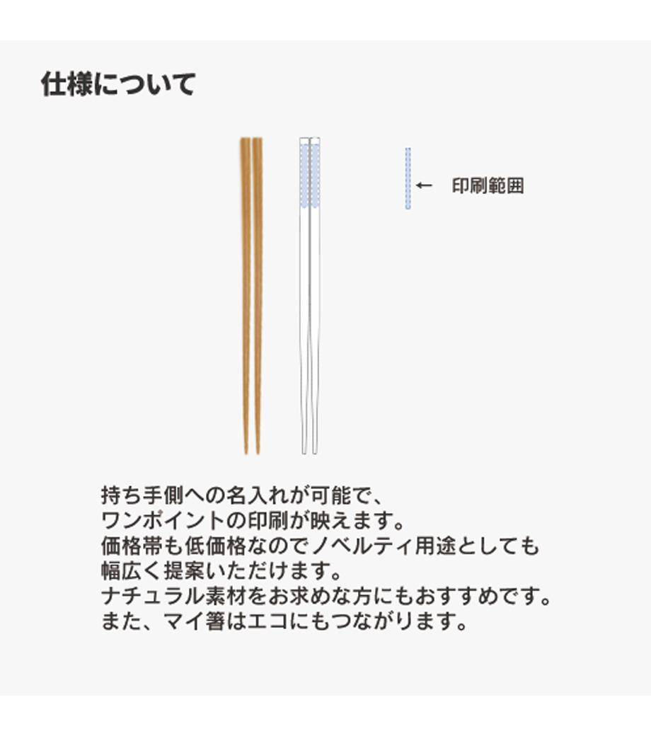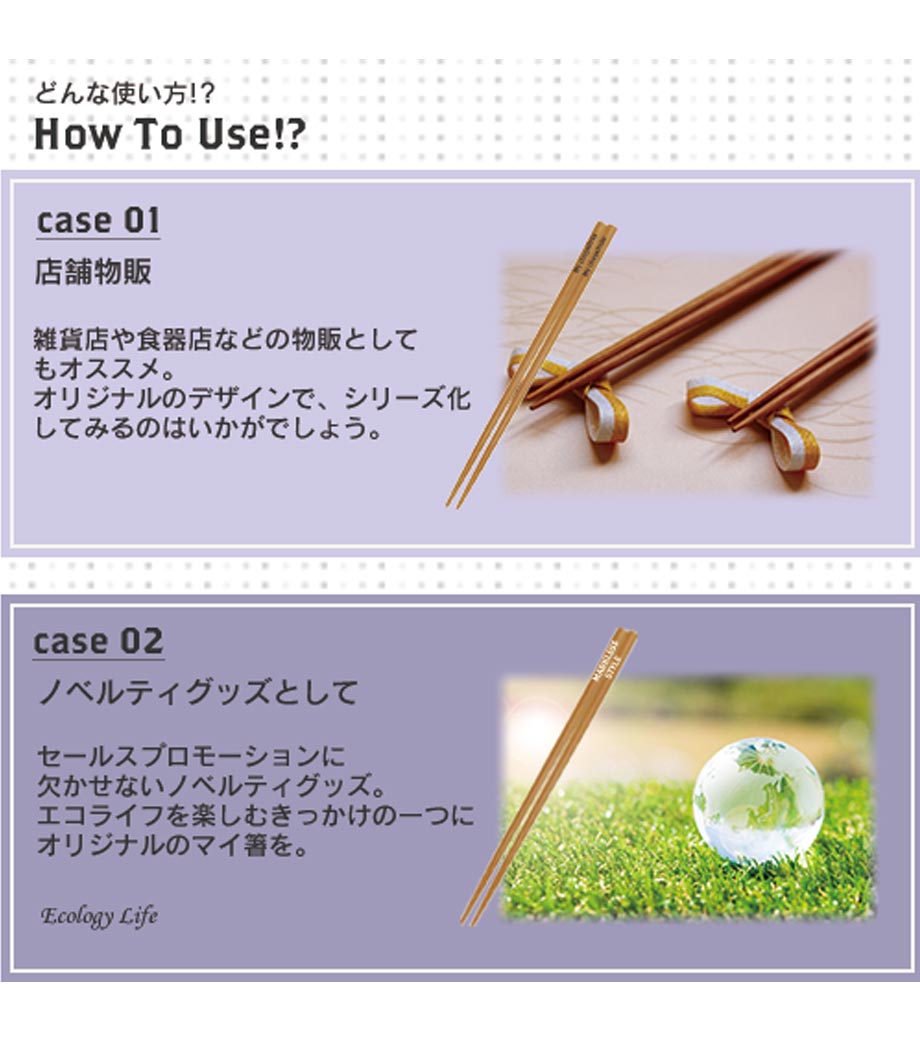 お箸かケースに1色印刷可能。ロゴを名入れし、オリジナルのエコグッズを制作してはいかがでしょうか。イベントやキャンペーンのノベルティにおすすめです。