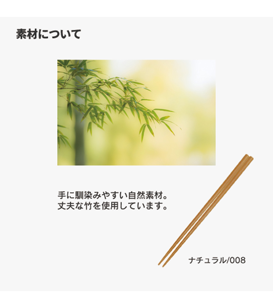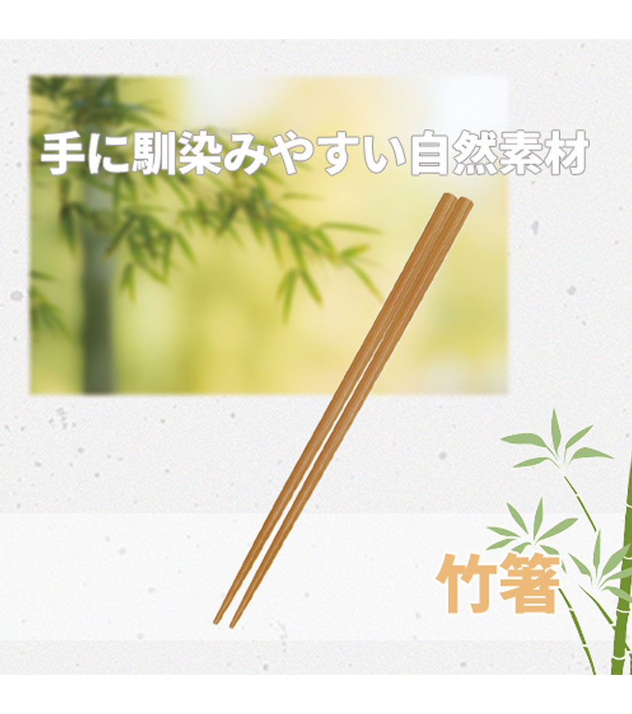 毎日使うお箸は、結構くたびれていても使い続けてしまうもの。新しいお箸に替えてみませんか。「ナチュラル竹箸」は、天然竹で作ったシンプルで丈夫なお箸。自然素材だから手に馴染みやすく、どなたにもご愛用いただけます。