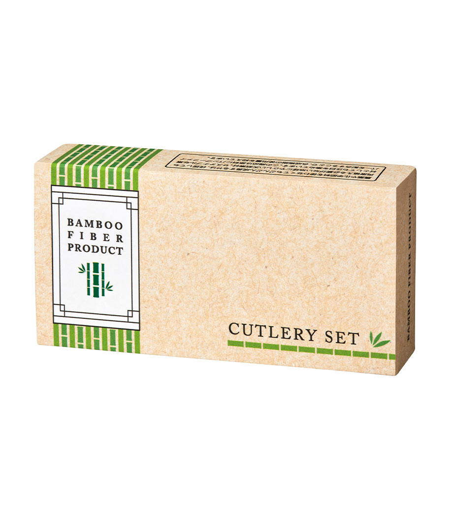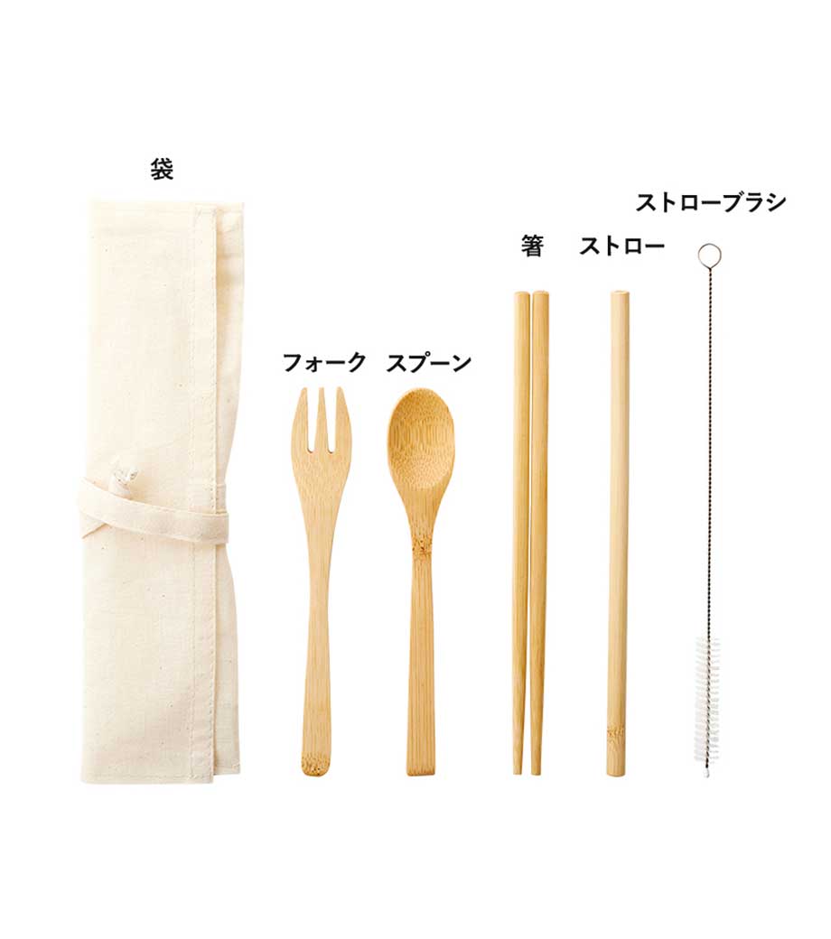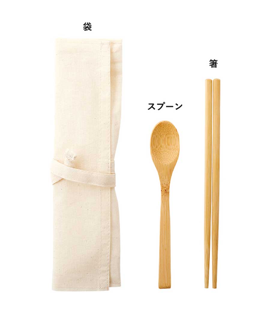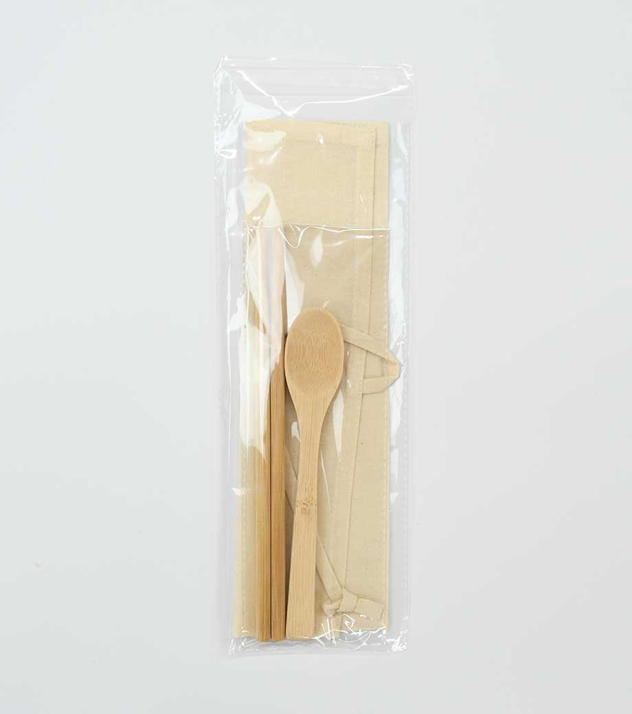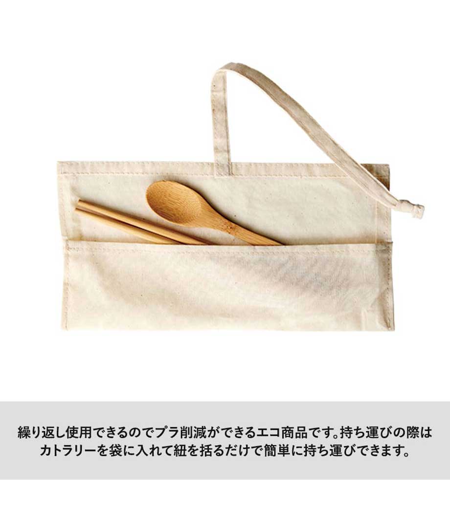 カトラリーには竹を使用しており、コットン素材のケースと相まってナチュラルな印象です。デザイン入り化粧箱に入れてお届けします。