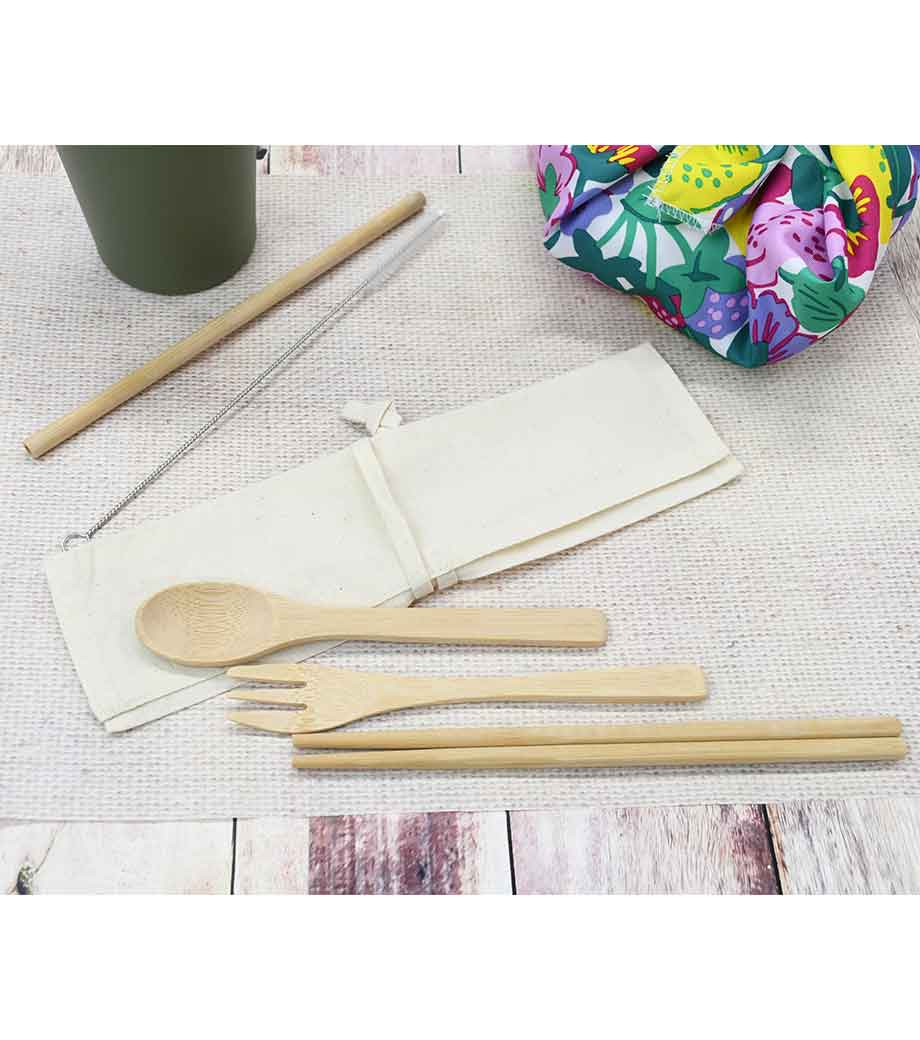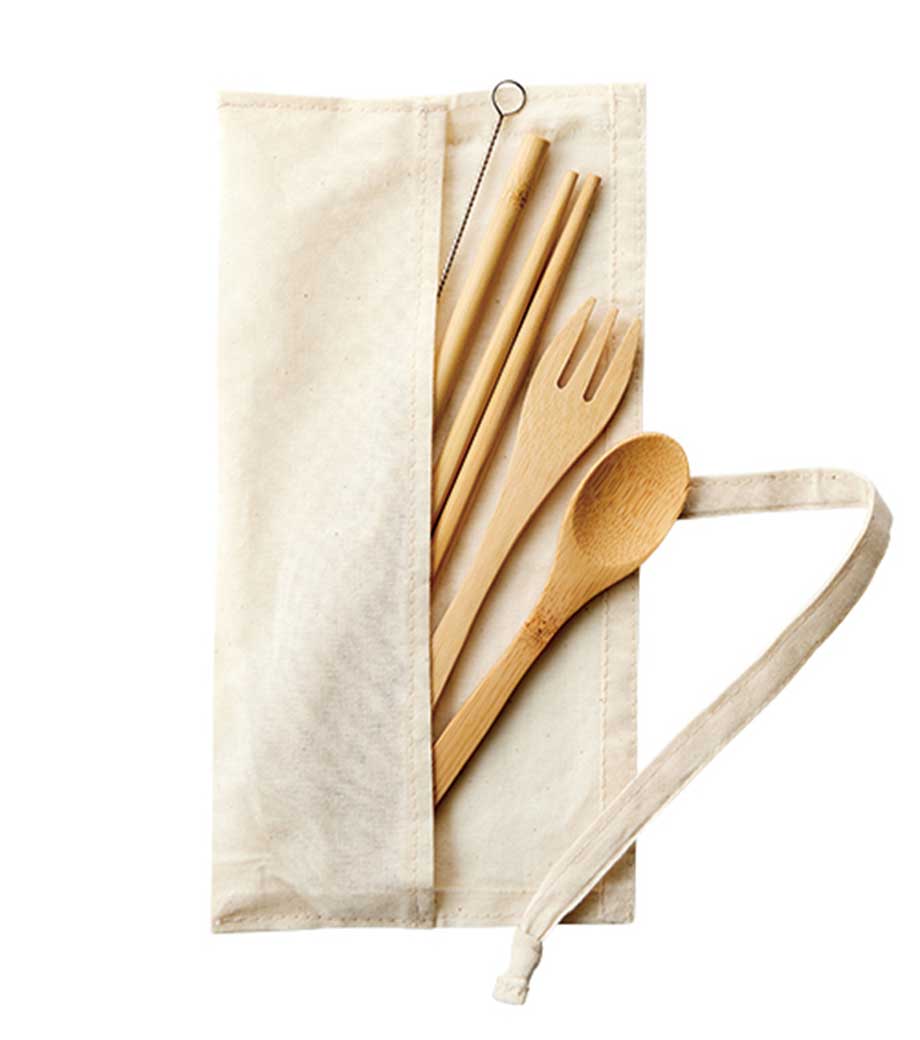 プラスチックスマート バンブーカトラリーセットは、竹製のフォーク・スプーン・箸と持ち運びに便利な巾着のセットです。マイカトラリーがあれば、毎日のお弁当やレジャーで繰り返し使えてエコ。