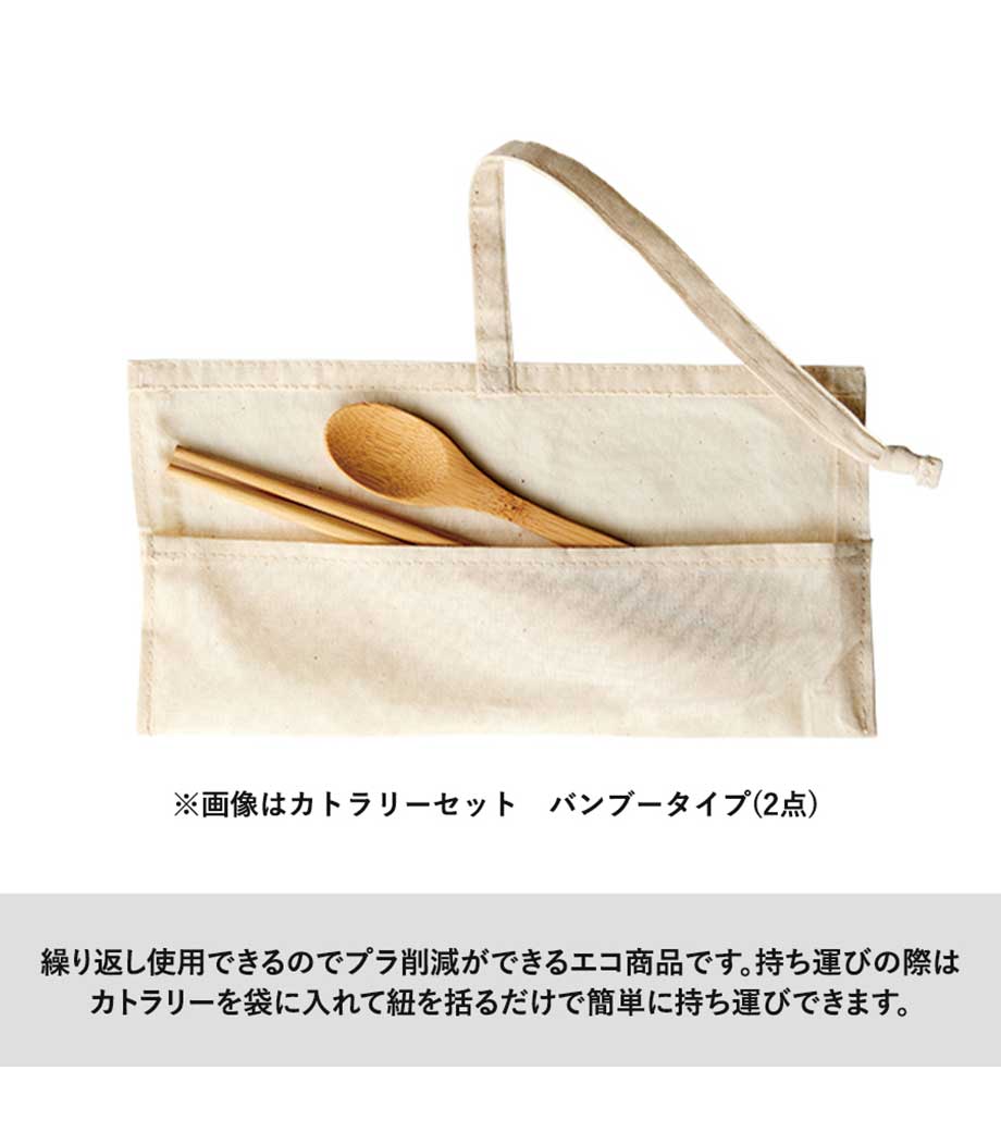 カトラリーセット バンブータイプ(2点)は、天然の竹で作られたお箸とスプーンのセット。持ち運びに便利なコットン素材のケース付きです。学校やオフィスでのランチタイムにぴったりですね。マイカトラリーがあれば、コンビニやスーパーでプラスチック製カトラリーを貰わずに済みます。身近なところからエコ活動に貢献できますよ。