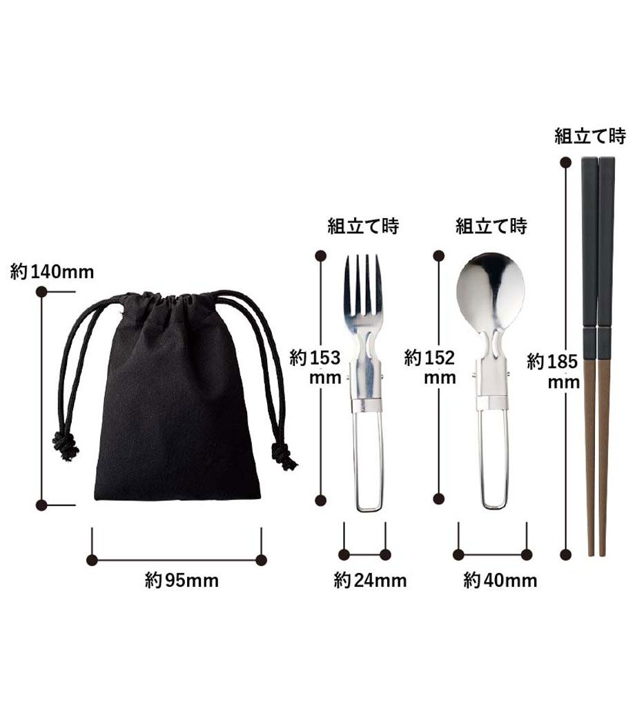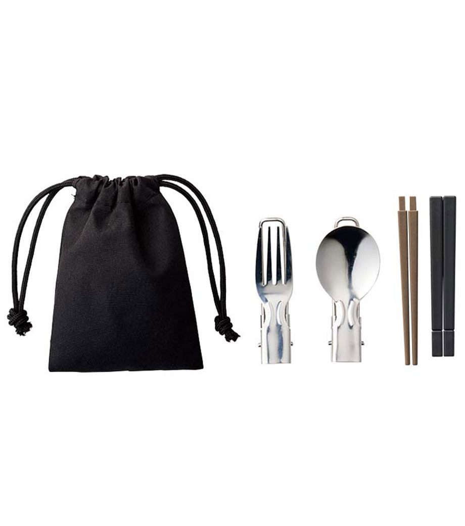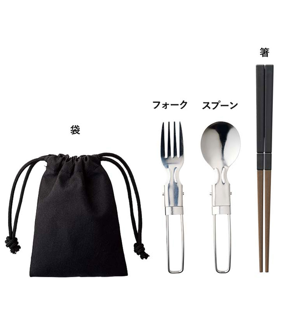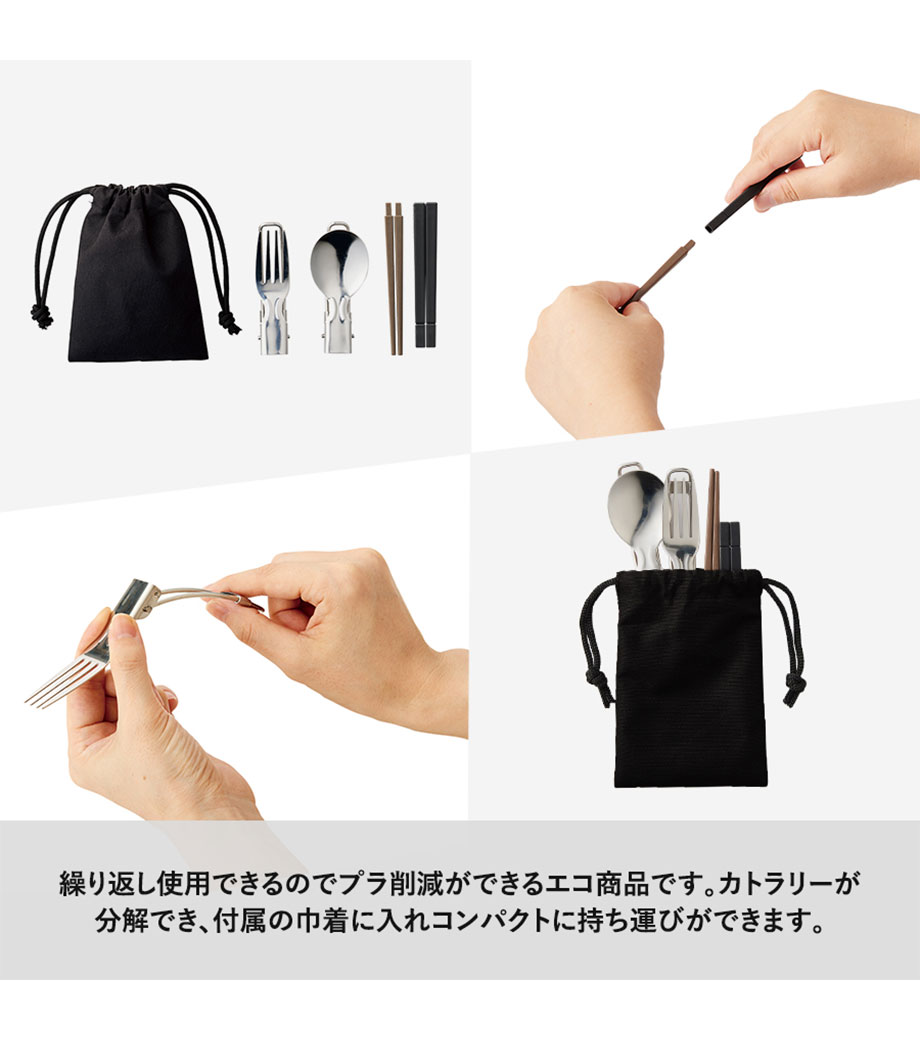 カトラリーセット ステンレスタイプ(3点)は、PP製の箸と丈夫で錆びにくいSUS304(18-8ステンレス)製のスプーン・フォークがセットになっています。長く使えるので、脱プラスチックやSDGsの取り組みに貢献できるエコグッズです。いずれもコンパクトに分解・折りたたみでき、付属の巾着にまとめて入れて持ち運べます。